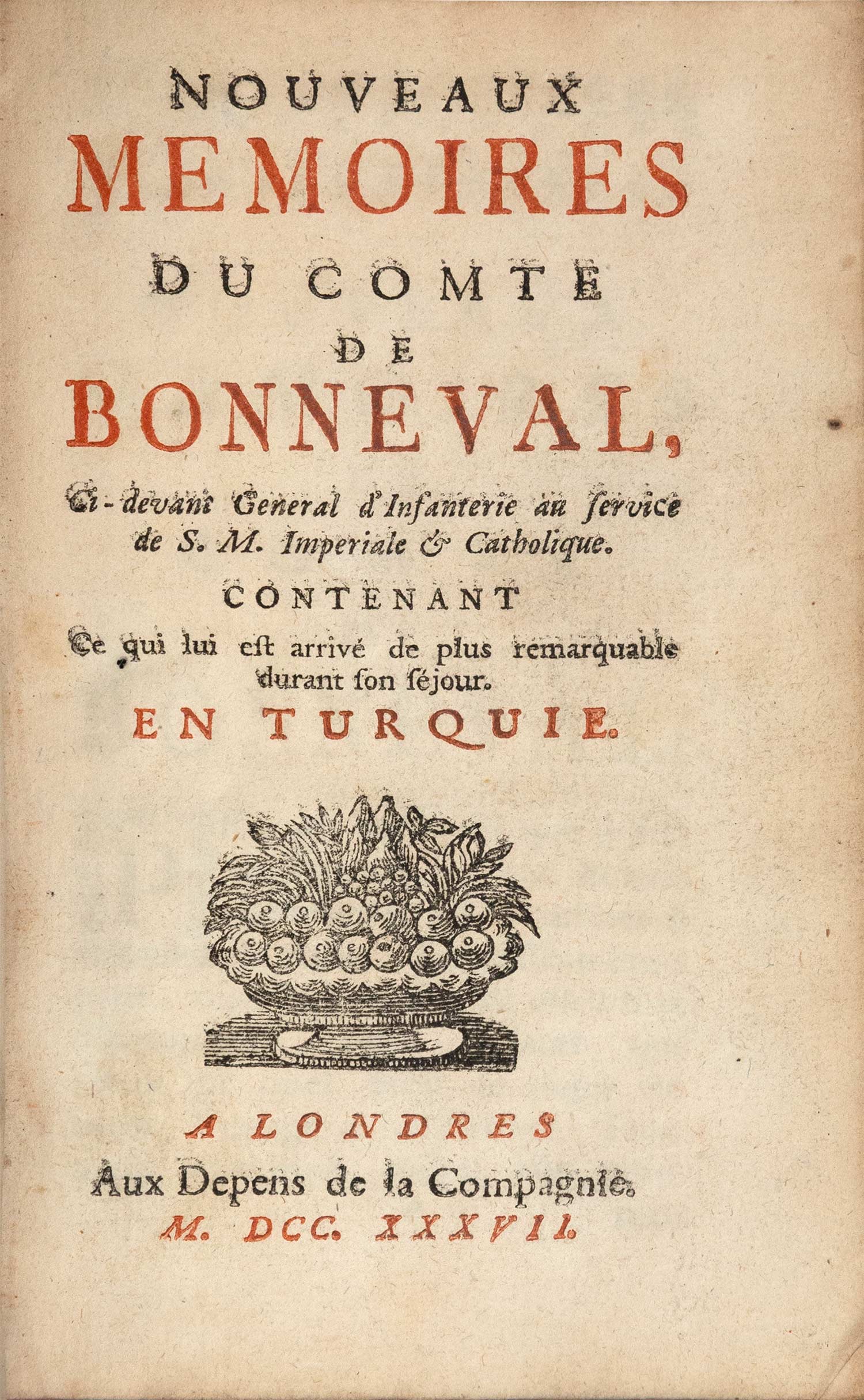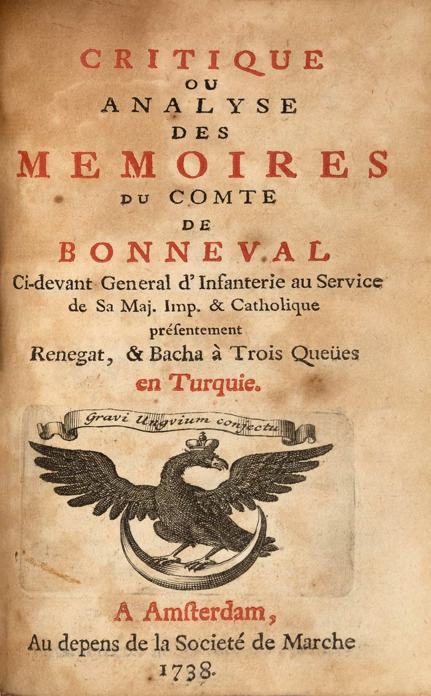 μικρό 8ο (155 x 90 mm.), 269 σ. Δίχρωμος και με ξυλόγραφη βινιέτα ο τίτλος. Δέρμα της εποχής της έκδοσης (μικρές φθορές, χρυσή διακόσμηση στη ράχη, μαρμαρογραφημένα τα ακρόφυλλα, κόκκινες οι ακμές, ex-libris Α. Δ. Χατζηδήμου). Πρβ. Blackmer 162, Atabey 129. [δεμένο μαζί:] MARCHE, Christian Gottfried. Critique ou analyse des mémoires du comte de Bonneval. Άμστερνταμ, Aux dépens de la Societé de Marche, 1738. • 2 μέρη, μικρό 8ο, [16] + 192 + 77 σ. (ελαφρά οξειδωμένο αντίτυπο). Δίχρωμος και με χαλκόγραφη βινιέτα ο γενικός τίτλος, επιμέρους τίτλος στο δεύτερο μέρος: «Réflexions sur la présente guerre contre les Turcs».