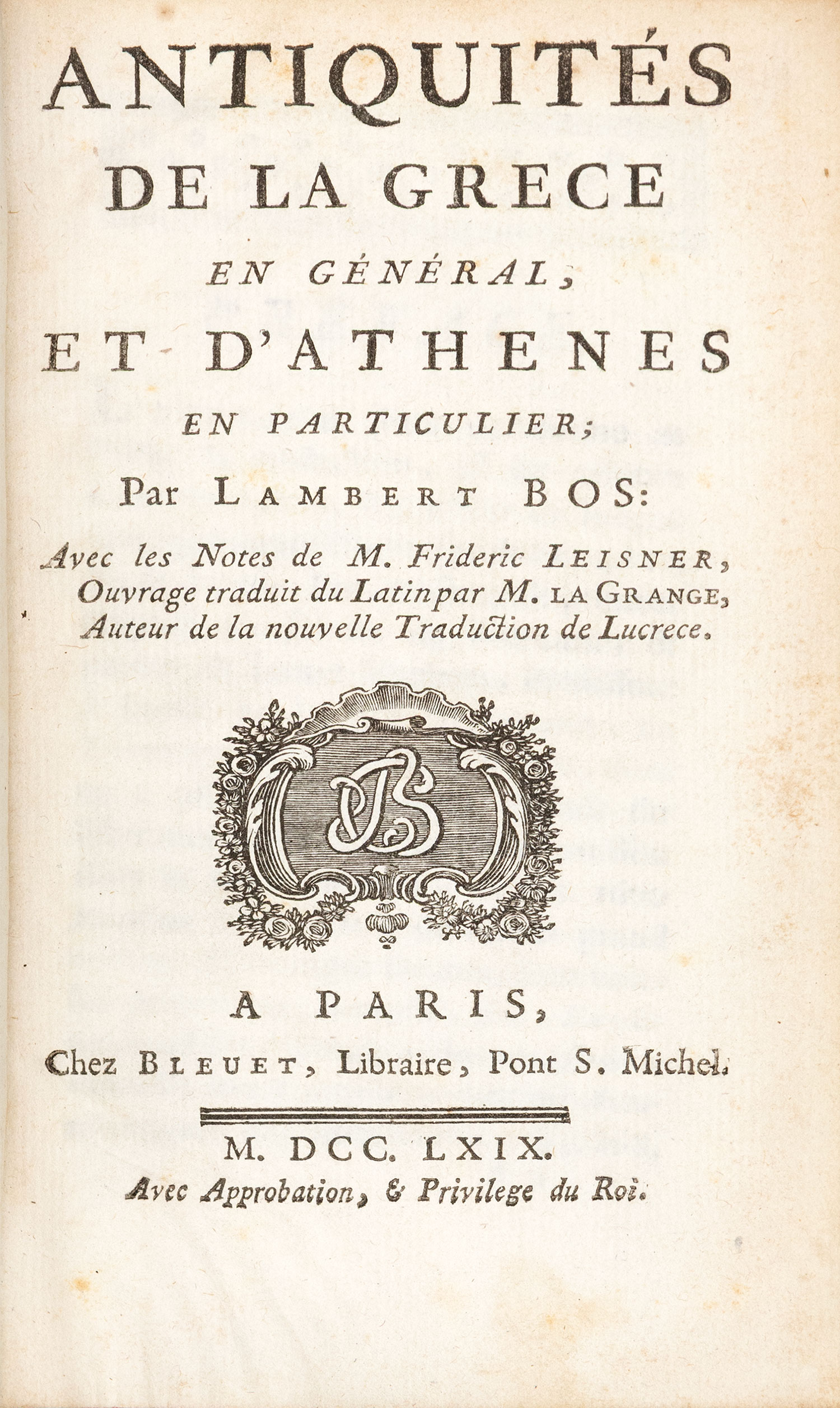 Πρώτη έκδοση στα γαλλικά, 12o (167 x 96 mm.), 375 σ. (ελαφρά οξειδωμένα λίγα φύλλα). Δισέλιδος κατάλογος του εκδότη στο τέλος. Δέρμα της εποχής της έκδοσης (μικρές φθορές, χρυσή διακόσμηση στη ράχη, μαρμαρογραφημένα τα ακρόφυλλα, κόκκινες οι ακμές, ex-libris Α. Δ. Χατζηδήμου). Blackmer 170.