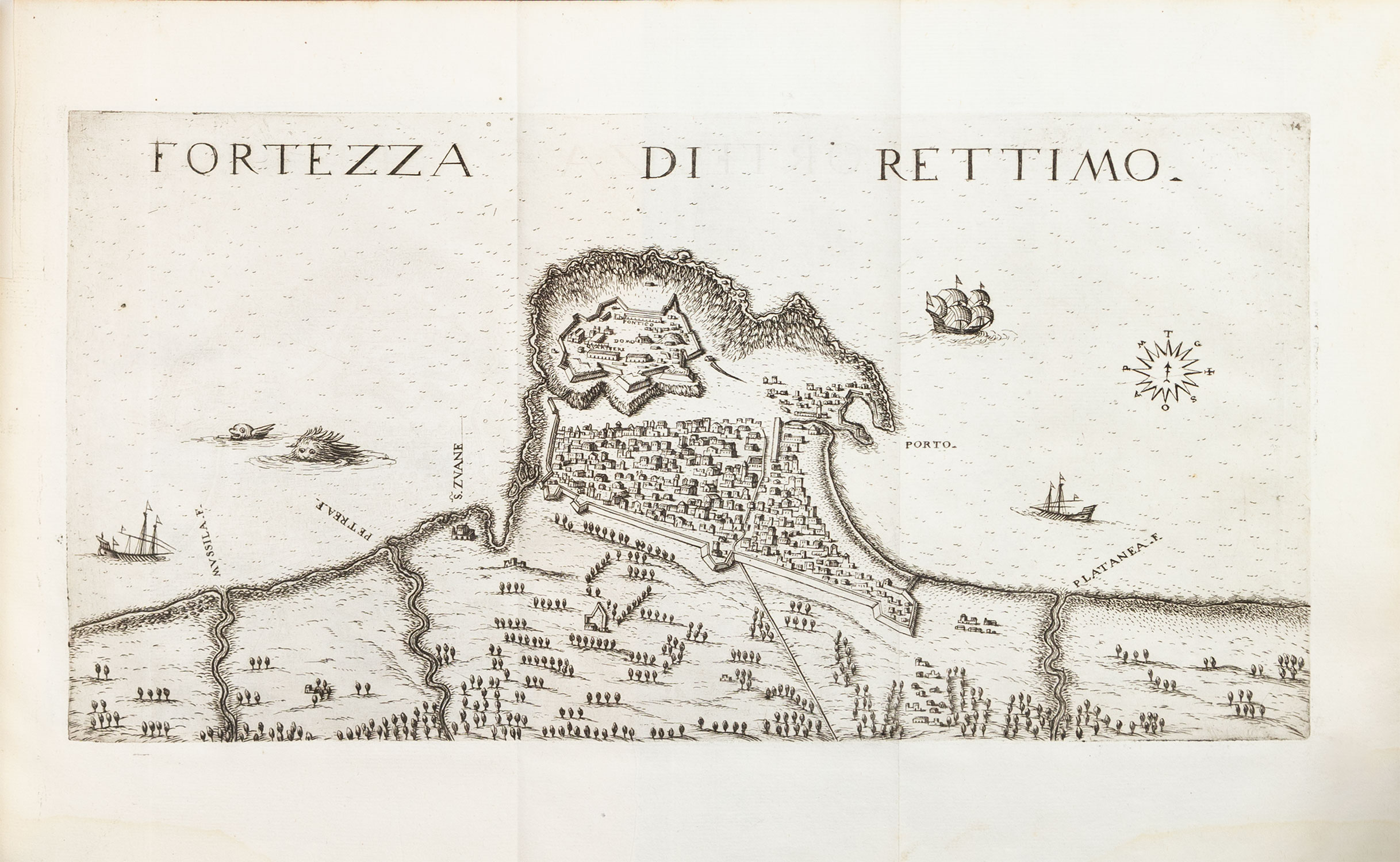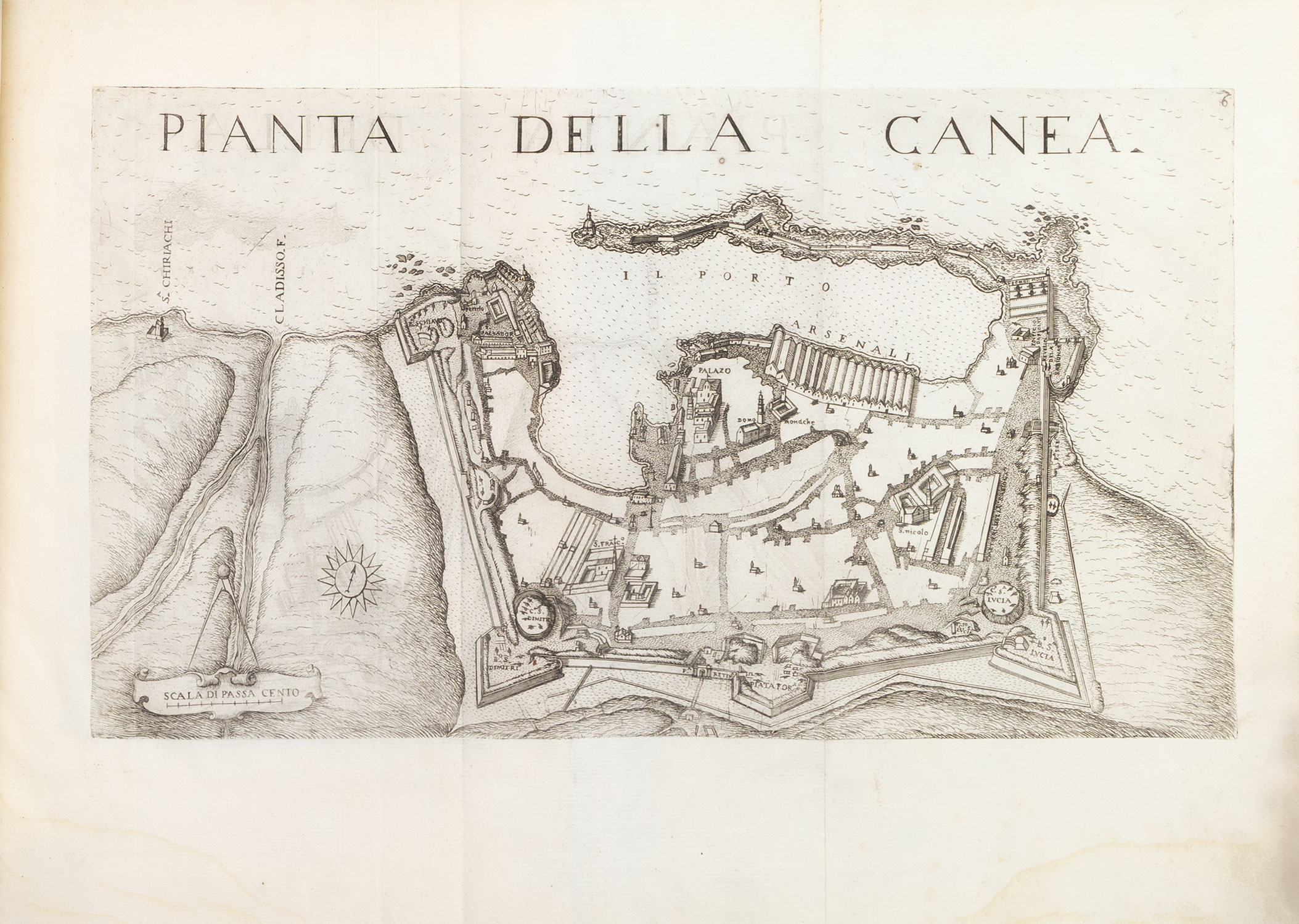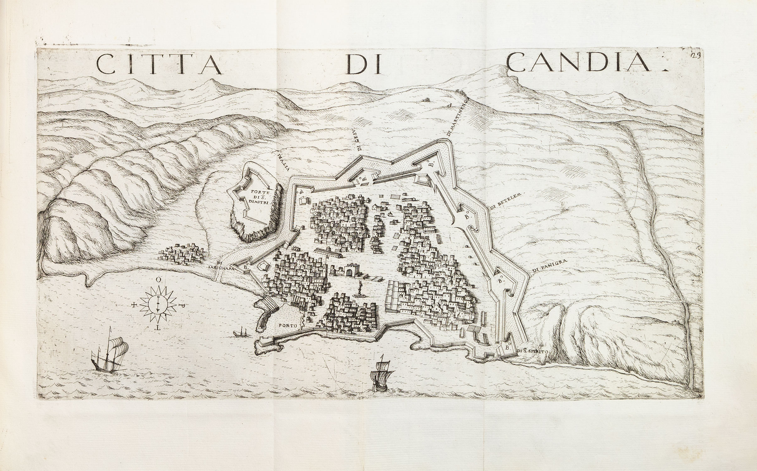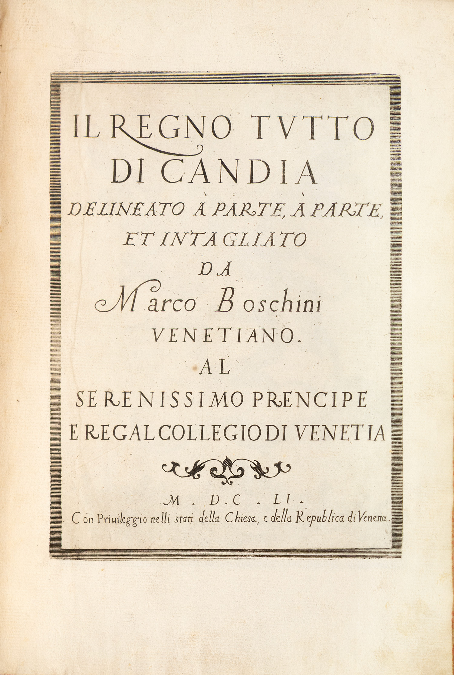 ΠΡΩΤΗ ΕΚΔΟΣΗ. μικρό folio (311 x 220 mm.). (αμυδρός λεκές από νερό στο κάτω περιθώριο μερικών χαλκογραφιών, επιδιορθωμένο σχίσιμο στην εσωτερική πλευρά και δύο μικρά σχισίματα στις τσακίσεις του αναδιπλούμενου πίνακα που αναφέρεται παρακάτω). Χαλκόγραφος τίτλος, αλληγορική χαλκογραφία στην αρχή (ο λέων του Αγίου Μάρκου πάνω από την Κρήτη), στοιχειοθετημένο φύλλο με αφιέρωση, 61 χαλκογραφίες (9 αναδιπλούμενες, περιλαμβάνεται η χαλκογραφία με τίτλο «Città di Candia assediata», που συχνά λείπει). Δέρμα της εποχής της έκδοσης (μικρές φθορές, λείπει μικρό τμήμα από την κορυφή και τη βάση της ράχης, χρυσή διακόσμηση στη ράχη, διάστικτες οι ακμές, ex-libris Filiberto Remigio Costa και Α. Δ. Χατζηδήμου). Atabey 136, Blackmer 171, Brunet, I, στ. 1123, Zacharakis 592-640, πρβ. Weber, II, 802 (η μορφή χωρίς χρονολογία).