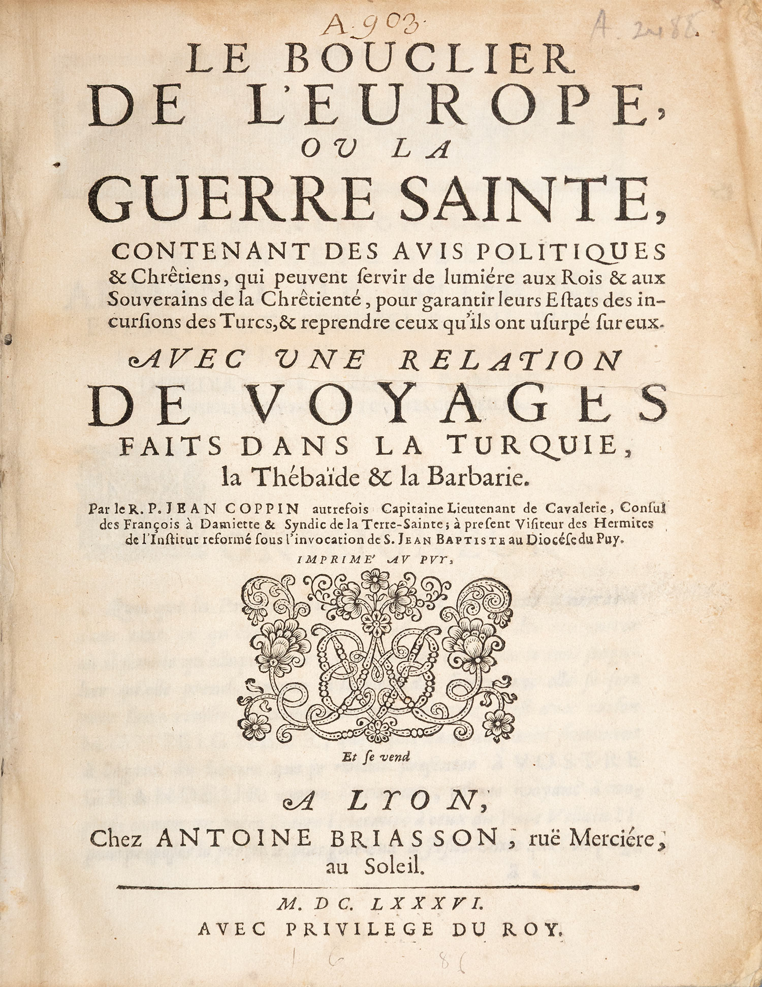 Le bouclier de l’Europe, ou La guerre sainte, contenant des avis politiques & chrêtiens, qui peuvent servir de lumiére aux rois & aux souverains de la Chrêtienté, pour garantir leurs estats des incursions des Turcs, & reprendre ceux qu'ils ont usurpé sur eux. Avec une relation de voyages faits dans la Turquie, la Thébaïde & la Barbarie.