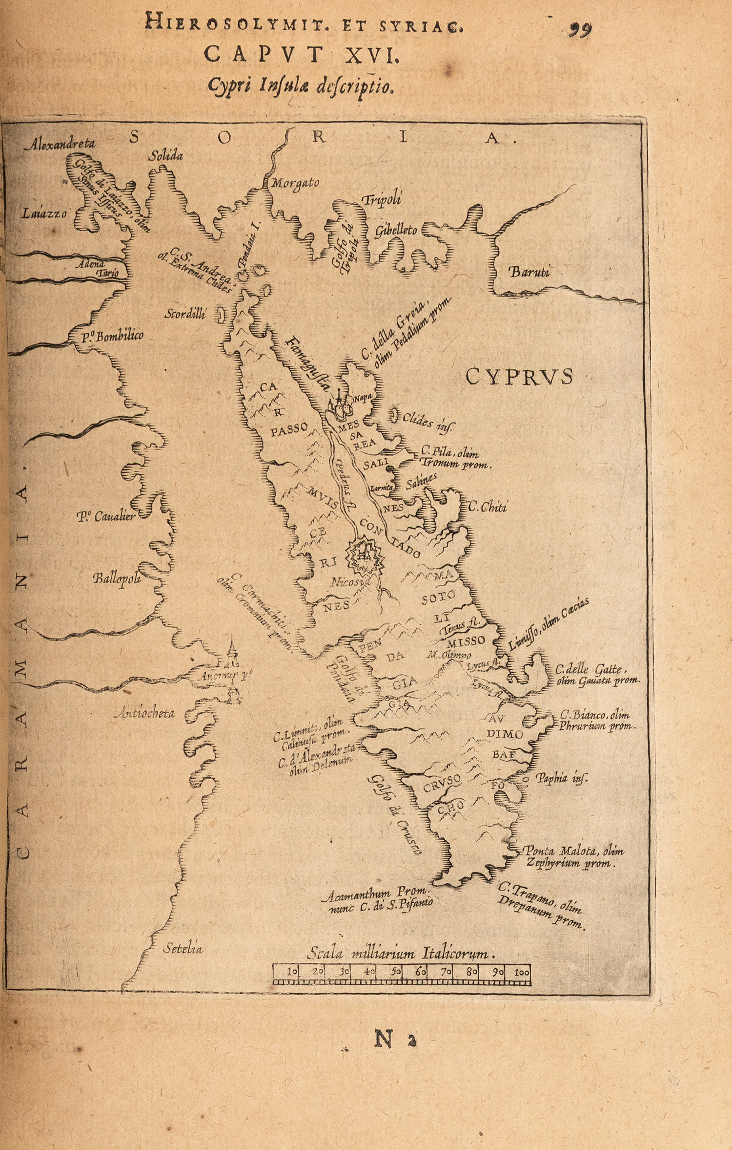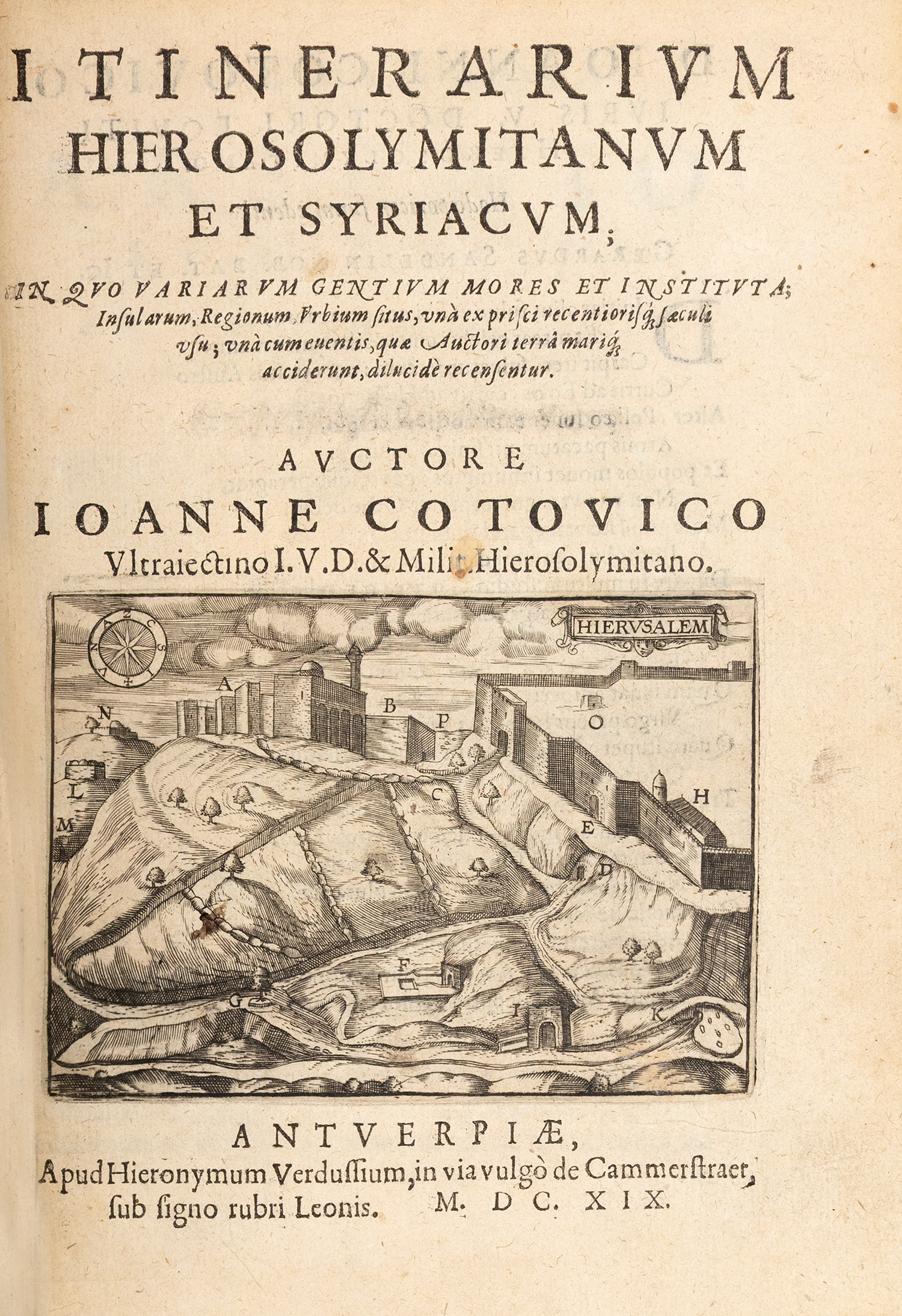 ΠΡΩΤΗ ΕΚΔΟΣΗ. 4ο (233 x 172 mm.), 518 σ. (λείπουν οι πέντε αναδιπλούμενοι στοιχειοθετημένοι πίνακες, λείπουν όπως και σε άλλα αντίτυπα το φ. †1 (elenchus) και το δεύτερο φύλλο παροραμάτων, ομοιόμορφη οξείδωση). Η μορφή με τη χαλκόγραφη άποψη των Ιεροσολύμων στον τίτλο, 3 χαλκογραφίες εκτός κειμένου, 57 χαλκογραφίες εντός κειμένου (9 ολοσέλιδες, 5 από τις οποίες χάρτες), ξυλόγραφα πρωτογράμματα. Μεταγενέστερο δέρμα (σχίσιμο στην πάνω ένωση, μικρές φθορές, χρυσή διακόσμηση στη ράχη, μαρμαρογραφημένα τα ακρόφυλλα, ex-libris Α. Δ. Χατζηδήμου). Blackmer 416, Röhricht 839, Brunet, II, στ. 331, Weber, II, 224, Ioannou σ. 108, Cobham & Jeffery σ. 13, Zacharakis 1253-8. • Ο συγγραφέας ταξίδεψε στην Παλαιστίνη και τη Συρία το 1598 κάνοντας ενδιάμεσους σταθμούς στην Κέρκυρα, τη Ζάκυνθο, την Κρήτη, τη Ρόδο και την Κύπρο.