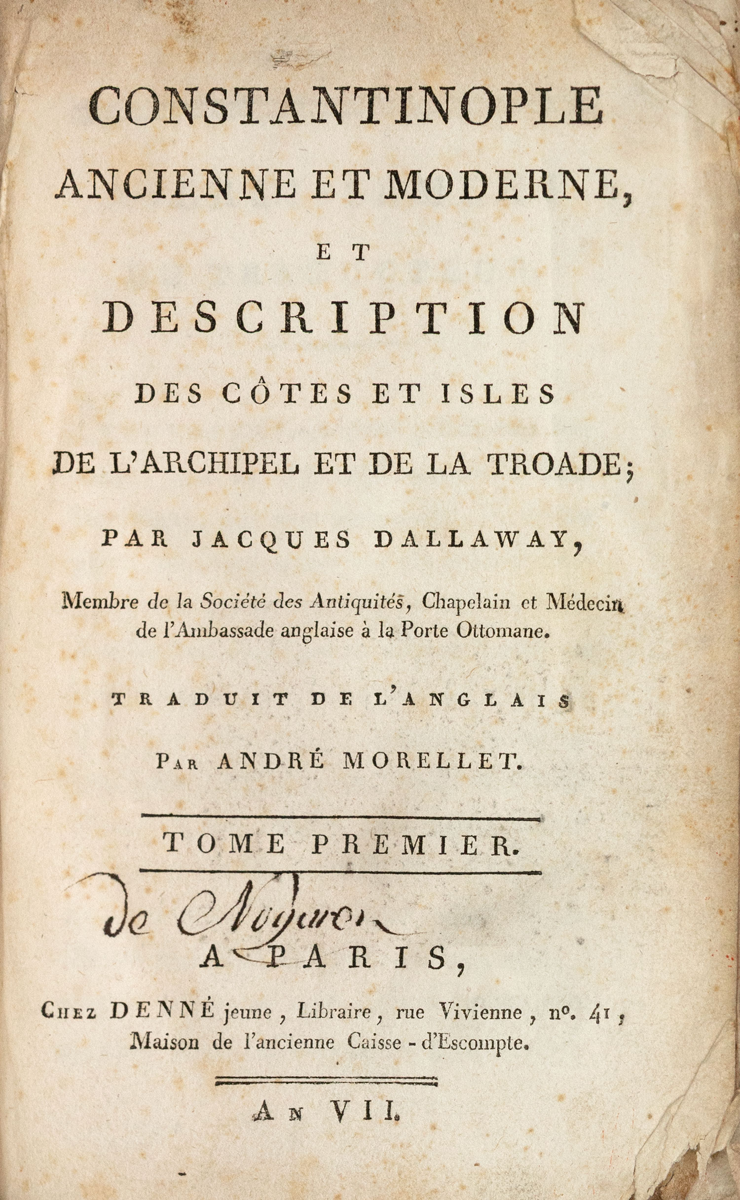 Constantinople ancienne et moderne, et description des côtes et isles de l’Archipel et de la Troade, traduit de l’anglais par André Morellet.