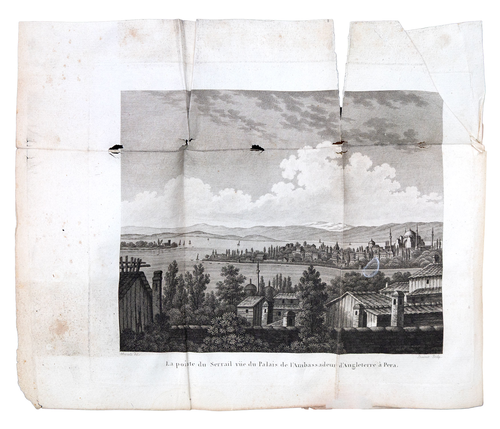 Πρώτη έκδοση στα γαλλικά, 2 τόμοι, 8ο, viij + 371 και 292 σ. (λείπει ο ένας αναδιπλούμενος πίνακας (τοπογραφικό), λείπουν δώδεκα φύλλα του Α΄ τόμου: σ. 227-238 και 323-334, φθορές στον ψευδότιτλο και τα πρώτα φύλλα του, μικρές τρύπες από έντομο στο εσωτερικό περιθώριο του τεύχους 19 στον ίδιο τόμο, λεκέδες από νερό στον Β΄ τόμο). Με 2 αναδιπλούμενες χαλκογραφίες (απόψεις, σχίσιμο και μικρές φθορές στην πρώτη, κομμένο το πάνω περιθώριο της δεύτερης), και έναν αναδιπλούμενο στοιχειοθετημένο πίνακα (κομμένο το κάτω περιθώριό του). Δέρμα της εποχής της έκδοσης (φθορές, ex-libris Α. Δ. Χατζηδήμου). Atabey 309, Contominas 183. (2)