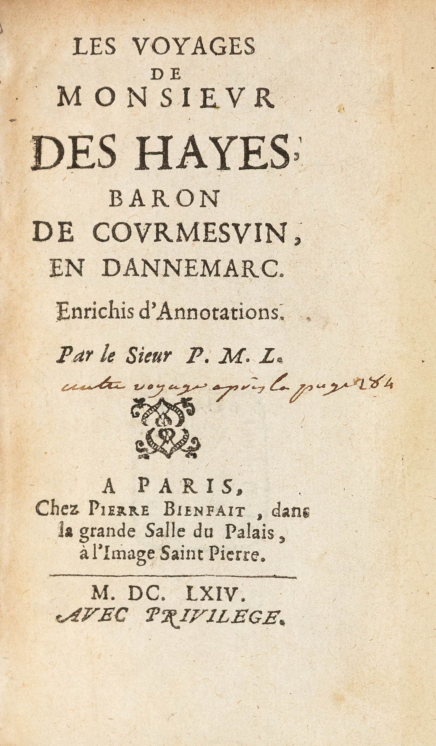 Les voyages de Monsieur Des Hayes, Baron de Courmesuin, en Dannemarc. Enrichis d'annotations. Par le Sieur P[rome]. M[archand]. L[ibraire].