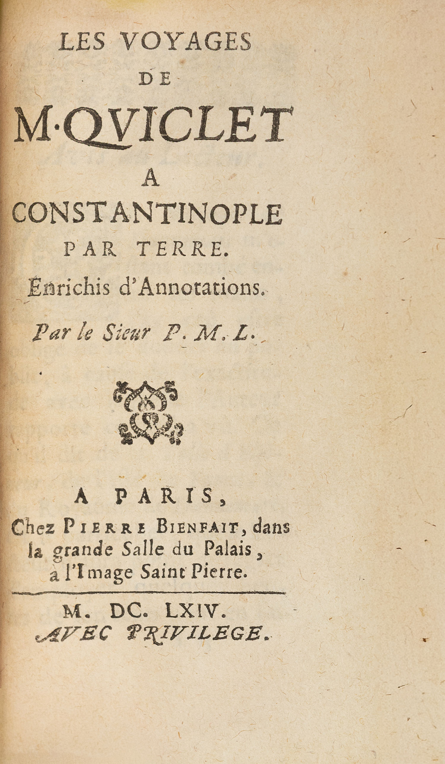 ΠΡΩΤΗ ΕΚΔΟΣΗ. 12o (146 x 79 mm.), 184 [= 284] σ. (τα «Avis au lecteur» και «Extraict du privilege du Roy» του παρόντος έργου και αυτού που είναι δεμένο μαζί, δεμένα τα μεν στη θέση των δε). Δέρμα της εποχής της έκδοσης (φθορές, χρυσή διακόσμηση στη ράχη, διάστικτες οι ακμές, ex-libris Α. Δ. Χατζηδήμου). Brunet, II, στ. 626 («à ce voyage est ordinairement joint celui de Quiclet à Constantinople»). [δεμένο μαζί, του ιδίου:] Les voyages de M. Quiclet à Constantinople par terre. Enrichis d’annotations. Par le Sieur P. M. L. Παρίσι, Pierre Bienfait, 1664. • ΠΡΩΤΗ ΕΚΔΟΣΗ. 12o, 246 σ. Blackmer 1360, Atabey 1003, Weber, II, 317, πρβ. Brunet, II, στ. 626.