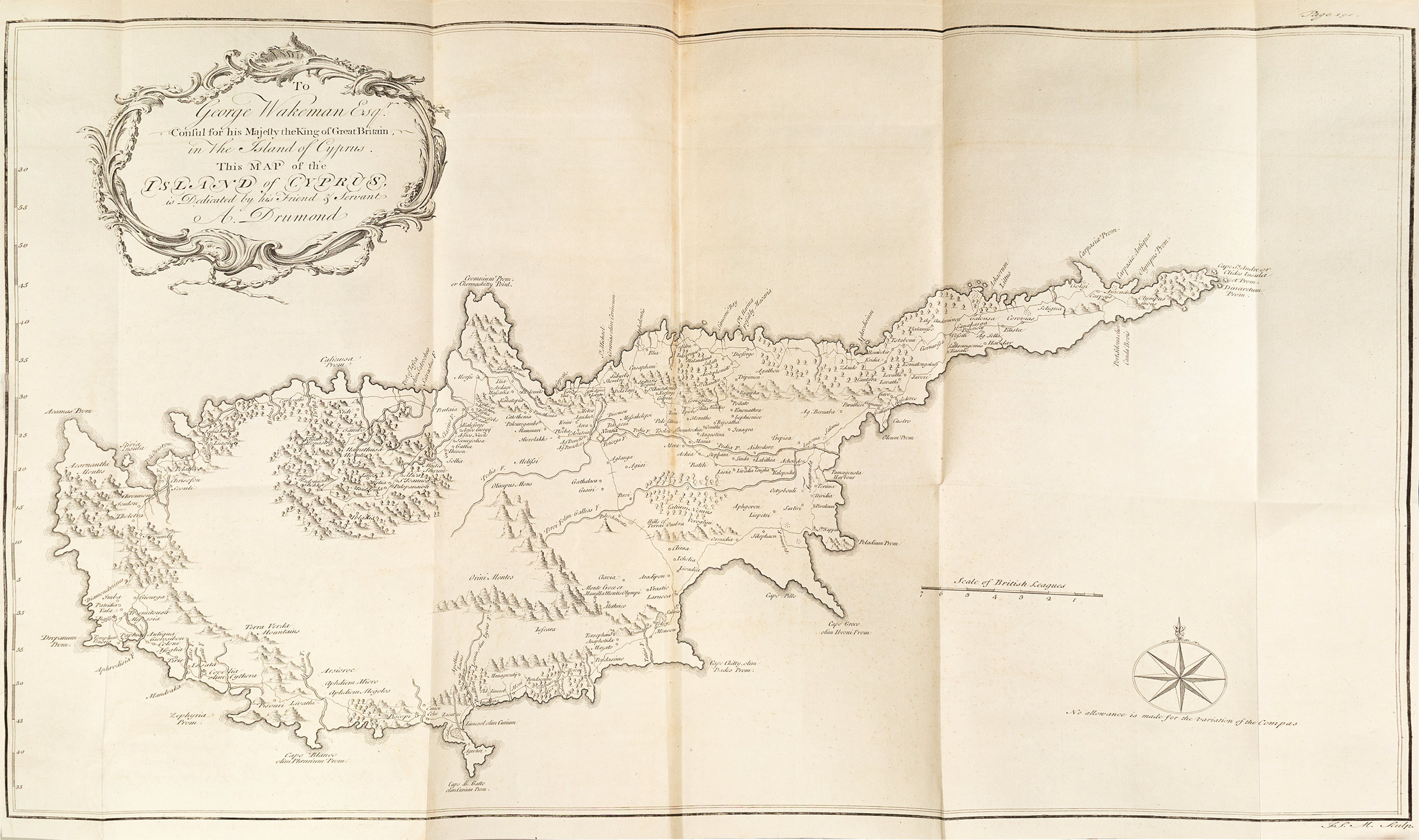 ΠΡΩΤΗ ΕΚΔΟΣΗ. folio (362 x 235 mm), 311 σ. (μικρό σχίσιμο στην εσωτερική πλευρά δύο πινάκων, σχίσιμο σε δύο φύλλα: σ. 23-4 και 97-8, λυμένο το πρώτο (λευκό) φύλλο, ελαφρά οξειδωμένα μερικά φύλλα). Αναδιπλούμενη χαλκογραφία σε θέση προμετωπίδας και 34 χαλκόγραφοι πίνακες (7 αναδιπλούμενοι, ανάμεσά τους μεγάλος χάρτης της Κύπρου), ξυλογραφία με το ελληνικό αλφάβητο εντός κειμένου. Δέρμα της εποχής της έκδοσης (σχισμένη η πάνω ένωση, μικρά σχισίματα στην κάτω, φθορές, χρυσή διακόσμηση στη ράχη, διάστικτες οι ακμές, ex-libris Thomas Munro και Α. Δ. Χατζηδήμου). Blackmer 497, Atabey 363, Weber, II, 524, Ioannou σ. 142-3, Chatzipanagioti 293, Cobham & Jeffery σ. 16, Contominas 221, Zacharakis 1416.