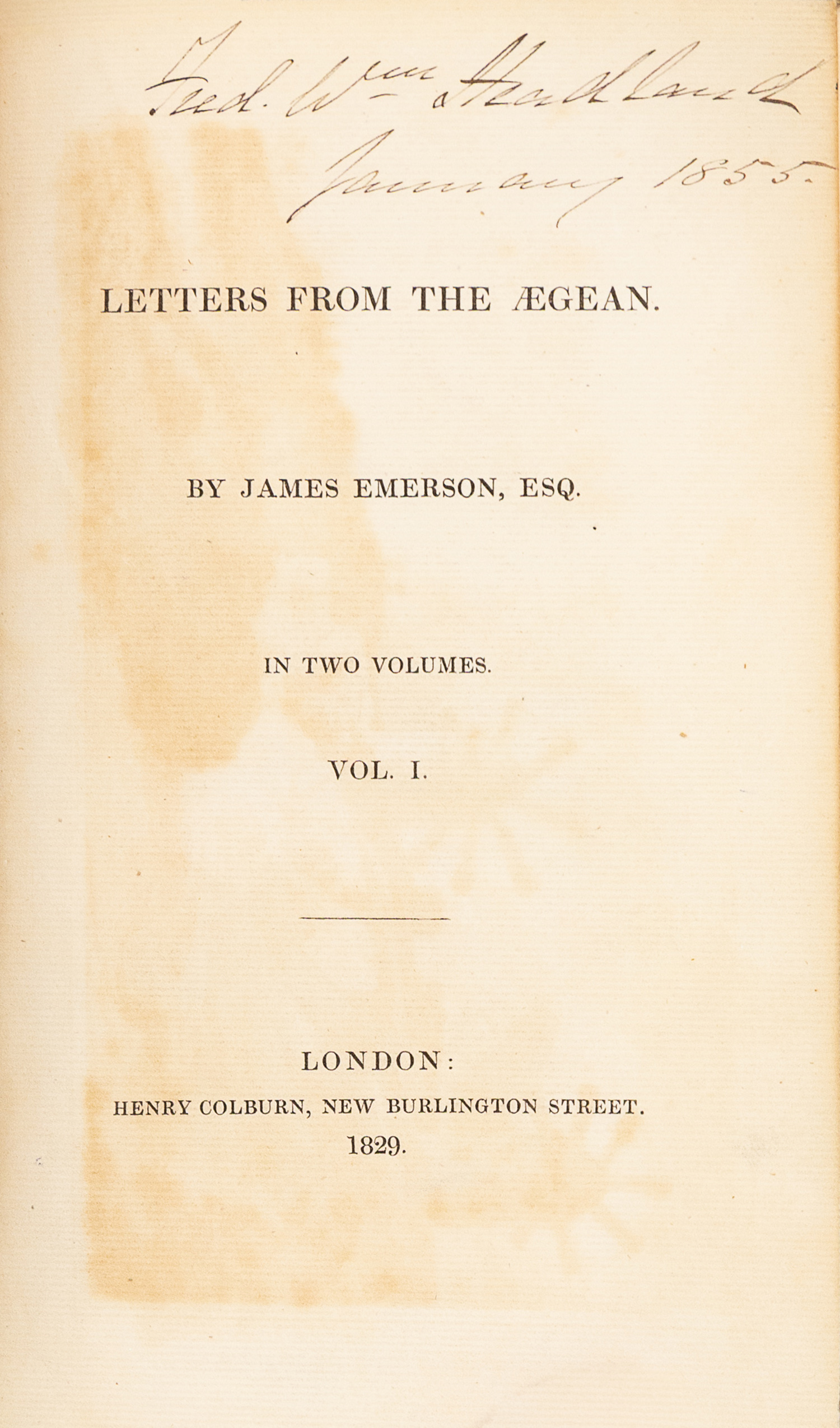ΠΡΩΤΗ ΕΚΔΟΣΗ. 2 τόμοι δεμένοι σε έναν, 8ο (197 x 122 mm.), xv + 244 και viii + 266 σ. (λείπει ο ψευδότιτλος του Α΄ τόμου, αχνό αποτύπωμα της προμετωπίδας στον τίτλο και του χάρτη στον εαυτό του). Με μία ακουατίντα σε θέση προμετωπίδας και έναν αναδιπλούμενο χαλκόγραφο χάρτη. Πανί της εποχής της έκδοσης (σχίσιμο στην πάνω ένωση, χαλαρωμένη η πάνω σύνδεση, ξεθωριασμένη η ράχη, εμπίεστη διακόσμηση στα καλύμματα). Blackmer 550, Atabey 397, Weber, I, 172, Droulia 2585-6, Λαγανάς 911.
