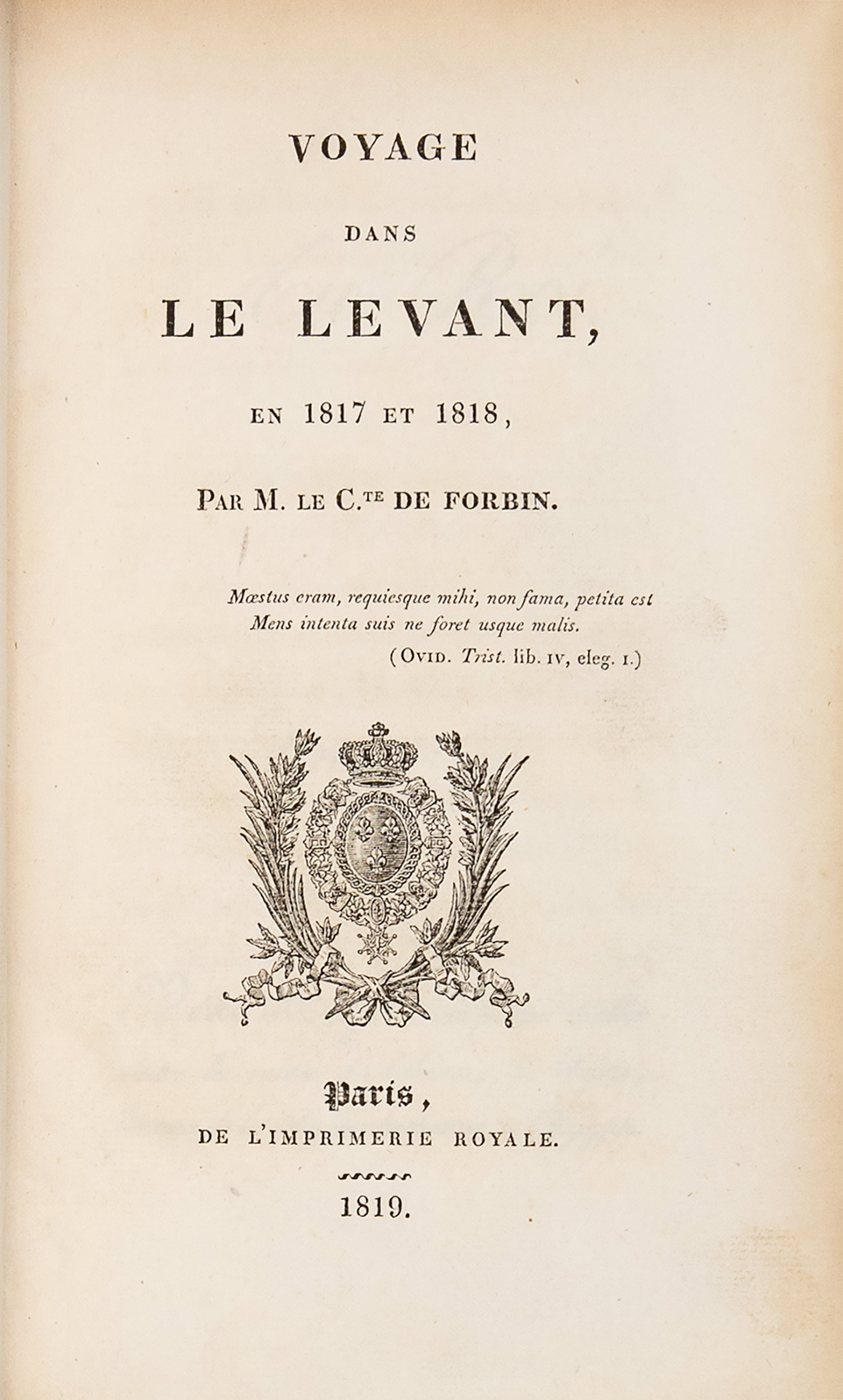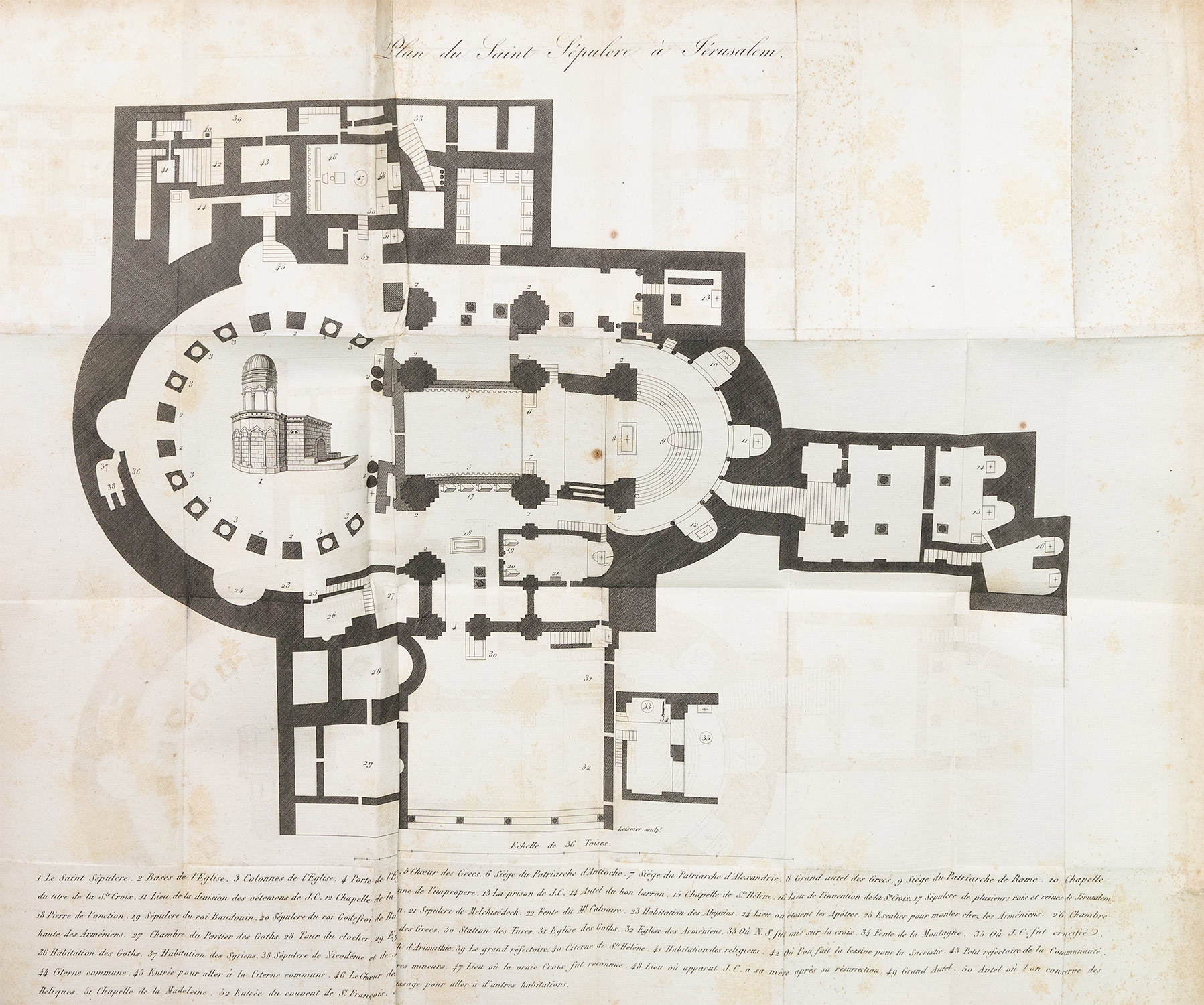 Δεύτερη έκδοση του κειμένου (πρώτη σε 8ο), 8ο (207 x 131 mm.), 460 σ. (οξειδωμένη η κάτοψη). Με μία αναδιπλούμενη κάτοψη στο τέλος. Δερμάτινη ράχη της εποχής της έκδοσης (μικρές φθορές, χρυσή διακόσμηση στη ράχη, ex-libris Α. Δ. Χατζηδήμου). Weber, I, 68, πρβ. Blackmer 614.