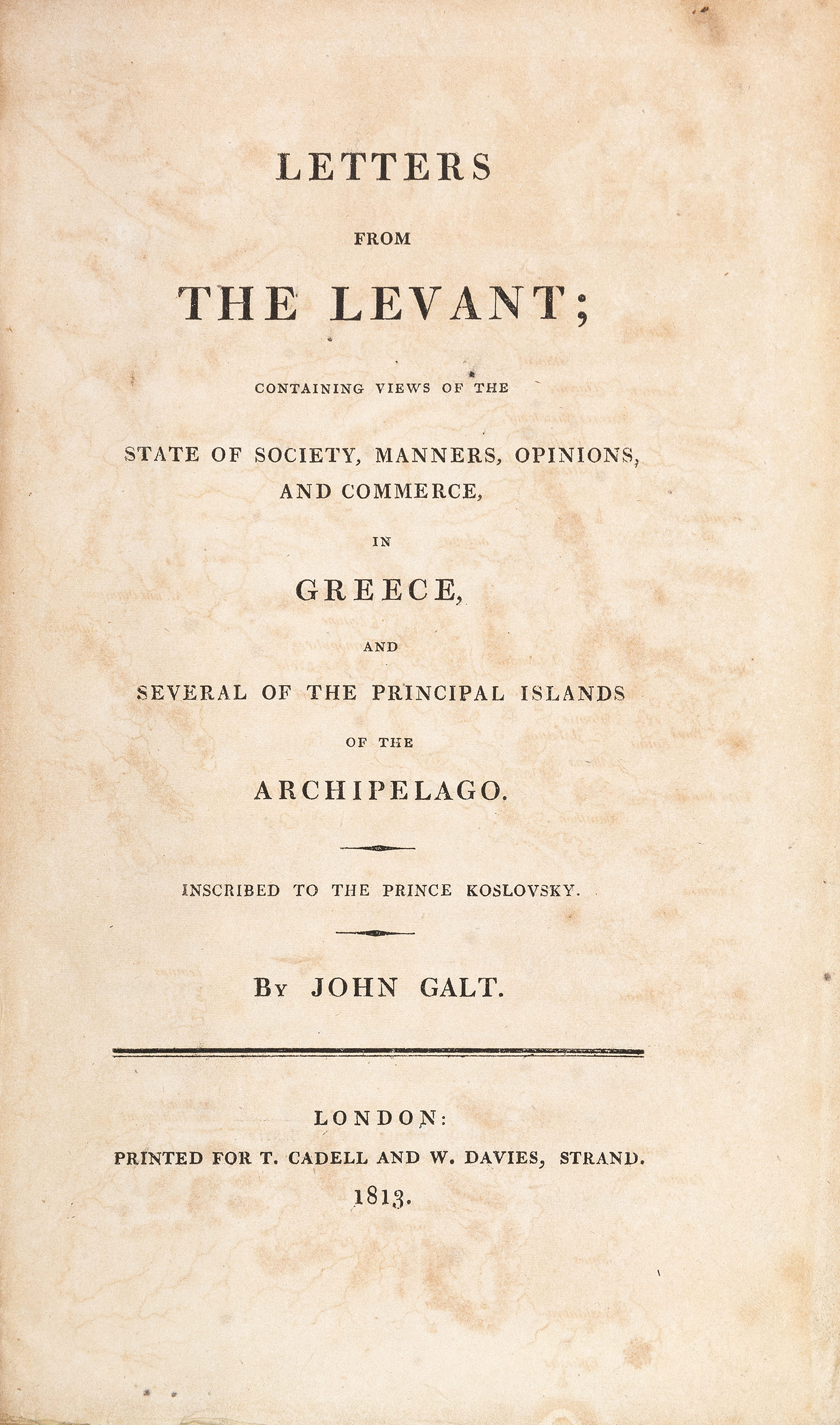 ΠΡΩΤΗ ΕΚΔΟΣΗ. 8ο (230 x 140 mm.), xv + 386 σ. (λυμένα δύο φύλλα: σ. 197-8 και 349-50, ελαφρά οξειδωμένα μερικά φύλλα, αχνό αποτύπωμα του χάρτη στον τίτλο). Με έναν χαλκόγραφο χάρτη σε θέση προμετωπίδας. Χαρτόνια της εποχής της έκδοσης (φθορές, σχισμένη η πάνω ένωση, δύο μικρότερα σχισίματα στην κάτω, αξάκριστο, ex-libris Α. Δ. Χατζηδήμου). Blackmer 645, Atabey 474, Weber, I, 32, Contominas 274. • Τα γράμματα του Galt περιέχουν αρκετές αναφορές στον Byron, με τον οποίο συνταξίδεψαν από το Γιβραλτάρ ως τη Μάλτα και αργότερα συναντήθηκαν ξανά στην Αθήνα.