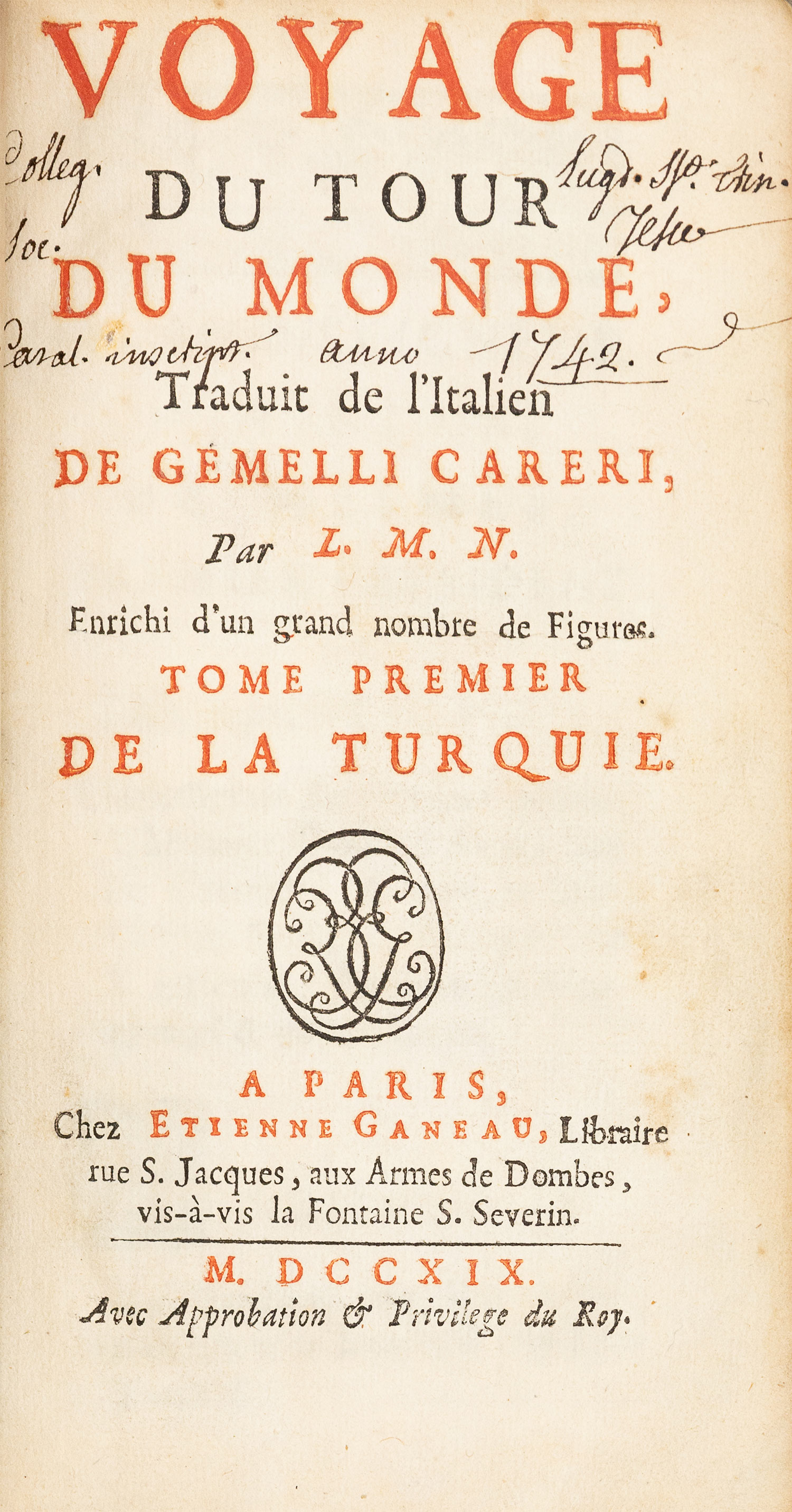 ο τόμος Α΄ (από τους 6), 12ο (162 x 95 mm.), xxiv + 454 σ. (επιδιορθωμένα σχισίματα στον αναδιπλούμενο πίνακα, ήπια οξείδωση σε αρκετά φύλλα, αχνός λεκές από νερό σε λίγα φύλλα). Χαλκόγραφος επιπρόσθετος τίτλος, δίχρωμος ο τίτλος, χαλκόγραφο πορτραίτο του συγγραφέα εκτός κειμένου, με έναν αναδιπλούμενο και 3 ολοσέλιδους χαλκόγραφους πίνακες. Δέρμα της εποχής της έκδοσης (φθορές, λείπουν μικρά τμήματα από την κορυφή και τη βάση της ράχης, διάστικτες οι ακμές, ex-libris Α. Δ. Χατζηδήμου). Brunet, II, στ. 1525.