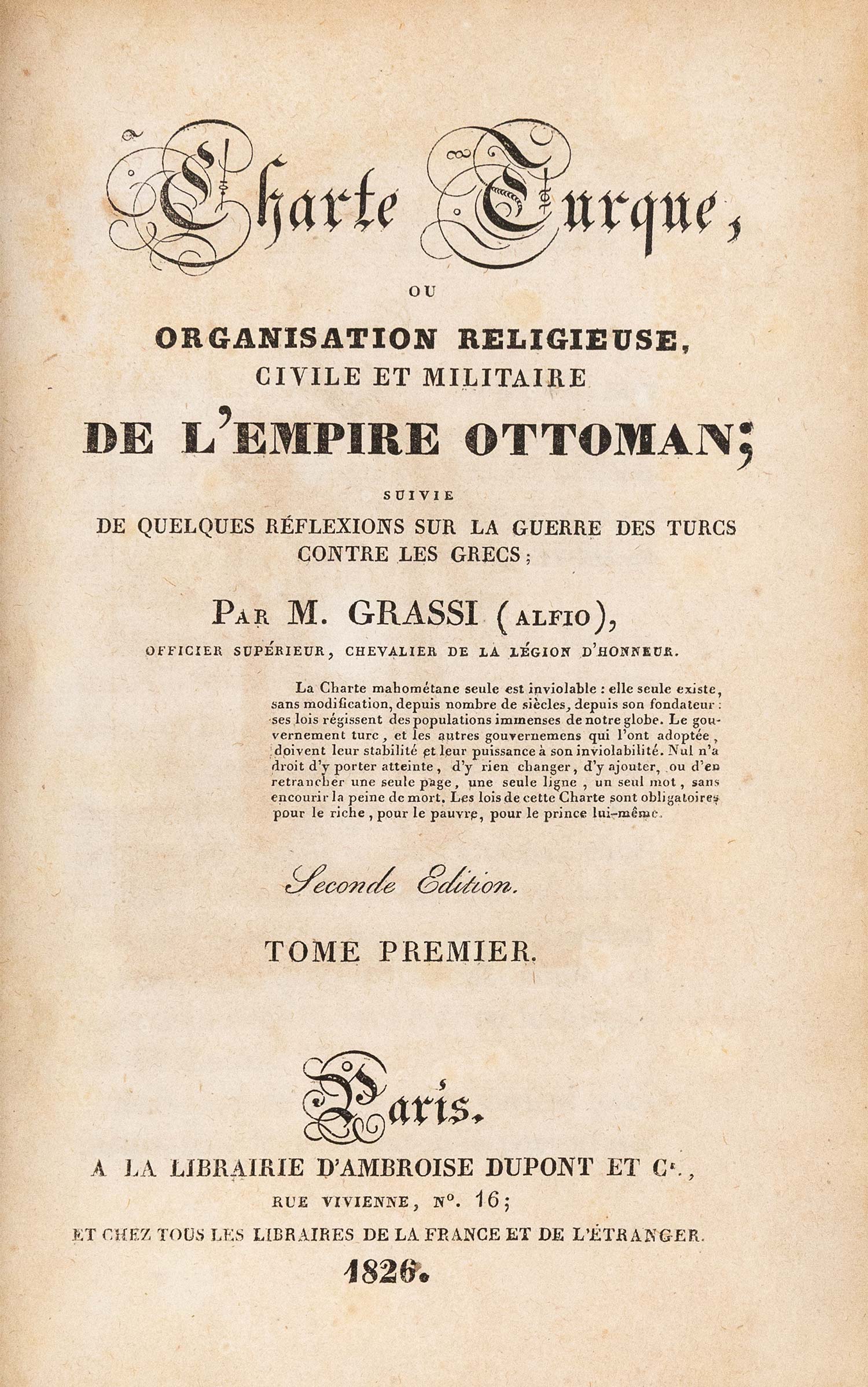 Charte turque, ou organisation religieuse, civile et militaire de l’Empire Ottoman, suivi de quelques réflexions sur la guerre des Turcs contre les Grecs, seconde édition.