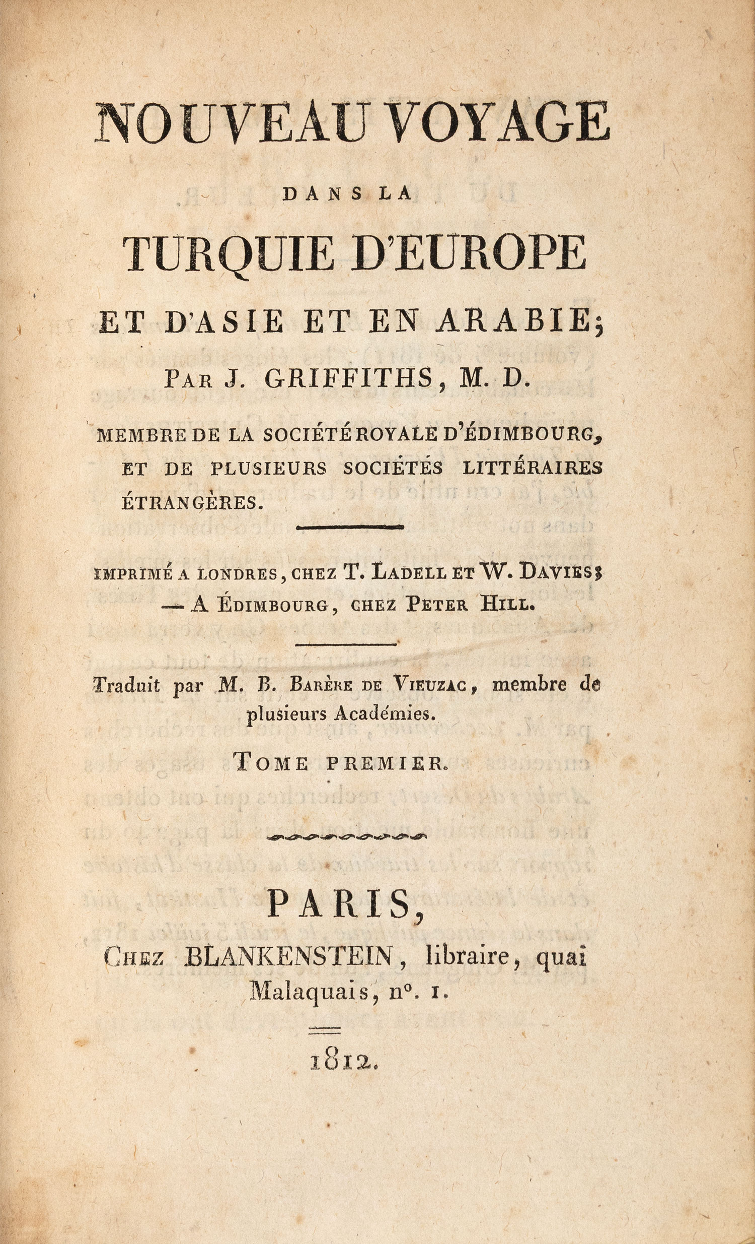 Πρώτη έκδοση στα γαλλικά, 2 τόμοι δεμένοι σε έναν, 8o (195 x 128 mm.), xiv + 213 και 229 σ. (λείπει το τεύχος 4 του Α΄ τόμου: σ. 49-64, σε λάθος θέση δεμένα δύο φύλλα του ίδιου τόμου: σ. [211]-[214], ελαφρά οξειδωμένο αντίτυπο). Μεταγενέστερη δερμάτινη ράχη (λείπει η ράχη, κίτρινες οι ακμές, ex-libris Α. Δ. Χατζηδήμου). Atabey 531.