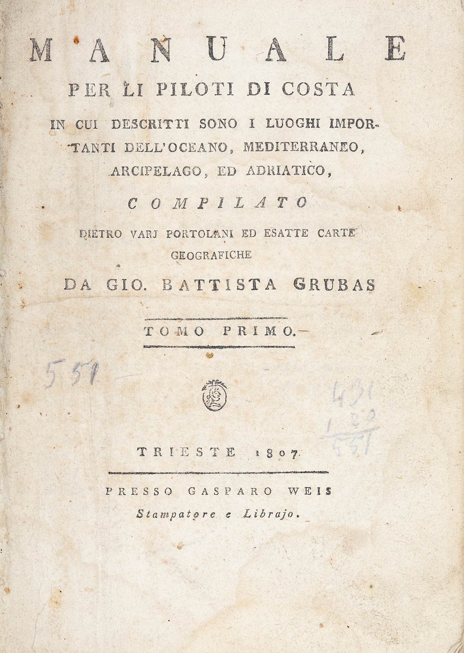 Manuale per li piloti di costa in cui descritti sono i luoghi importanti dell'Oceano, Mediterraneo, Arcipelago, ed Adriatico, compilato dietro varj portolani ed esatte carte geografiche.