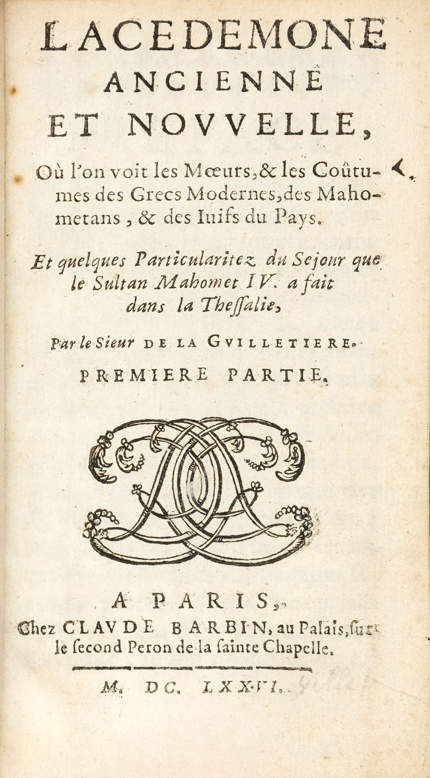 Lacedemone ancienne et nouvelle, où l'on voit les mœurs, & les coûtumes des Grecs modernes, des Mahometans, & des Juifs du pays. Et quelques particularitez du sejour que le Sultan Mahomet IV. a fait dans la Thessalie.