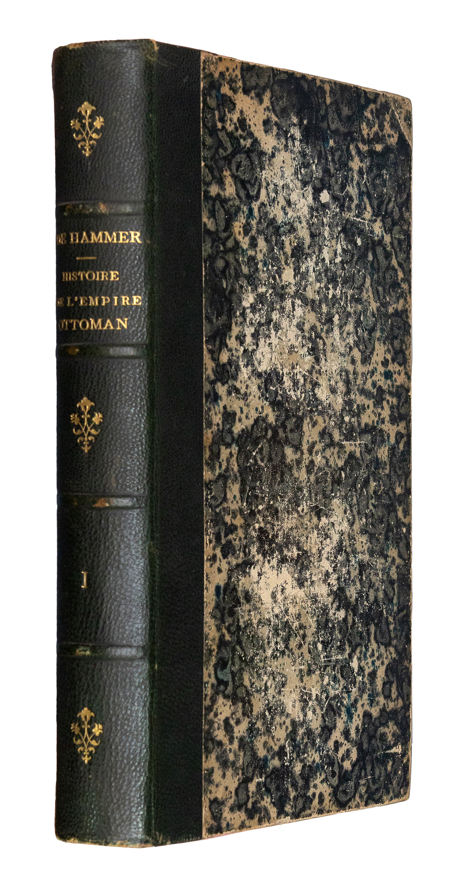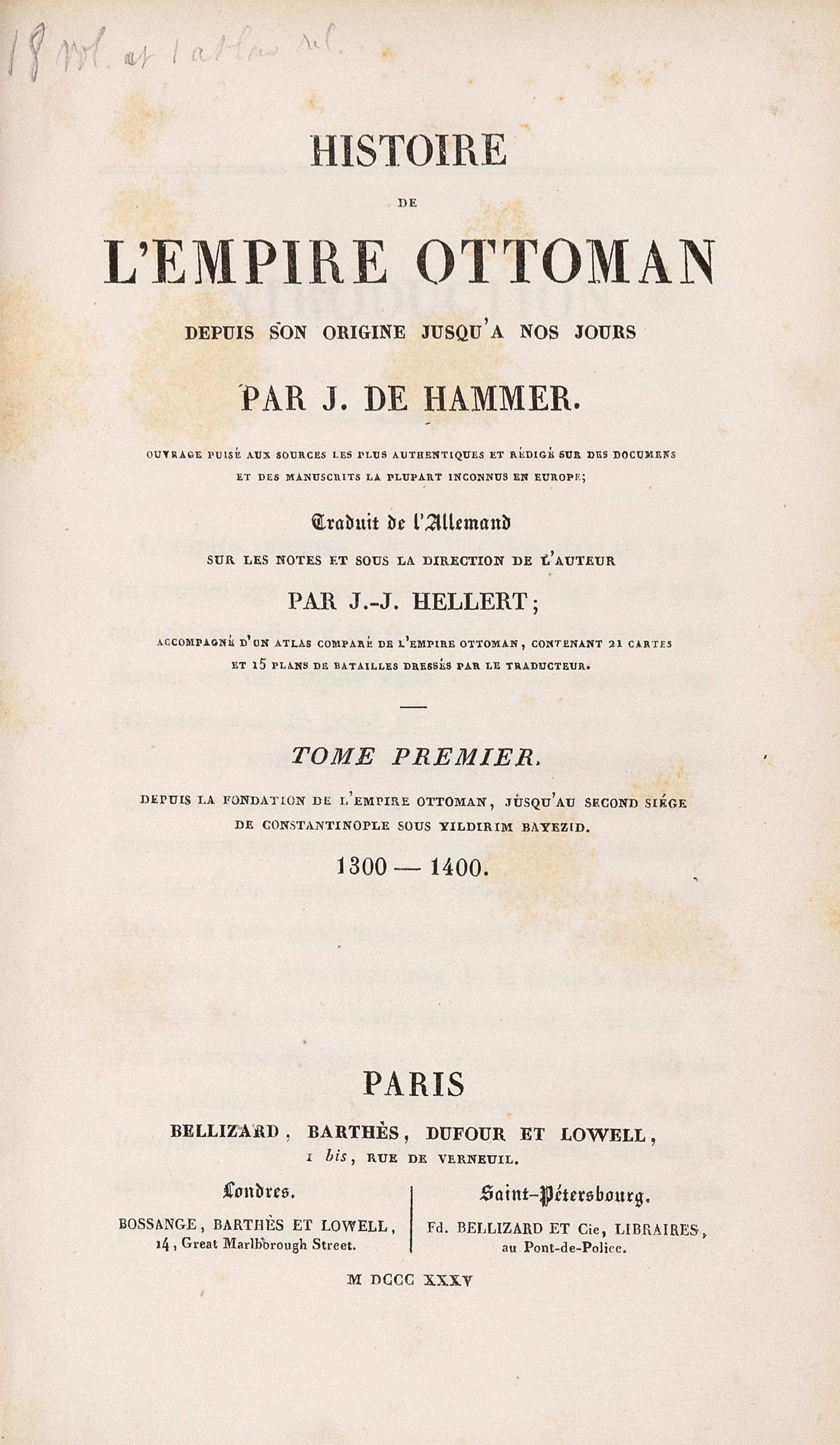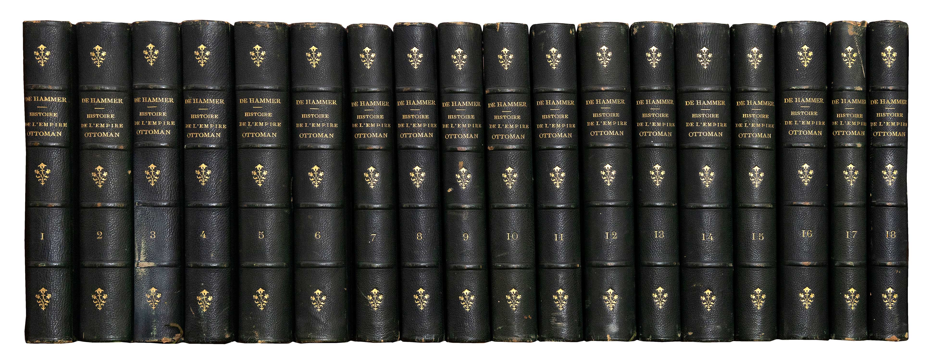 Πρώτη έκδοση στα γαλλικά, 18 τόμοι, 8o (206 x 131 mm.), XXXV + 436, 530, VIII + 460, 476, VII + 558, 536, VIII + 439, 435, VII + 424, 495, IV + 491, 554, IV + 391, 543, 405, 507, XLVIII + 294, 398 σ. (μικρό σχίσιμο στην εσωτερική πλευρά τριών πινάκων). Με 6 αναδιπλούμενους στοιχειοθετημένους γενεαλογικούς πίνακες. Μεταγενέστερη δερμάτινη ράχη (μικρές φθορές, χρυσή διακόσμηση στη ράχη, ex-libris Α. Δ. Χατζηδήμου). Atabey 557, Brunet, III, στ. 32. (18)