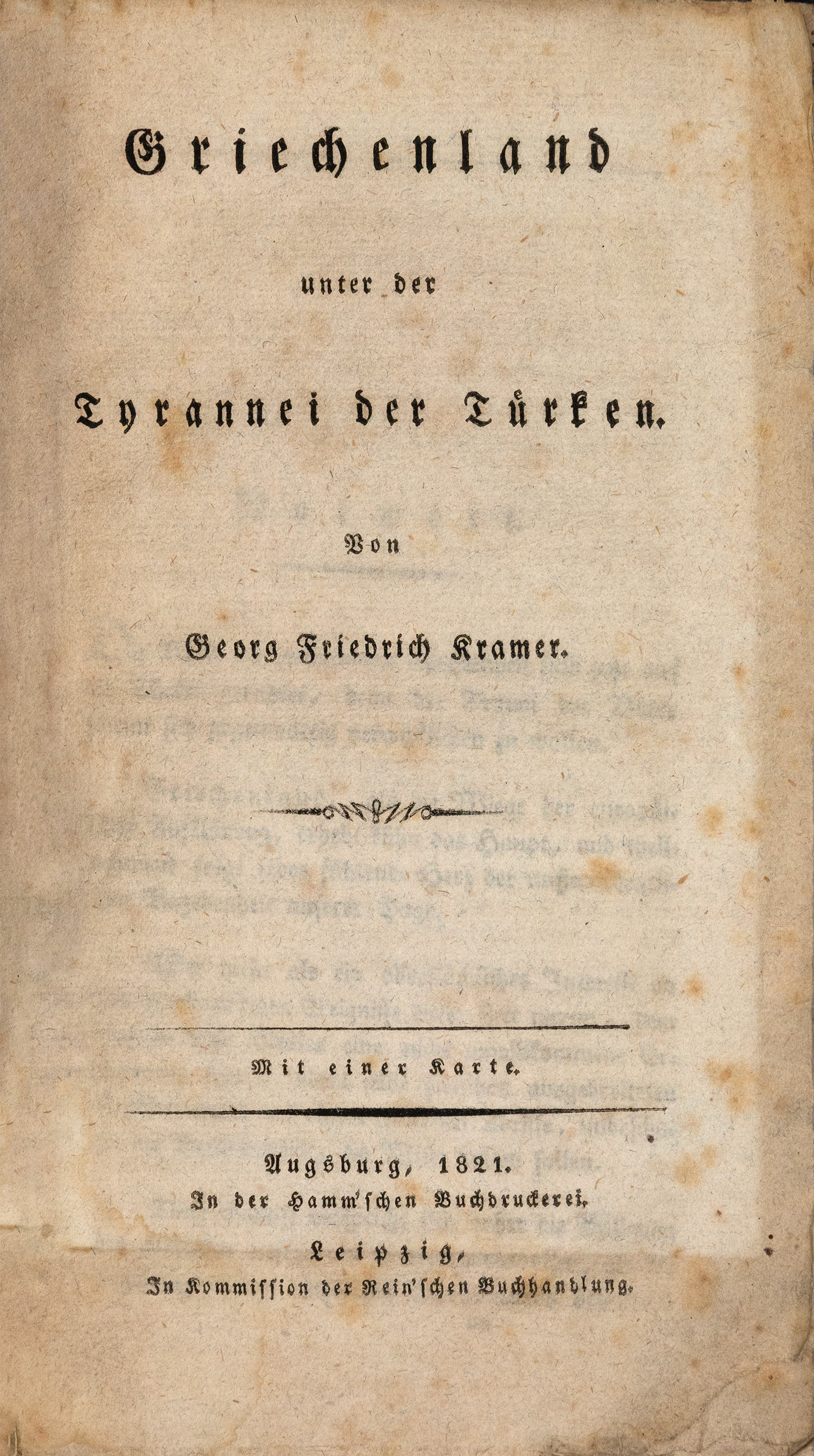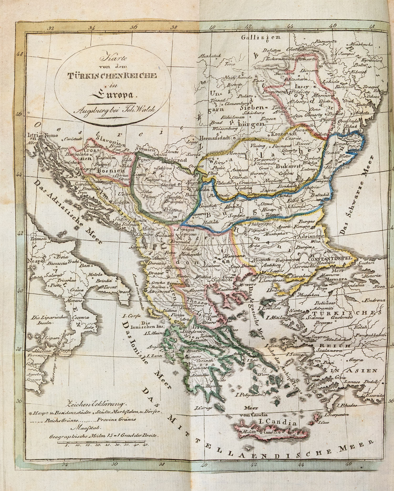 ΠΡΩΤΗ ΕΚΔΟΣΗ. 8ο (206 x 118 mm.), IV + 92 σ. (οξειδωμένο αντίτυπο, σχίσιμο στο εξωτερικό περιθώριο ενός φύλλου: σ. 1-2). Με έναν αναδιπλούμενο χαλκόγραφο χάρτη («Karte von dem Türkischen Reiche in Europa»), τα περιγράμματα επιχρωματισμένα με το χέρι. Αρχικά τυπωμένα εξώφυλλα (λείπει τμήμα από την κάτω εξωτερική γωνία του πάνω, οξείδωση, αχνός λεκές από νερό, ex-libris Α. Δ. Χατζηδήμου). Droulia 83.