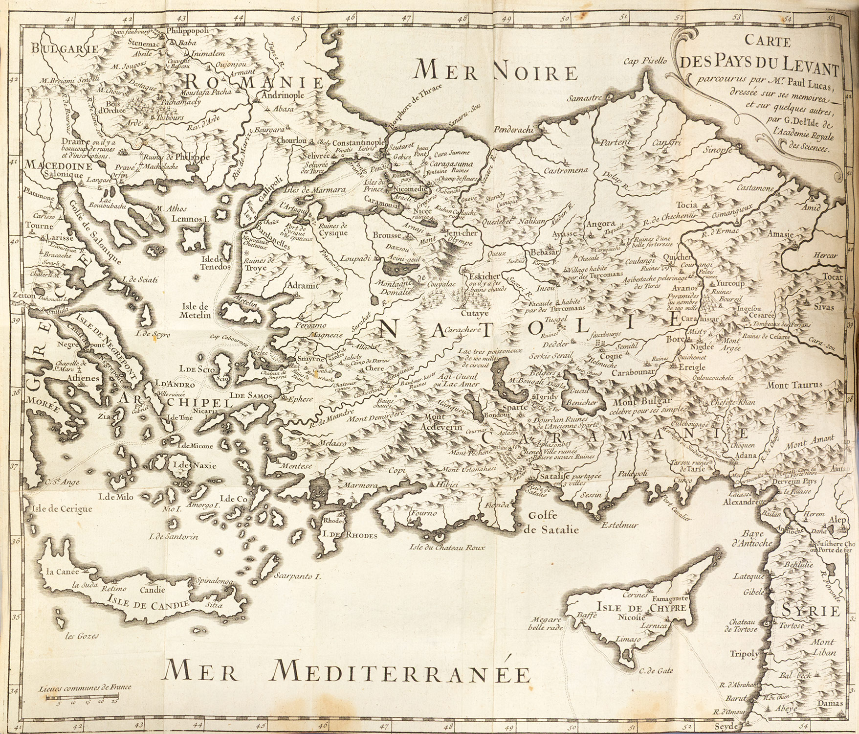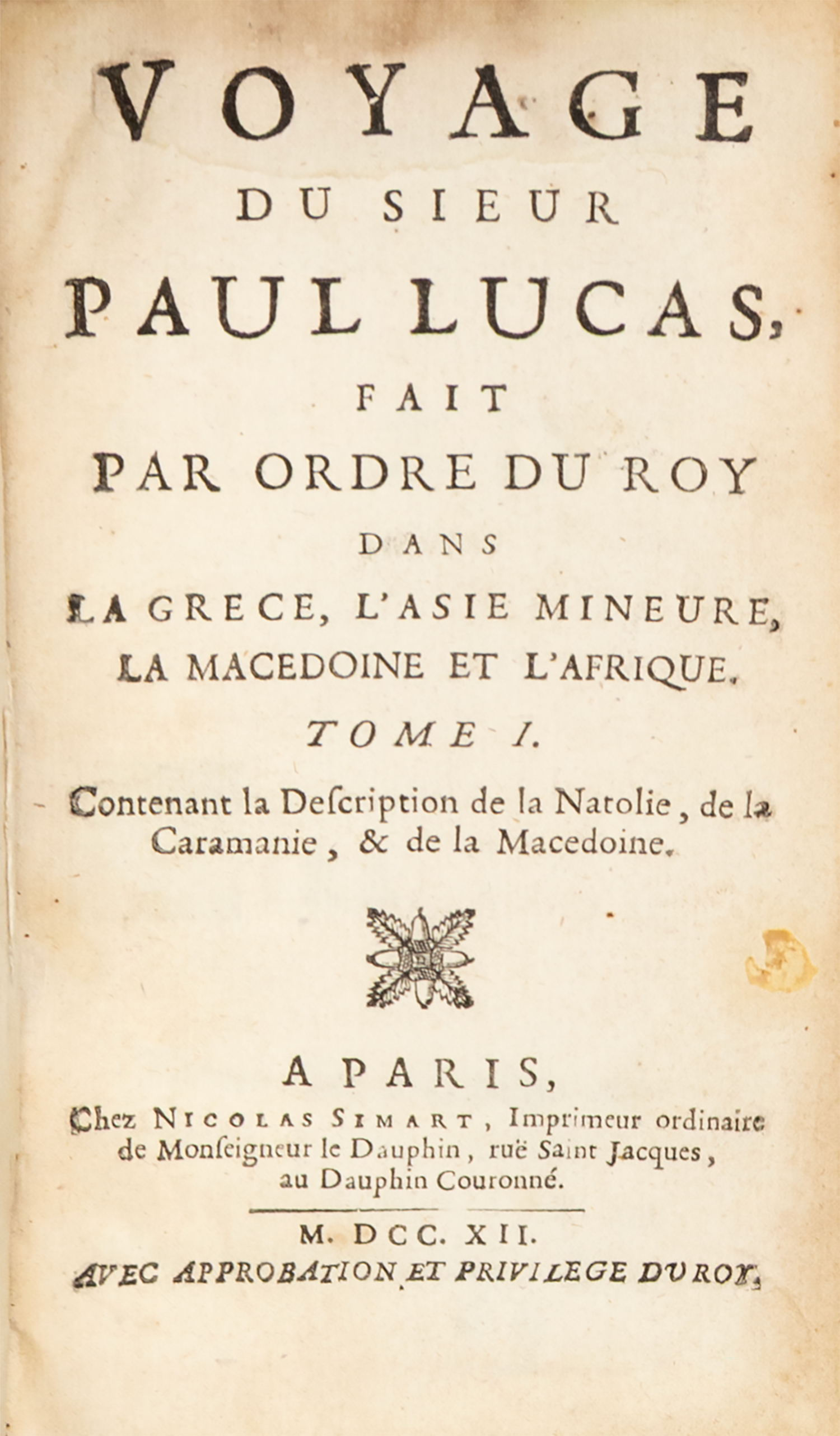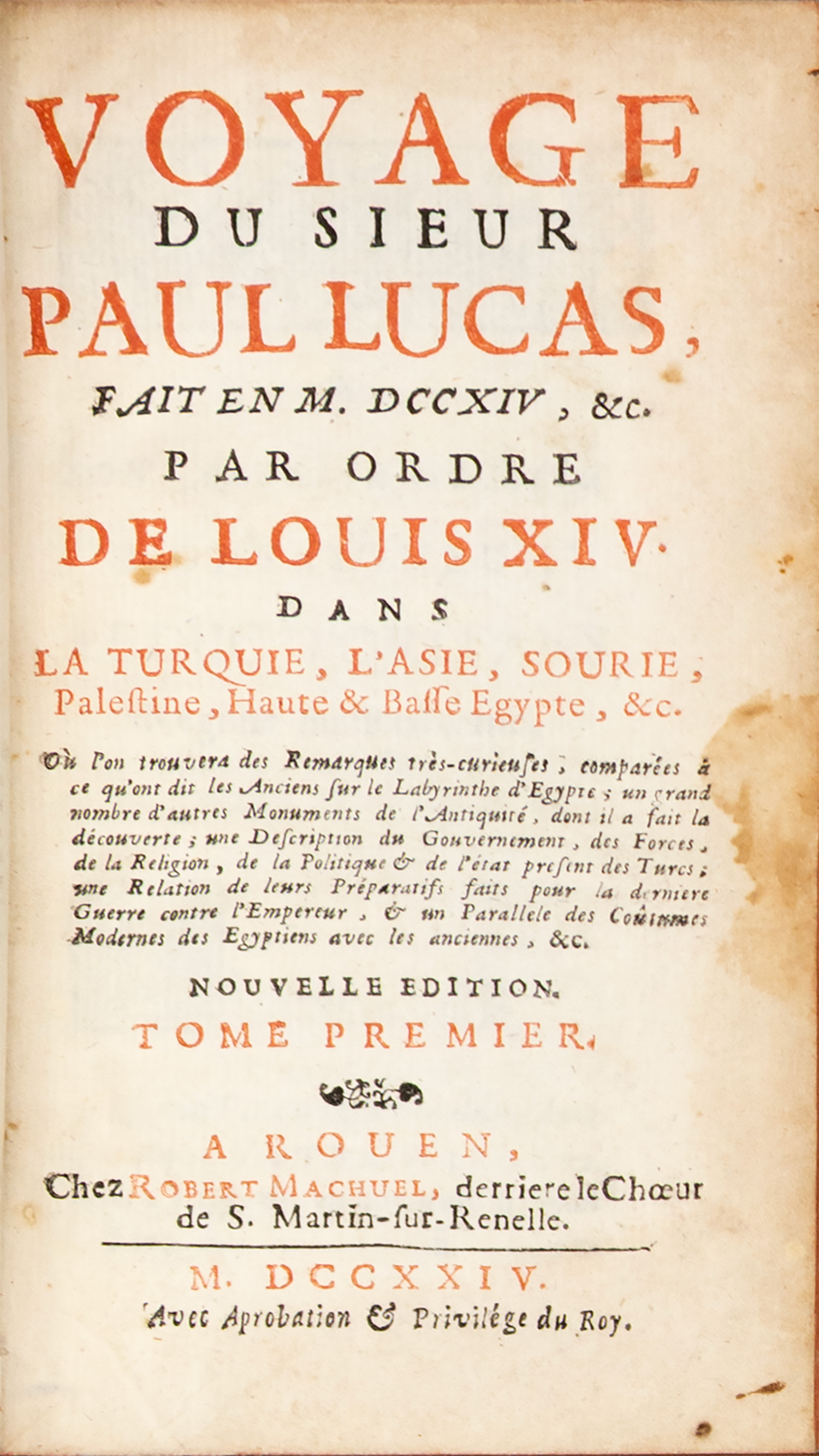 Voyage du sieur Paul Lucas, fait par ordre du Roy dans la Grece, l’Asie Mineure, la Macedoine et l’Afrique. Tome I. Contenant la description de la Natolie, de la Caramanie, & de la Macedoine. [– Tome II. Contenant la description de Jerusalem, de l’Egypte, & du Fioume: avec un Memoire pour servir à l’Histoire de Tunis, depuis l’année 1684].