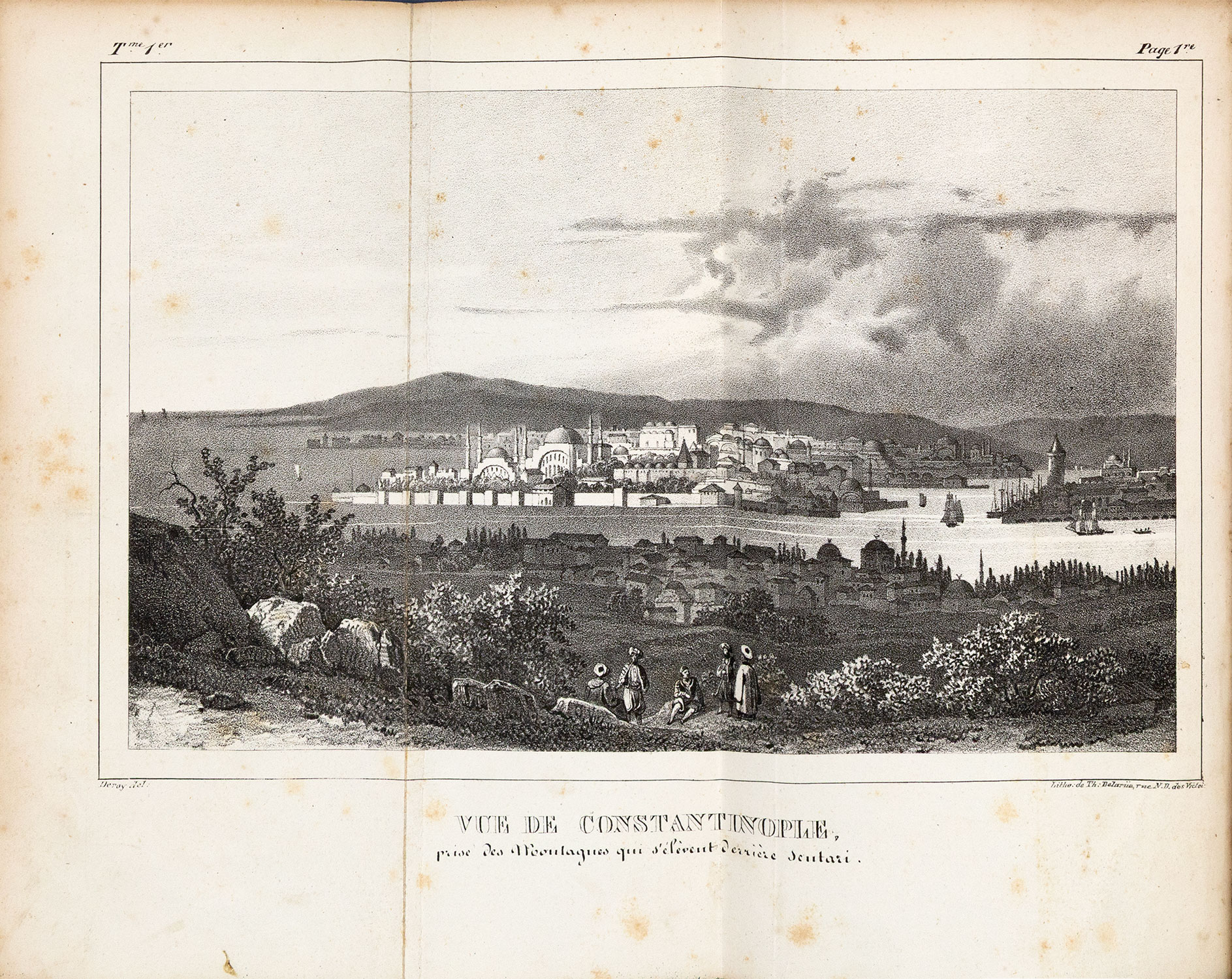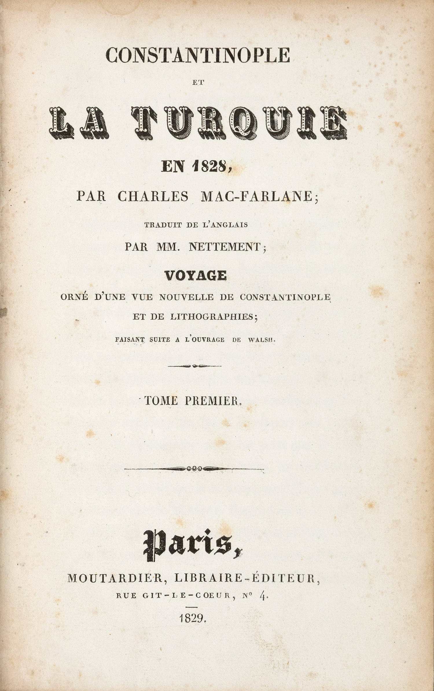 Πρώτη έκδοση στα γαλλικά, 2 τόμοι, 8ο (199 x 128 mm.), iv + 360 και 314 σ. (λείπει ένας πίνακας, ελαφρά οξειδωμένα τα περισσότερα φύλλα). Με μία αναδιπλούμενη λιθόγραφη άποψη της Κωνσταντινούπολης και 4 λιθόγραφους πίνακες (2 επιχρωματισμένοι με το χέρι). Δερμάτινη ράχη της εποχής της έκδοσης (μικρές φθορές, μαρμαρογραφημένα τα ακρόφυλλα, ex-libris Α. Δ. Χατζηδήμου). Weber, I, 177, Droulia 2508-9, Λαγανάς 905. (2) • Στις σ. 289-98 του Β΄ τόμου: «Réfutation de l’opinion de l’auteur anglais sur le Colonel Fabvier».