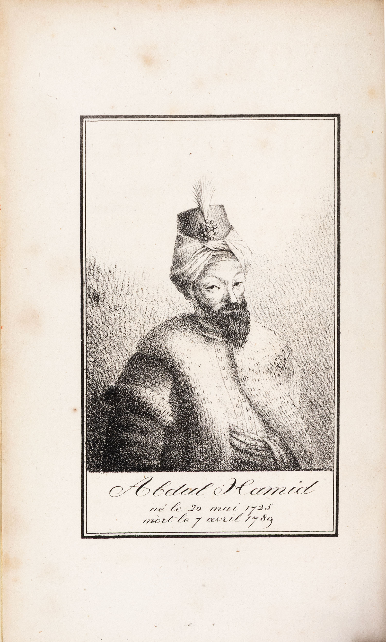 ΠΡΩΤΗ ΕΚΔΟΣΗ. 12o (170 x 102 mm.), 256 σ. (πολύ ελαφρά οξειδωμένα λίγα φύλλα). Λιθόγραφη προμετωπίδα (πορτραίτο του Abdul Hamid), φύλλο παροραμάτων στο τέλος. Δερμάτινη ράχη της εποχής της έκδοσης (μικρές φθορές, μαρμαρογραφημένα τα καλύμματα, διάστικτες οι ακμές, ex-libris Poulhariez-Cavanac και Α. Δ. Χατζηδήμου). Atabey 778, Weber, II, 602, Contominas 449.