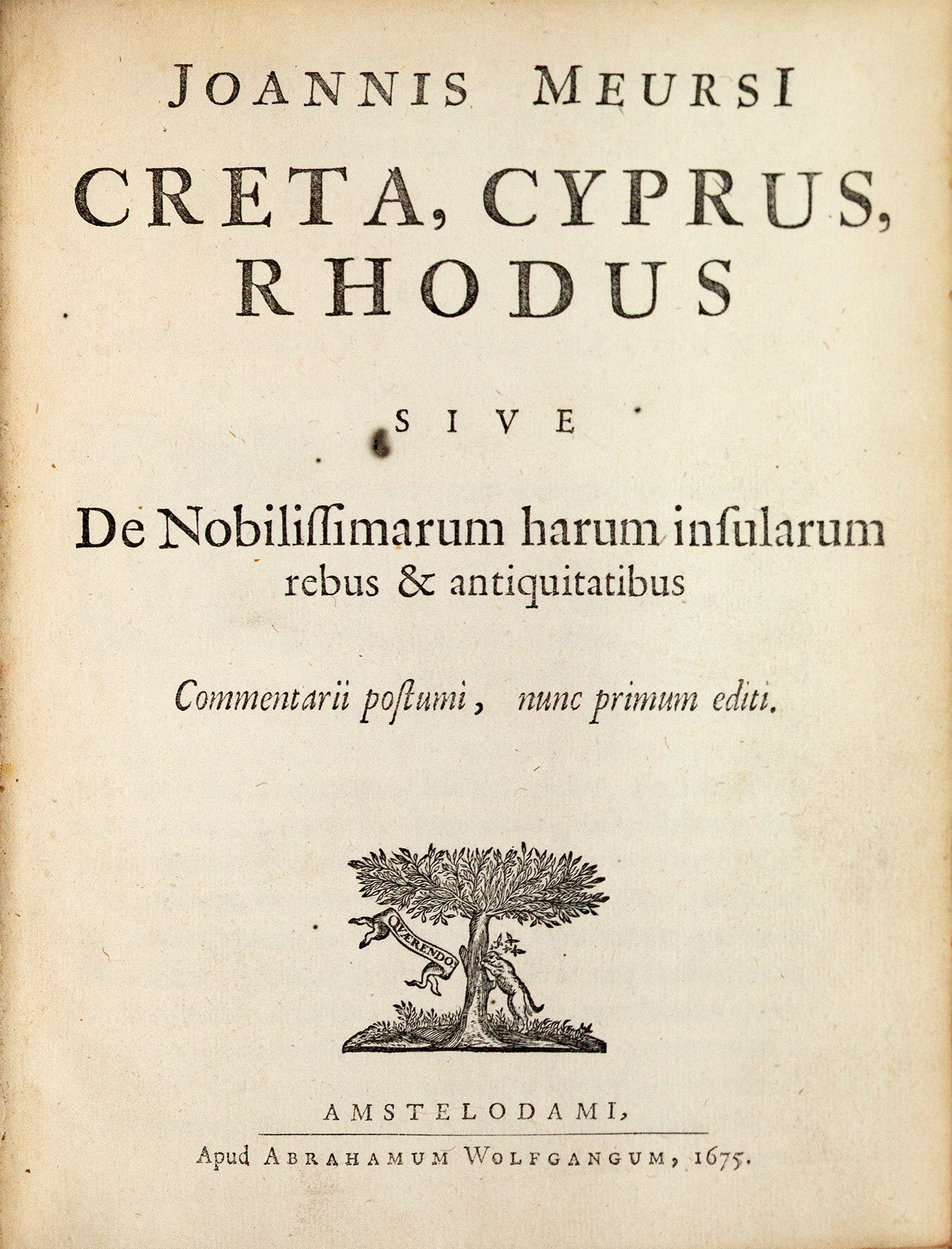 ΠΡΩΤΗ ΕΚΔΟΣΗ. 3 μέρη σε έναν τόμο, μικρό 4ο (201 x 162 mm.), 264, 124 και 175 σ. (τα μέρη που αφορούν την Κύπρο και τη Ρόδο δεμένα το μεν στη θέση του δε, μέτρια ομοιόμορφη οξείδωση σε αρκετά φύλλα του μέρους που αφορά τη Ρόδο). Ξυλόγραφο τυπογραφικό σήμα στον γενικό και στους επί μέρους τίτλους. Περγαμηνή της εποχής της έκδοσης (λίγο λερωμένη, κόκκινες οι ακμές, ex-libris Α. Δ. Χατζηδήμου). Blackmer 1121, Ioannou σ. 350, Cobham & Jeffery σ. 41.