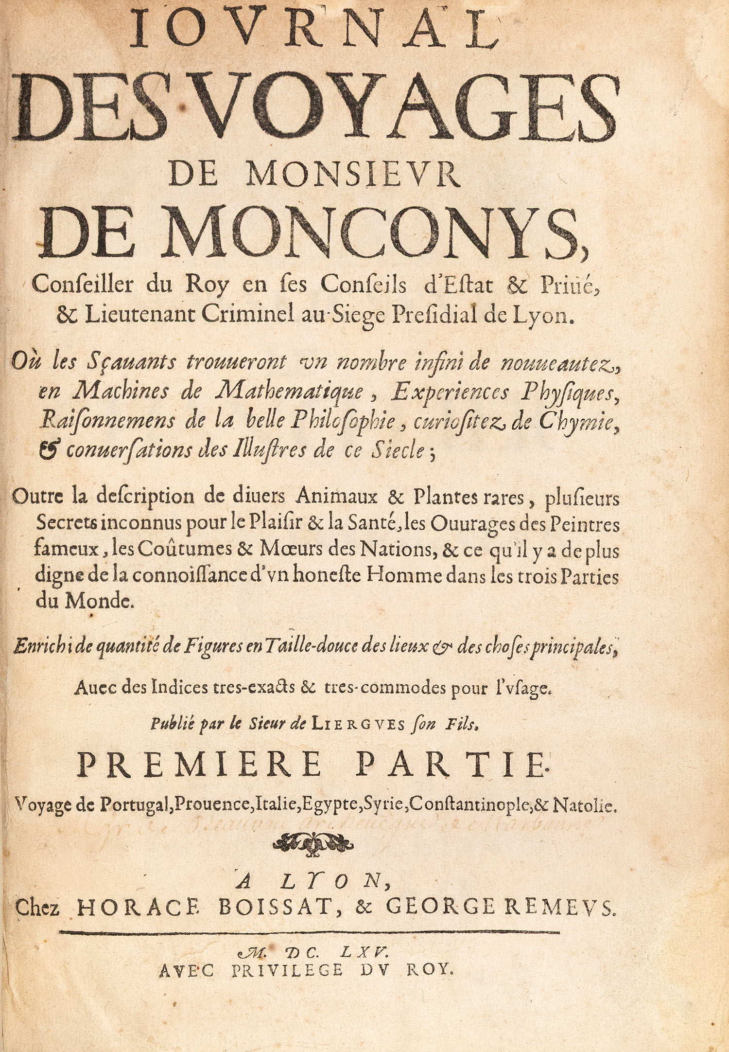 Iournal des voyages de Monsieur de Monconys (...) où les sçavants trouveront un nombre infini de nouveautez, en machines de mathematique, experiences physiques, raisonnemens de la belle philosophie, curiositez de chymie, & conversations des illustres de ce siecle; outre la description de divers animaux & plantes rares, plusieurs secrets inconnus pour le plaisir & la santé, les ouvrages des peintres fameux, les coûtumes & moeurs des nations, & ce qu'il y a de plusdigne de la connoissance d'un honeste homme dans les trois parties du monde.