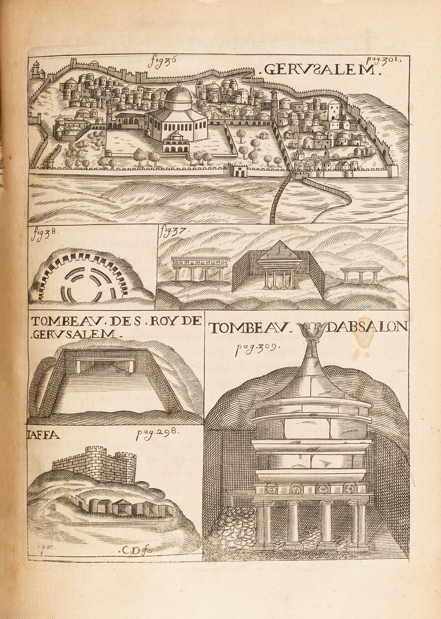 ΠΡΩΤΗ ΕΚΔΟΣΗ. 3 τόμοι, 4o (245 x 176 mm.), 10 + 491, 503 και 60 + 56 + 44 + 96 σ. (ομοιόμορφη οξείδωση, λυμένα δύο φύλλα στον Β΄ τόμο: σ. 19-22, σχεδόν λυμένα ακόμη δώδεκα στον Β΄ και τέσσερα στον Γ΄, τρύπες από έντομο στους τόμους Β΄ και Γ΄ με απώλεια λίγων γραμμάτων σε κάθε φύλλο). Με 30 χαλκόγραφους πίνακες. Δέρμα της εποχής της έκδοσης (φθορές, χαλαρωμένη η πάνω σύνδεση του Β΄ τόμου, λείπουν τμήματα από τις ράχες των τόμων Β΄ και Γ΄, σχισίματα στις ενώσεις αυτών των τόμων, χρυσή διακόσμηση στη ράχη και τα καλύμματα, διάστικτες οι ακμές, ex-libris Α. Δ. Χατζηδήμου). Atabey 825, Weber, II, 258, πρβ. Blackmer 1146. (3) • Ο Monconys, φυσικός και μαθηματικός, επισκέφθηκε την Κωνσταντινούπολη και τη Μικρά Ασία κατά τα έτη 1647-1649.