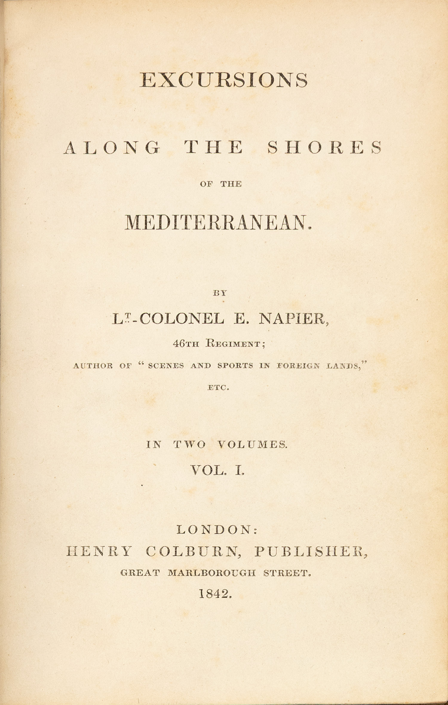 2 τόμοι, 8ο (190 x 116 mm.), xviii + 352 και x + 387 σ. (λείπουν οι ψευδότιτλοι, ελαφρά οξειδωμένες οι προμετωπίδες, έντονη οξείδωση σε λίγα φύλλα στο τέλος του Β΄ τόμου). Με μία λιθόγραφη προμετωπίδα σε κάθε τόμο. Δερμάτινη ράχη της εποχής της έκδοσης (μικρό σχίσιμο στην κάτω ένωση του Α΄ τόμου, δύο λίγο μεγαλύτερα στις ενώσεις του Β΄, μικρές φθορές, χρυσή διακόσμηση στη ράχη, μαρμαρογραφημένα τα καλύμματα, ex-libris Α. Δ. Χατζηδήμου). Blackmer 1183, Atabey 857. (2)