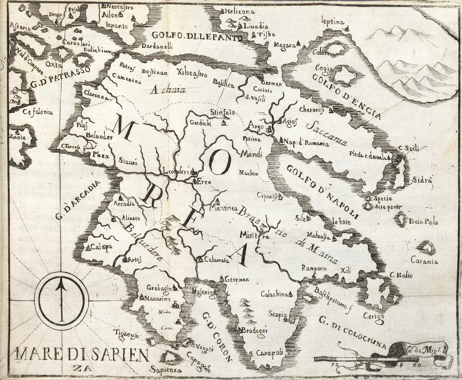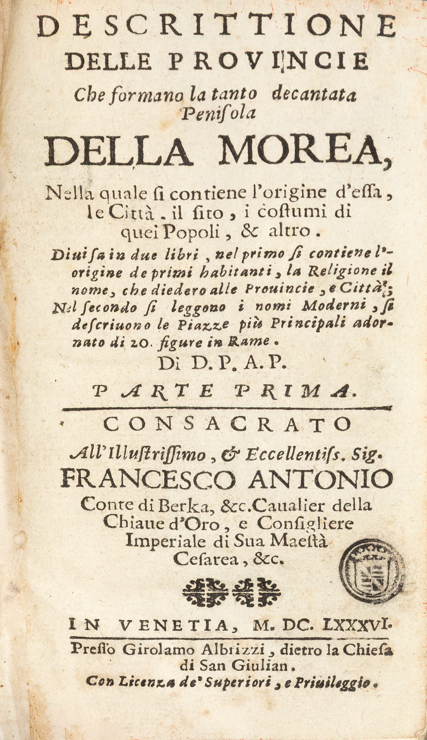 Descrittione delle provincie che formano la tanto decantata Penisola della Morea, nella quale si contiene l’origine d’ essa, le città, il sito, i costumi di quei popoli, & altro, [...], di D. P. A. P.