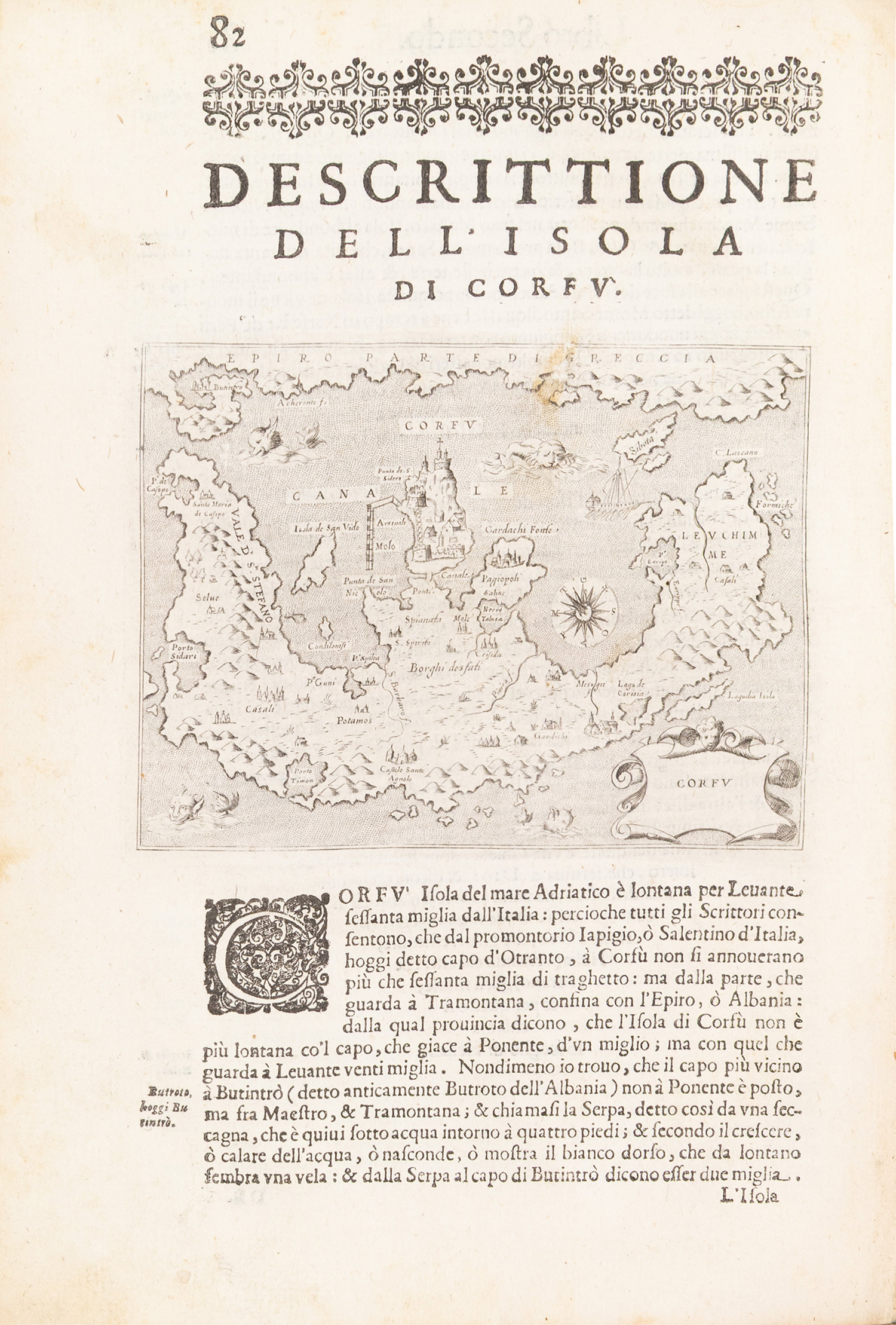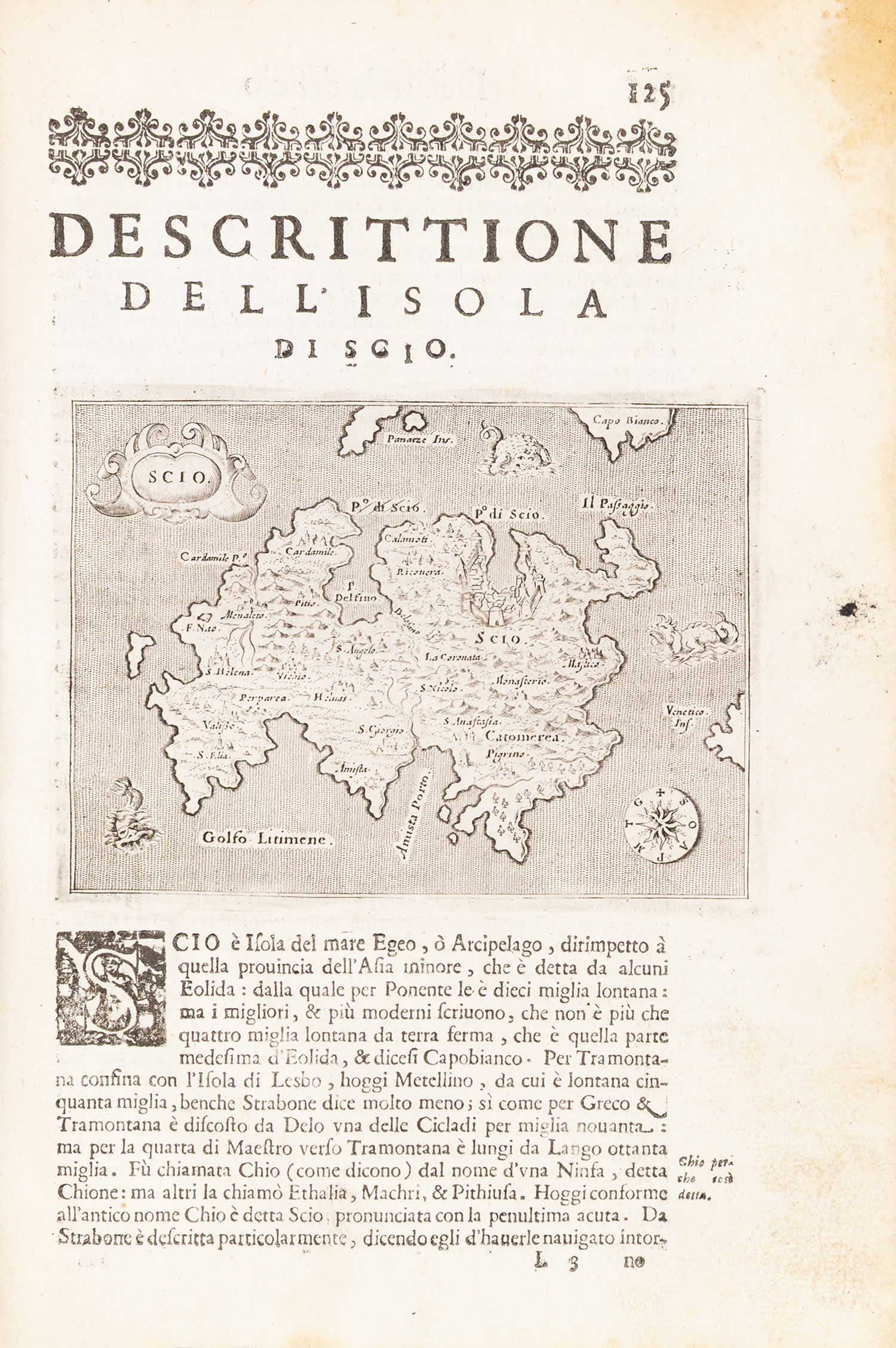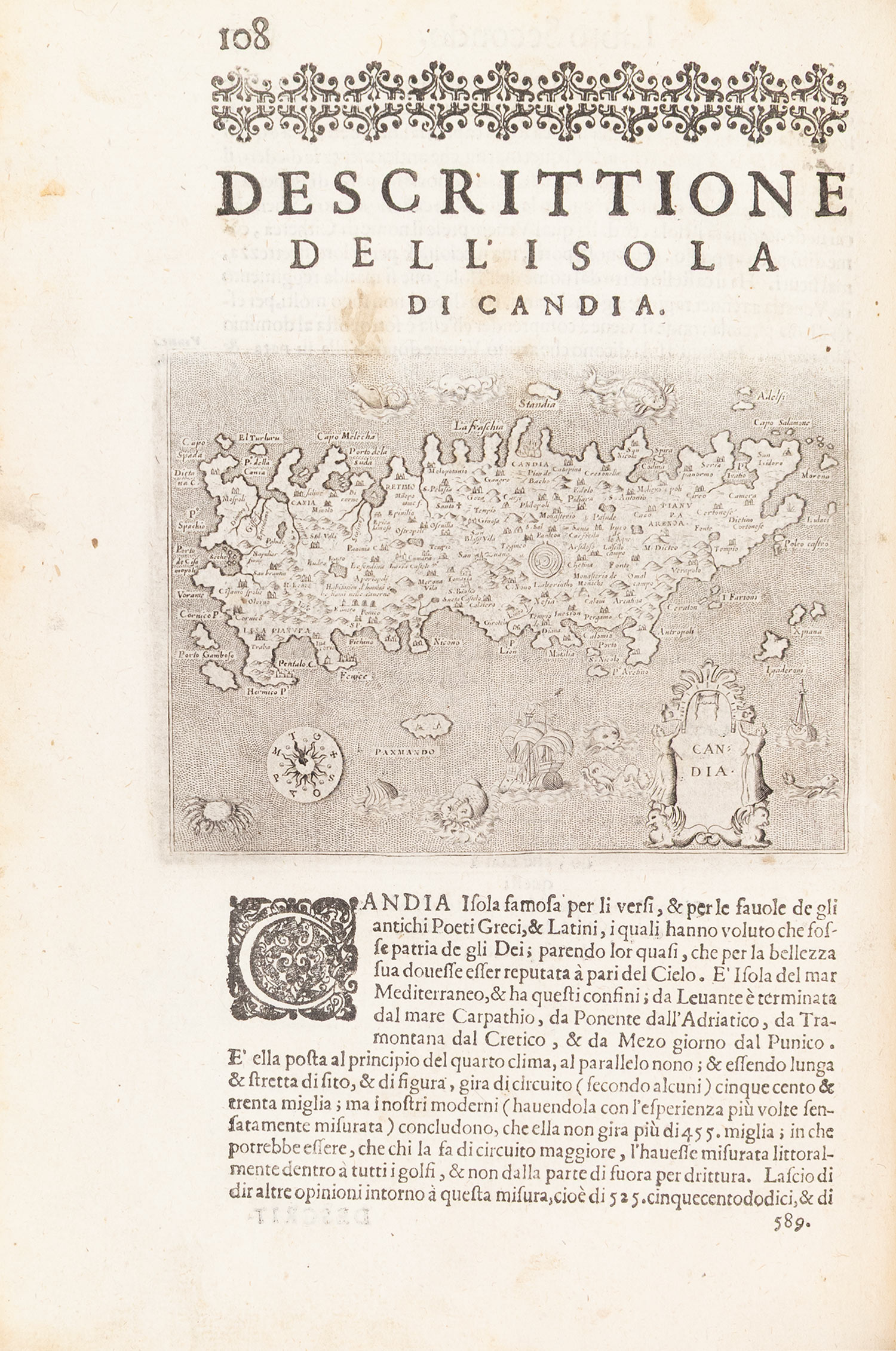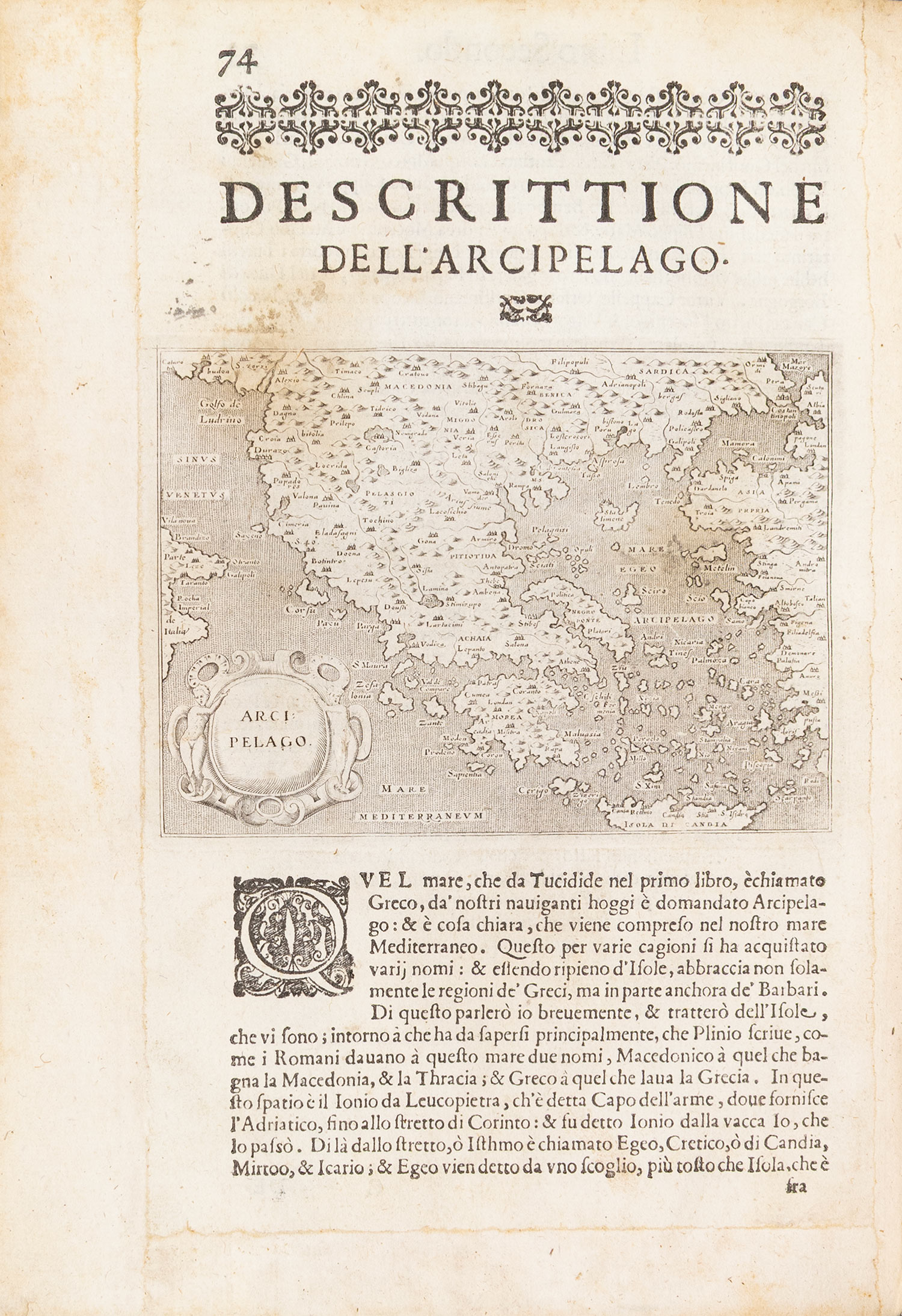 μικρό folio (290 x 207 mm.), 211 σ. (ελαφρά οξειδωμένα μερικά φύλλα, μικρός λεκές από νερό στον τίτλο και σε δύο ακόμα φύλλα, μικρή τρύπα σε ένα φύλλο: σ. 27-8, σχίσιμο στην πάνω εξωτερική γωνία ενός άλλου: σ. 147-8, επιδιόρθωση σε δύο φύλλα: σ. 73-4 και 83-4). Χαλκόγραφος τίτλος, με 48 χαλκογραφίες εντός κειμένου, ξυλόγραφα πρωτογράμματα, επίτιτλα και βινιέτες. Περγαμηνή της εποχής της έκδοσης (μικρό σχίσιμο στην κάτω ένωση, μικρές φθορές, μπλε οι ακμές, ex-libris Α. Δ. Χατζηδήμου). Ioannou σ. 422, Weber, II, 800, Cobham & Jeffery σ. 51, Zacharakis 2727-44, πρβ. Blackmer 1330. • Μεγάλο μέρος του έργου είναι αφιερωμένο στα νησιά της Ελλάδας και την Κύπρο. Δίνεται επίσης μια περιγραφή της Ναυμαχίας της Ναυπάκτου.