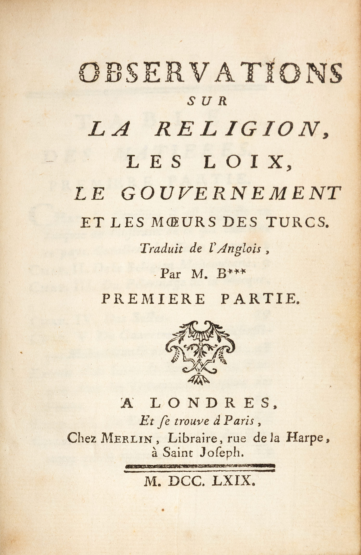 Observations sur la religion, les loix, le gouvernement et les mœurs des Turcs.