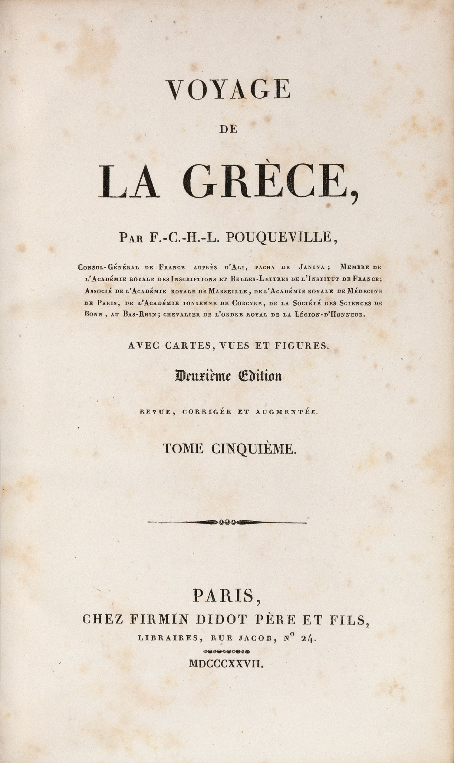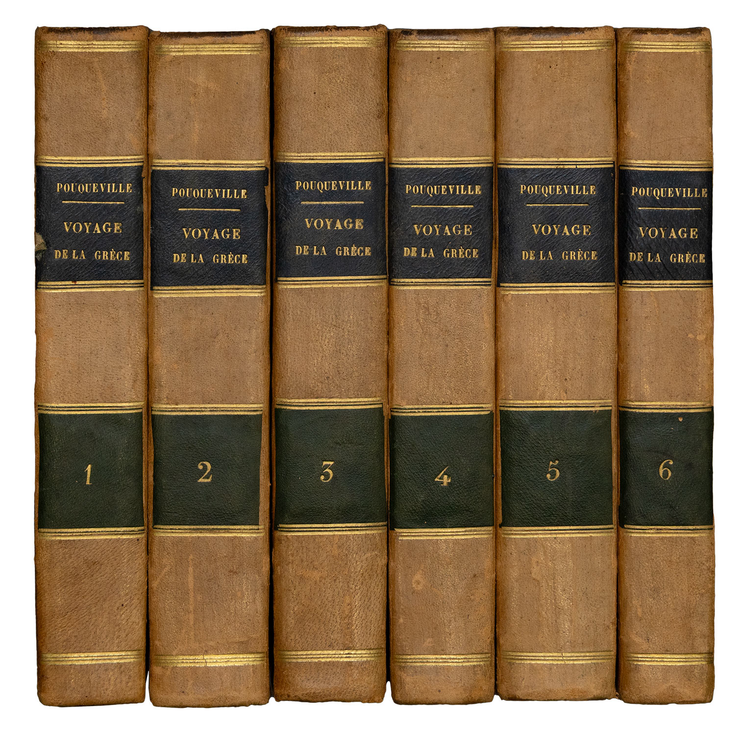 6 τόμοι, 8ο (205 x 127 mm.), lxxviij + 418, 524, 552, 511, 624 και 481 σ. (ελαφρά οξειδωμένο αντίτυπο, εντονότερη οξείδωση στο τεύχος 1 του Γ΄ τόμου και στους τόμους Ε΄ και ΣΤ΄, οξειδωμένοι ορισμένοι πίνακες). Με 8 αναδιπλούμενους χάρτες και 25 λιθογραφίες (9 αναδιπλούμενες). Μεταγενέστερη δερμάτινη ράχη (μαρμαρογραφημένα τα καλύμματα, ex-libris: Α. Δ. Χατζηδήμου). Blackmer 1346, Atabey 991, Weber, I, 143, Contominas 579, Droulia 1756-9, Λαγανάς 810. (6) • Ο αριθμός των χαρτών και των λιθογραφιών αυτής της έκδοσης δεν είναι ίδιος σε όλα τα αντίτυπα. Έχοντας εξετάσει 7 διαφορετικά αντίτυπα, η L. Navari κατέγραψε συνολικά 38 χάρτες και λιθογραφίες. Το αντίτυπο της συλλογής Blackmer είχε 6 χάρτες και 8 λιθογραφίες.