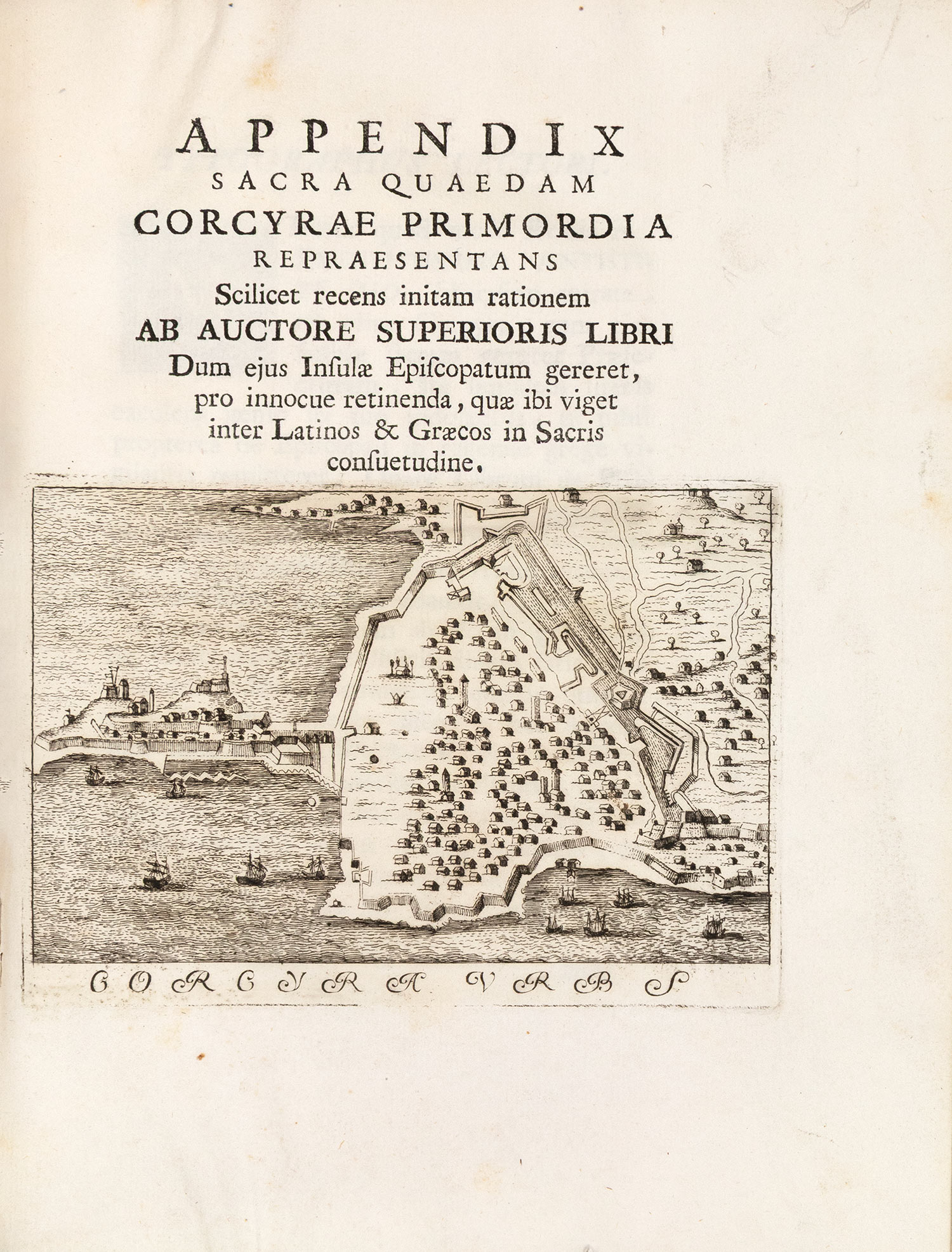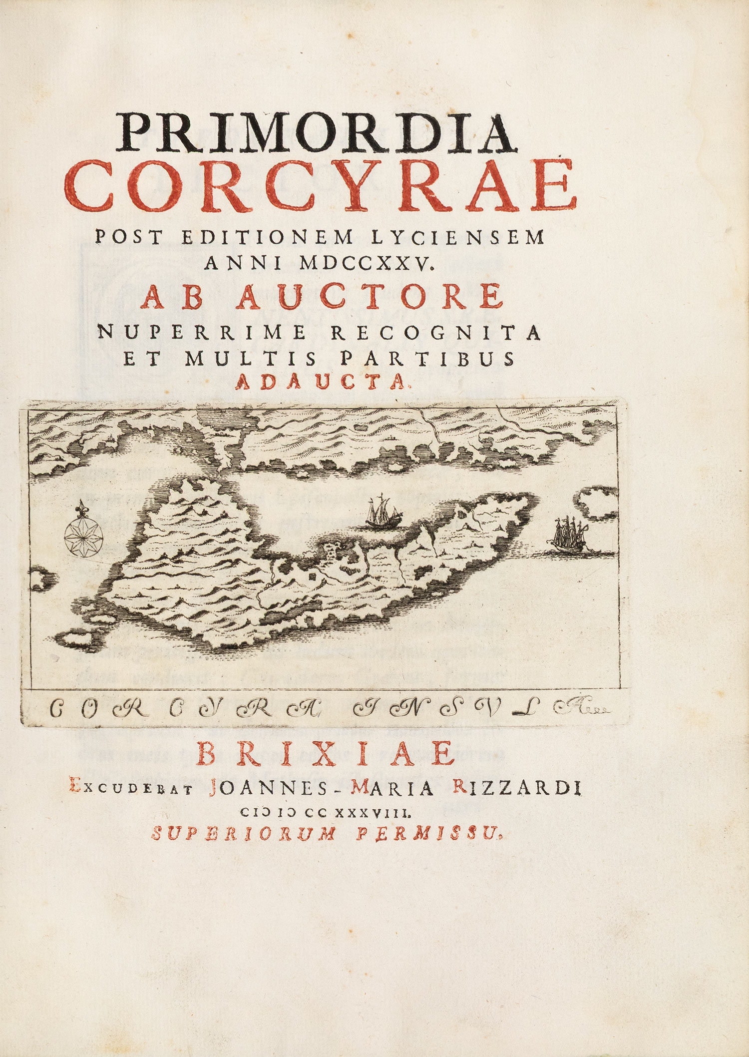 Δεύτερη έκδοση, 2 μέρη σε έναν τόμο, χωρίς το τρίτο μέρος («Illustrium auctorum dicta […]») που υπάρχει σε κάποια αντίτυπα, 4ο (282 x 207 mm.), 224 + XXIII σ. (μικρός λεκές από νερό στο εξωτερικό περιθώριο μερικών φύλλων). Δίχρωμος ο τίτλος, επί μέρους τίτλος στο δεύτερο μέρος («Appendix sacra quaedam Corcyrae primordia […]»), και οι δύο με χαλκόγραφες βινιέτες (χάρτης της νήσου και άποψη της πόλης της Κέρκυρας αντίστοιχα), με 2 χαλκόγραφους πίνακες πριν από τη σ. I του δεύτερου μέρους, 3 χαλκόγραφα πρωτογράμματα και μία χαλκόγραφη βινιέτα. Περγαμηνή της εποχής της έκδοσης (λίγο λερωμένη, μικρές φθορές, μπλε οι ακμές, ex-libris Α. Δ. Χατζηδήμου). Blackmer 1373, Legrand & Pernot 323 (χωρίς το τρίτο μέρος). • Ο συγγραφέας ήταν αρχιεπίσκοπος Κέρκυρας από το 1723 μέχρι το 1727, οπότε έγινε καρδινάλιος της Μπρέσια. Μετάφραση του πρώτου μέρους στα ελληνικά δημοσίευσε ο Ευγένιος Βούλγαρης: Αἱ καθ’ Ὅμηρον ἀρχαιότητες καί αἱ κερκυραϊκαί ἀρχαιολογίαι, Μόσχα 1804, σ. 333-448.