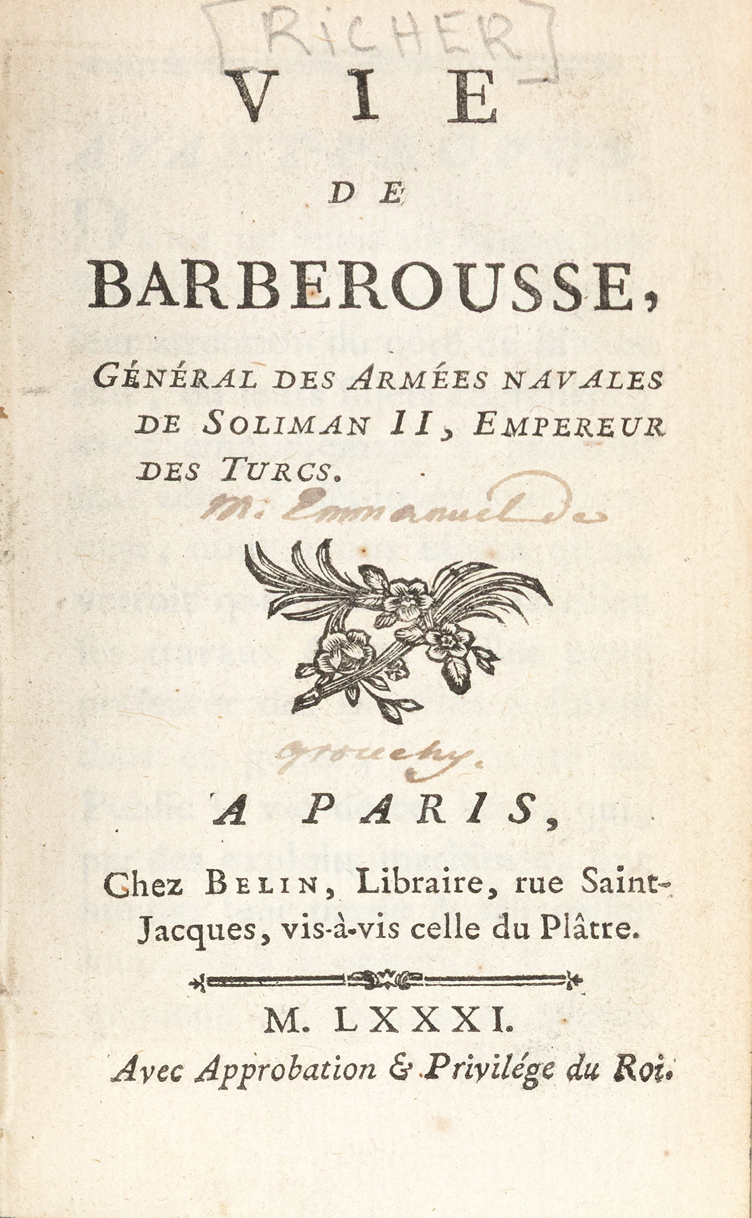 ΠΡΩΤΗ ΕΚΔΟΣΗ. 12o (142 x 82 mm.), xxij + 212 σ. Χαλκόγραφη προμετωπίδα (πορτραίτο του Μπαρμπαρόσσα). Δέρμα της εποχής της έκδοσης (μικρές φθορές, χρυσή διακόσμηση στη ράχη, μαρμαρογραφημένα τα ακρόφυλλα, ex-libris Α. Δ. Χατζηδήμου). Blackmer 1417, πρβ. Atabey 1042.