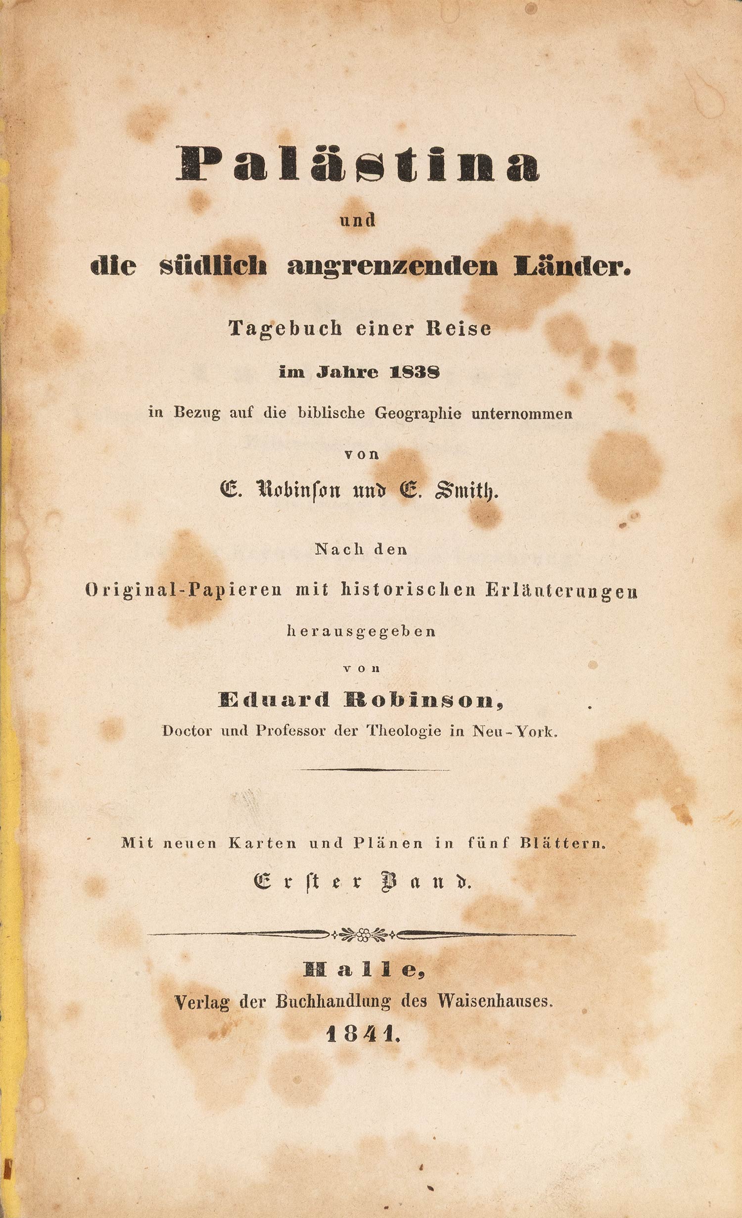 Palästina und die südlich angrenzenden Länder, Tagebuch einer Reise im Jahre 1838 in Bezug auf die biblische Geographie unternommen von E. Robinson und E. Smith.