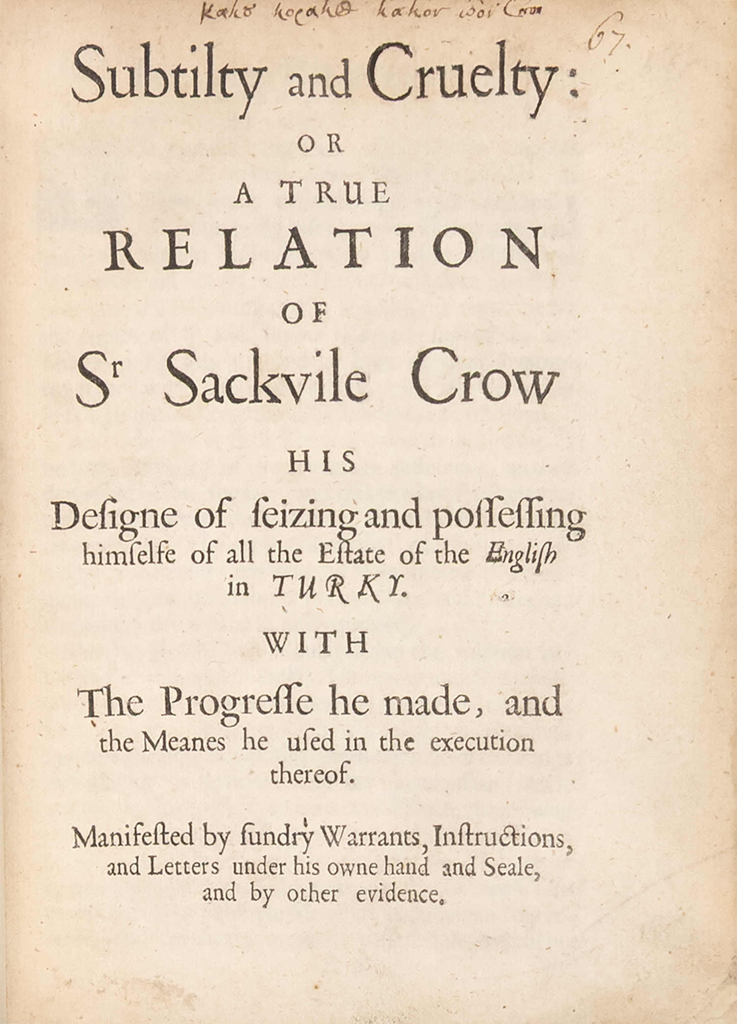 Subtilty and cruelty: or A true relation of Sr Sackvile Crow. His designe of seizing and possessing himselfe of all the estate of the English in Turky. With the progresse he made, and the meanes he used in the execution thereof. Manifested by sundry warrants, instructions, and letters under his owne hand and seale, and by other evidence.