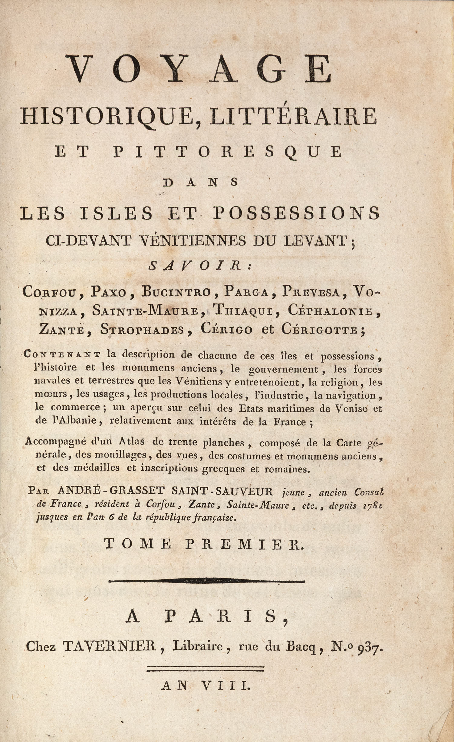 Voyage historique, littéraire et pittoresque dans les isles et possessions ci-devant vénitiennes du Levant; savoir: Corfou, Paxo, Bucintro, Parga, Prevesa, Vonizza, Sainte-Maure, Thiaqui, Céphalonie, Zante, Strophades, Cérigo et Cérigotte.