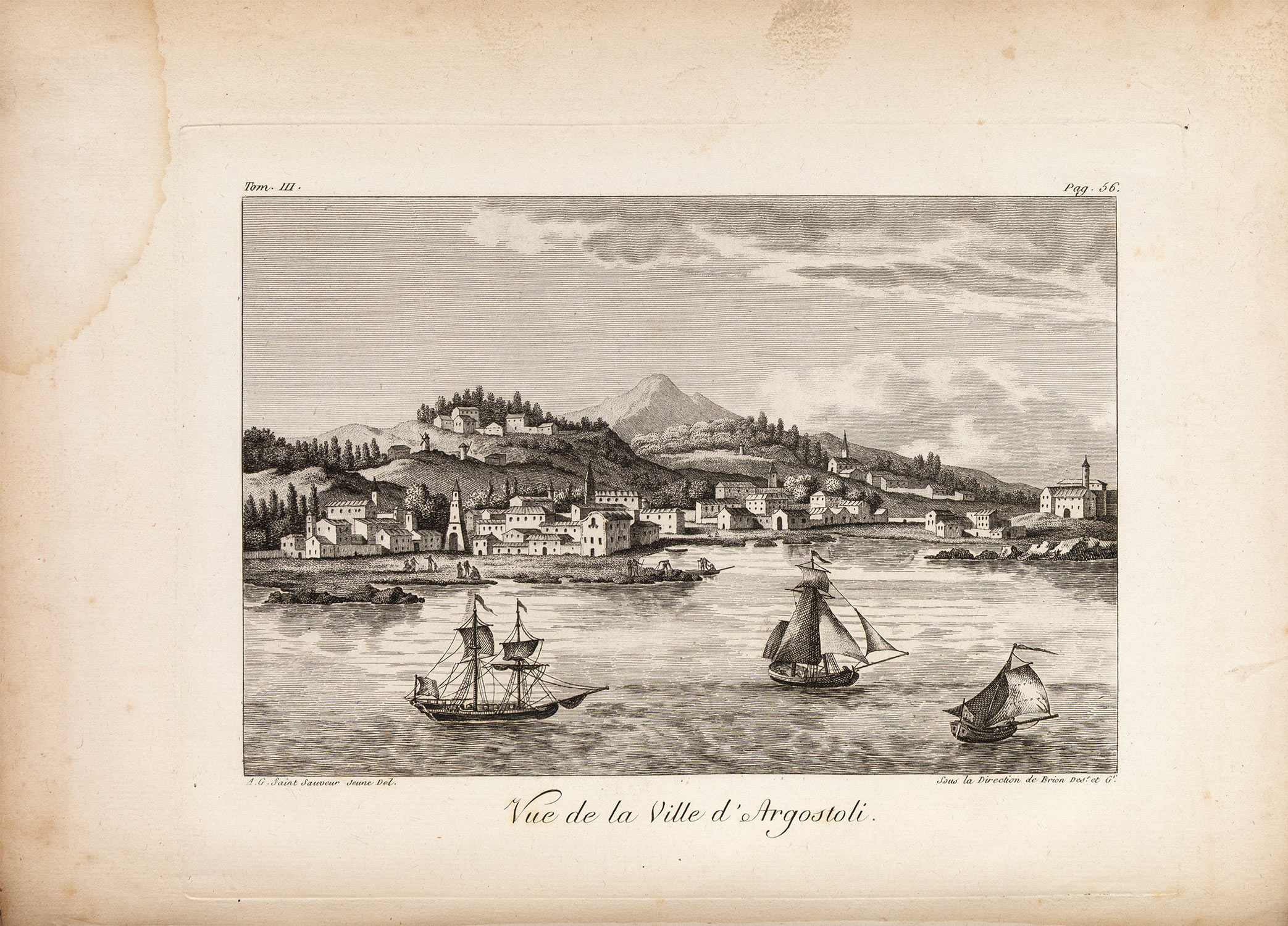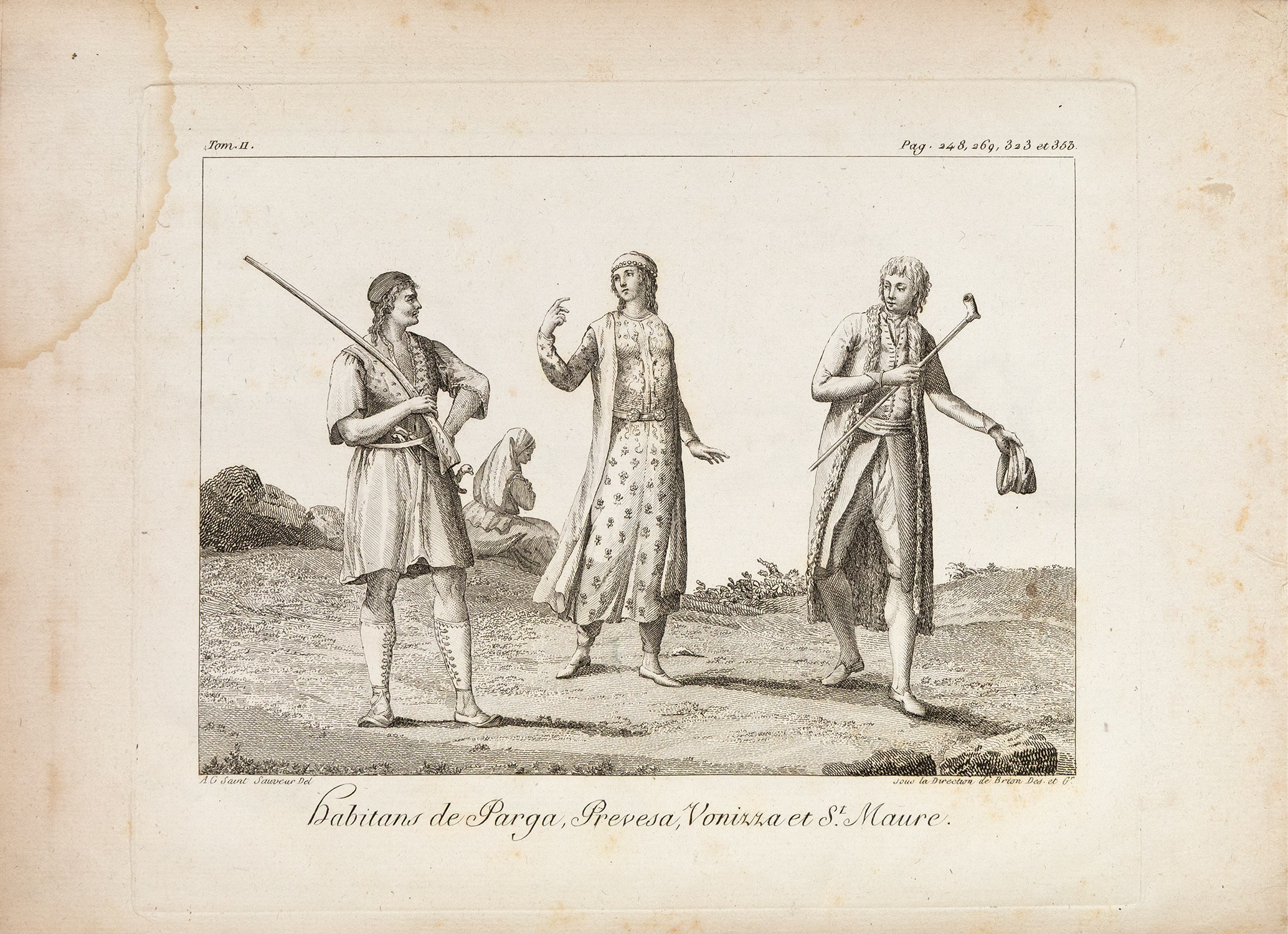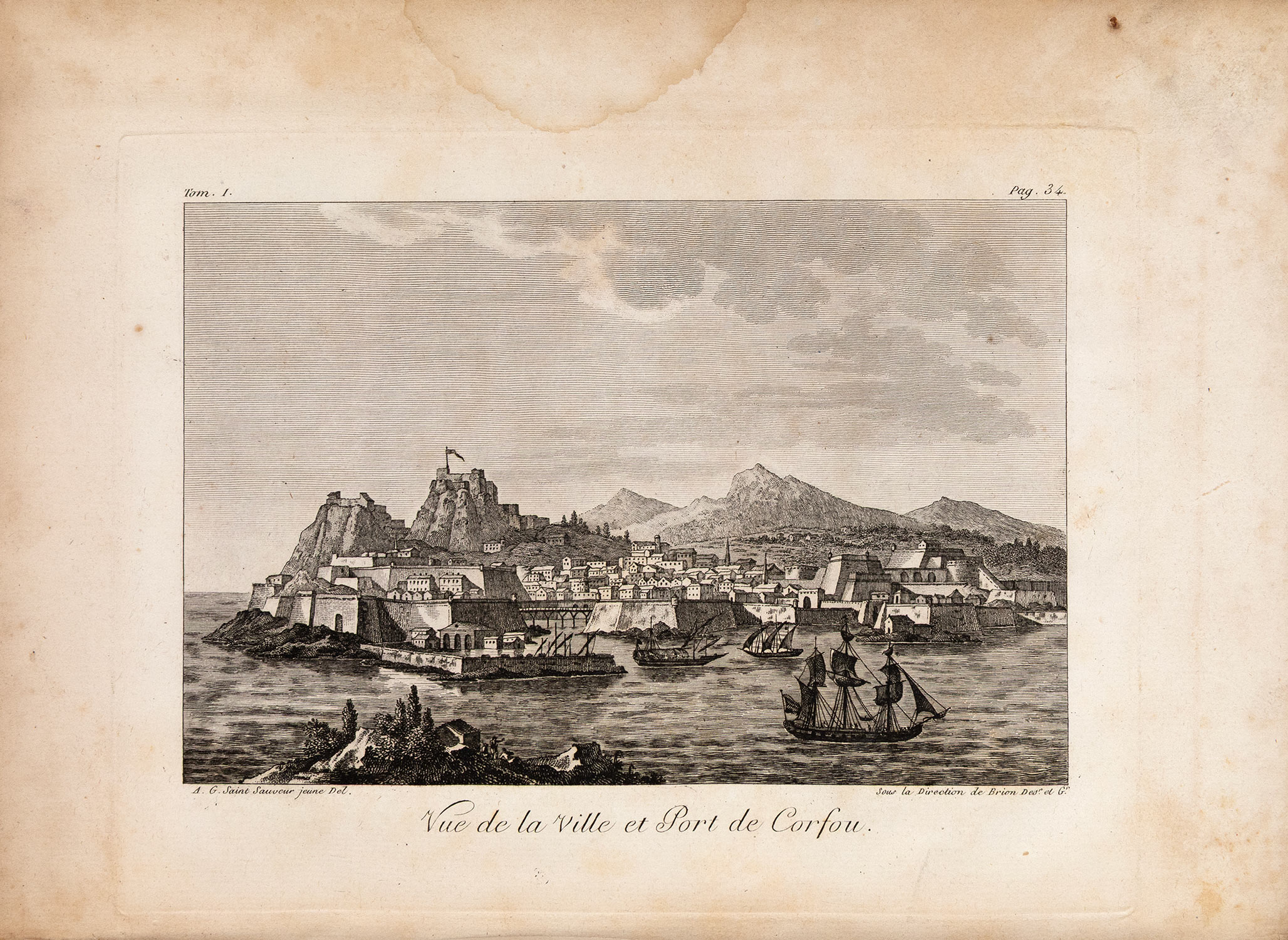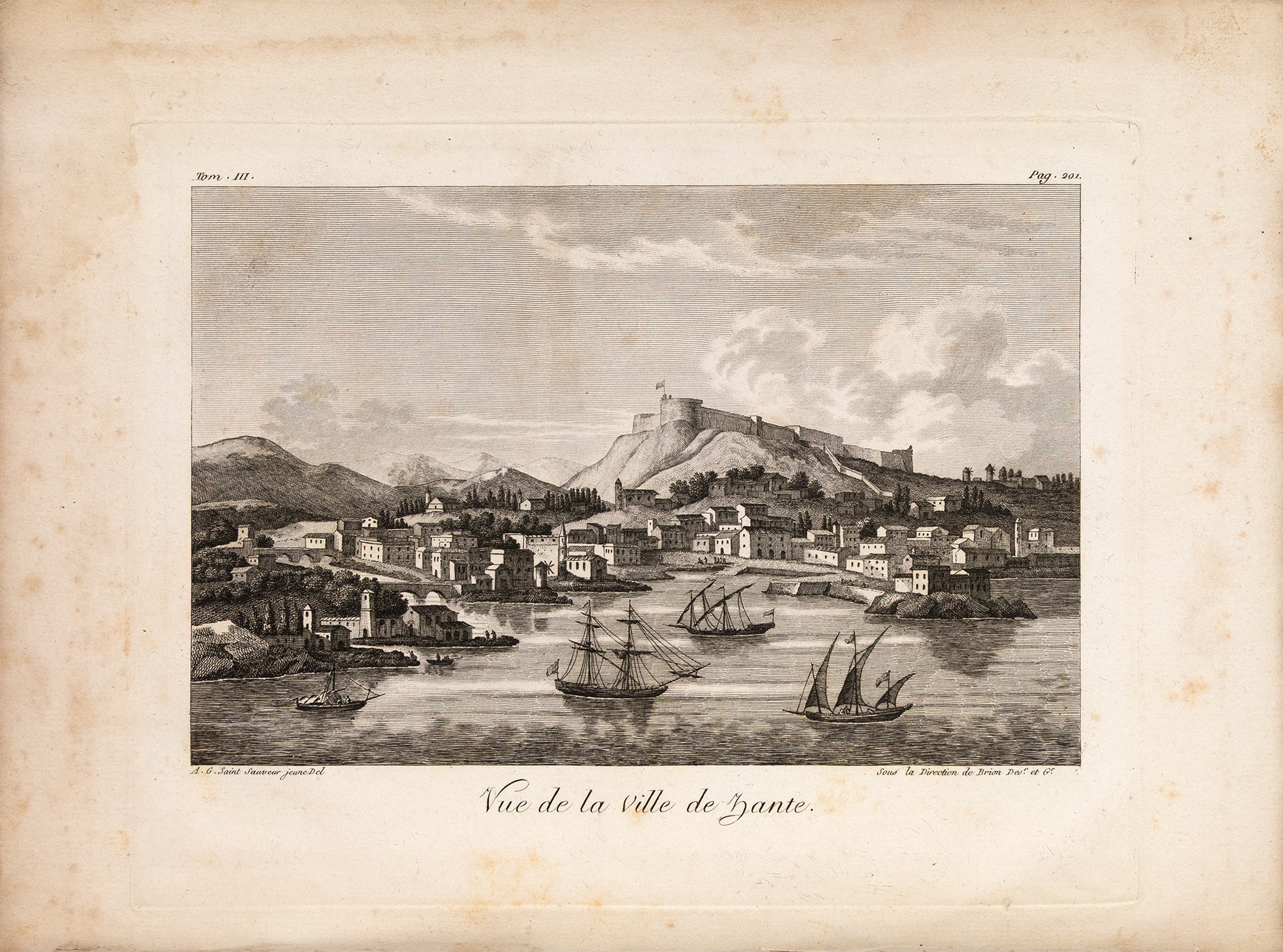 ΠΡΩΤΗ ΕΚΔΟΣΗ. 3 τόμοι, 8ο (192 x 125 mm.), XVI + 407, 358 και 383 σ. (πολύ ελαφρά οξειδωμένο αντίτυπο, μικρό σχίσιμο στο κάτω περιθώριο ενός φύλλου στον Α΄ τόμο: σ. 251-2). Δέρμα της εποχής της έκδοσης (μικρές φθορές, σχισίματα στις ενώσεις του Γ΄ τόμου, χρυσή διακόσμηση στη ράχη, διάστικτες οι ακμές, ex-libris Α. Δ. Χατζηδήμου). [μαζί ο άτλας:] 4ο (300 x 222 mm.). (δύο λεκέδες από νερό κυρίως στα περιθώρια μερικών πινάκων, ελαφρά οξειδωμένοι μερικοί πίνακες). 9 χαλκόγραφοι χάρτες (ένας αναδιπλούμενος) και 21 χαλκογραφίες σε σχέδια του συγγραφέα (ανάμεσά τους 9 απόψεις και 3 χαλκογραφίες με ενδυμασίες), χωρίς ιδιαίτερο φύλλο τίτλου. Χαρτόνια της εποχής (φθορές στη ράχη, μικρές φθορές, χαλαρωμένες οι συνδέσεις, ex-libris Α. Δ. Χατζηδήμου). Blackmer 722, Atabey 517, Weber, II, 593, Legrand & Pernot 582, Colas 1287, Contominas 302. (4) • Ο Grasset de Saint-Sauveur έζησε στα Επτάνησα από το 1781 μέχρι το 1798.