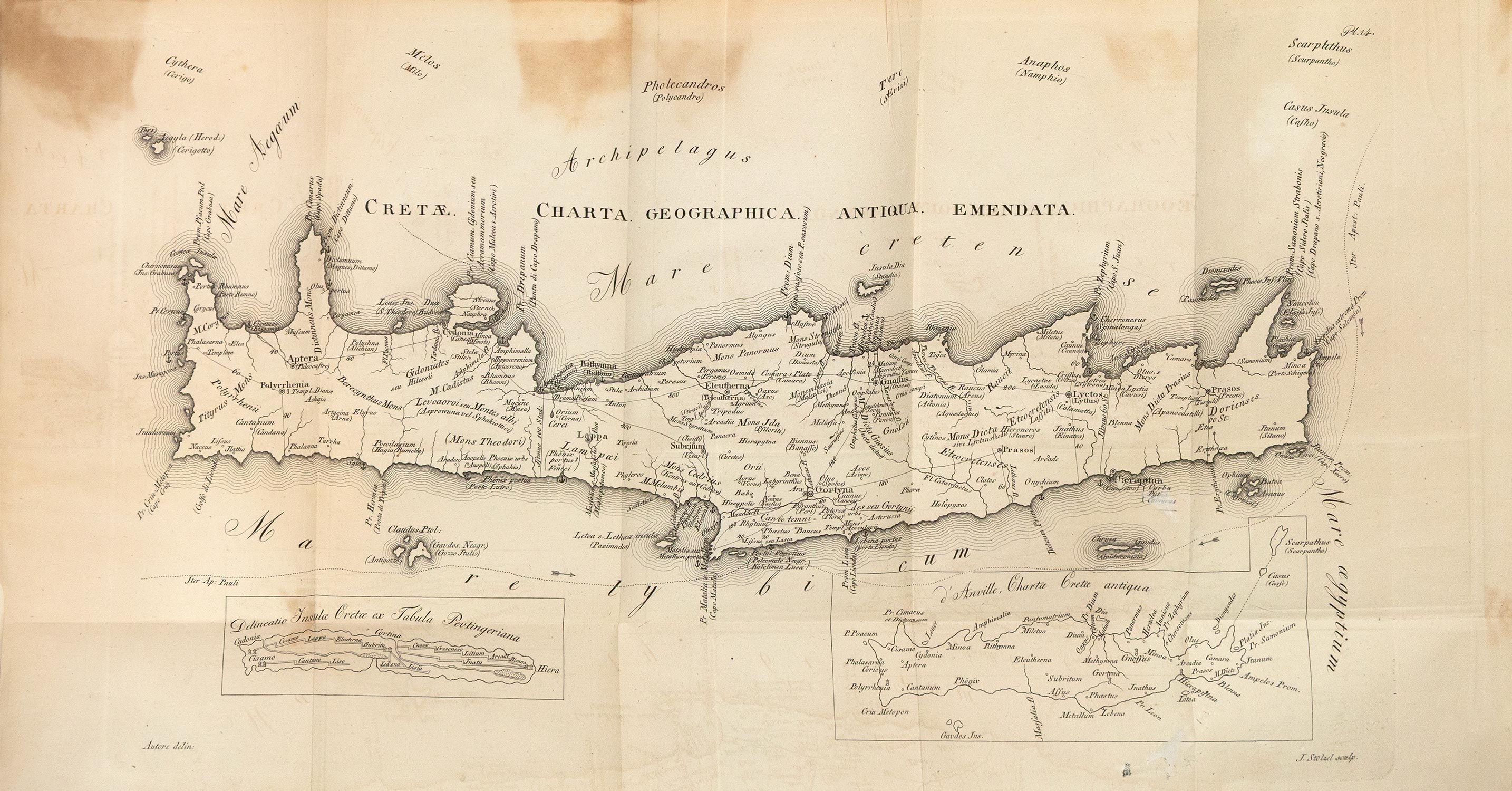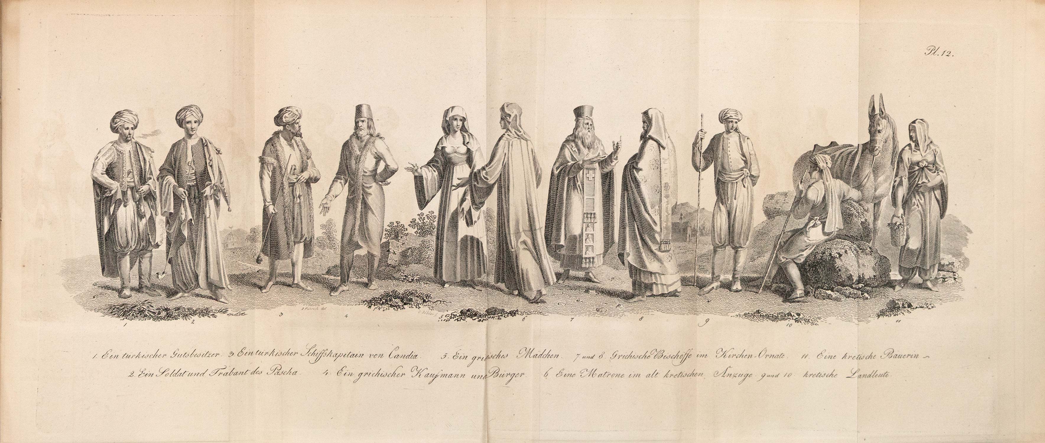 ΠΡΩΤΗ ΕΚΔΟΣΗ. 2 τόμοι, 8ο, XXII + 548 και IV + 328 σ. (οξειδωμένα τα πρώτα φύλλα του Α΄ τόμου, ήπιοι λεκέδες από οξείδωση στον χάρτη και σε δύο ακόμα πίνακες). Με 3 αναδιπλούμενους χαλκόγραφους πίνακες: χάρτης της Κρήτης, πίνακας με ενδυμασίες και τοπογραφικό του Λαβυρίνθου, και 11 ακόμα χαλκογραφίες εκτός κειμένου (ανάμεσά τους 7 πίνακες βοτανικής), κατάλογος συνδρομητών. Νεότερη δερμάτινη ράχη (μικρές φθορές, κόκκινες οι ακμές, δύο ex-libris: της οικογένειας von Bethmann και Α. Δ. Χατζηδήμου). Weber, I, 126, πρβ. Blackmer 1542 & Atabey 1131 (η αγγλική έκδοση). (2)