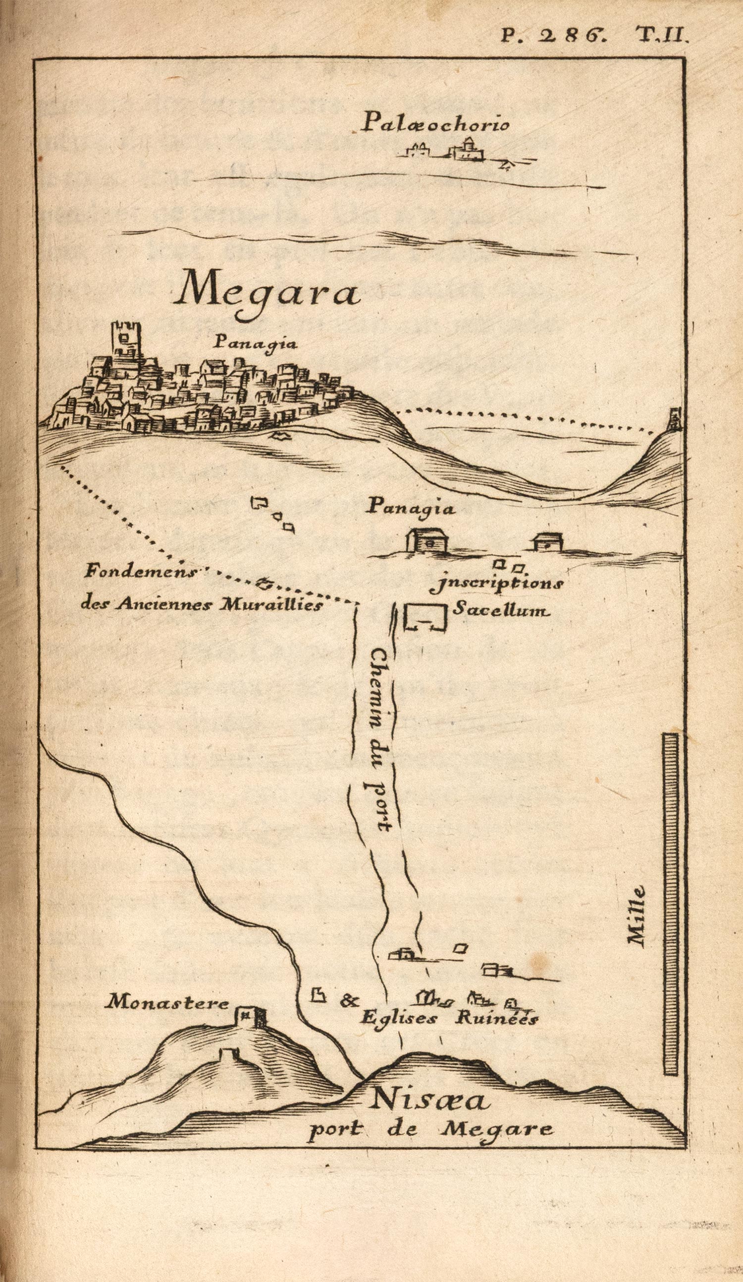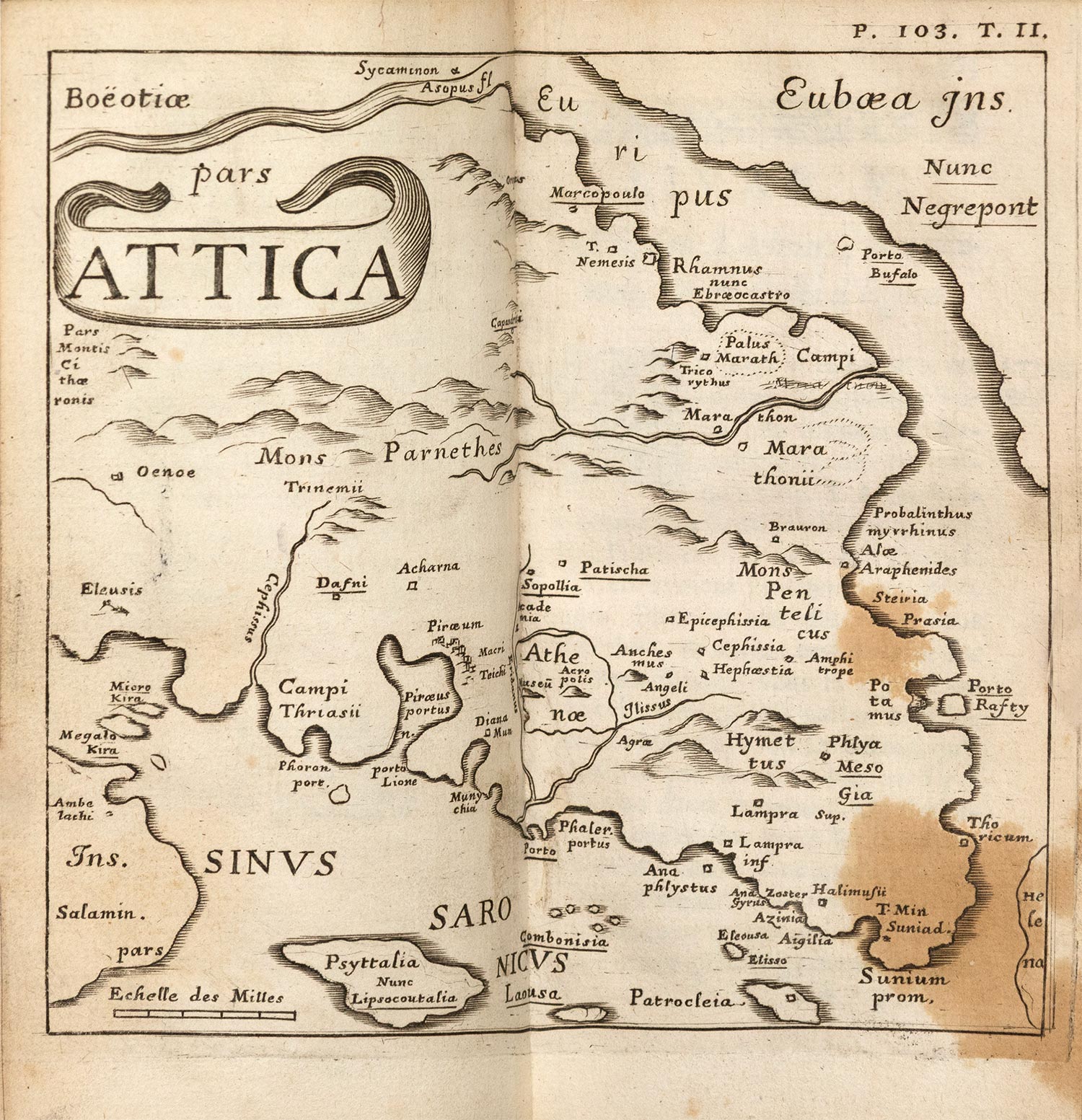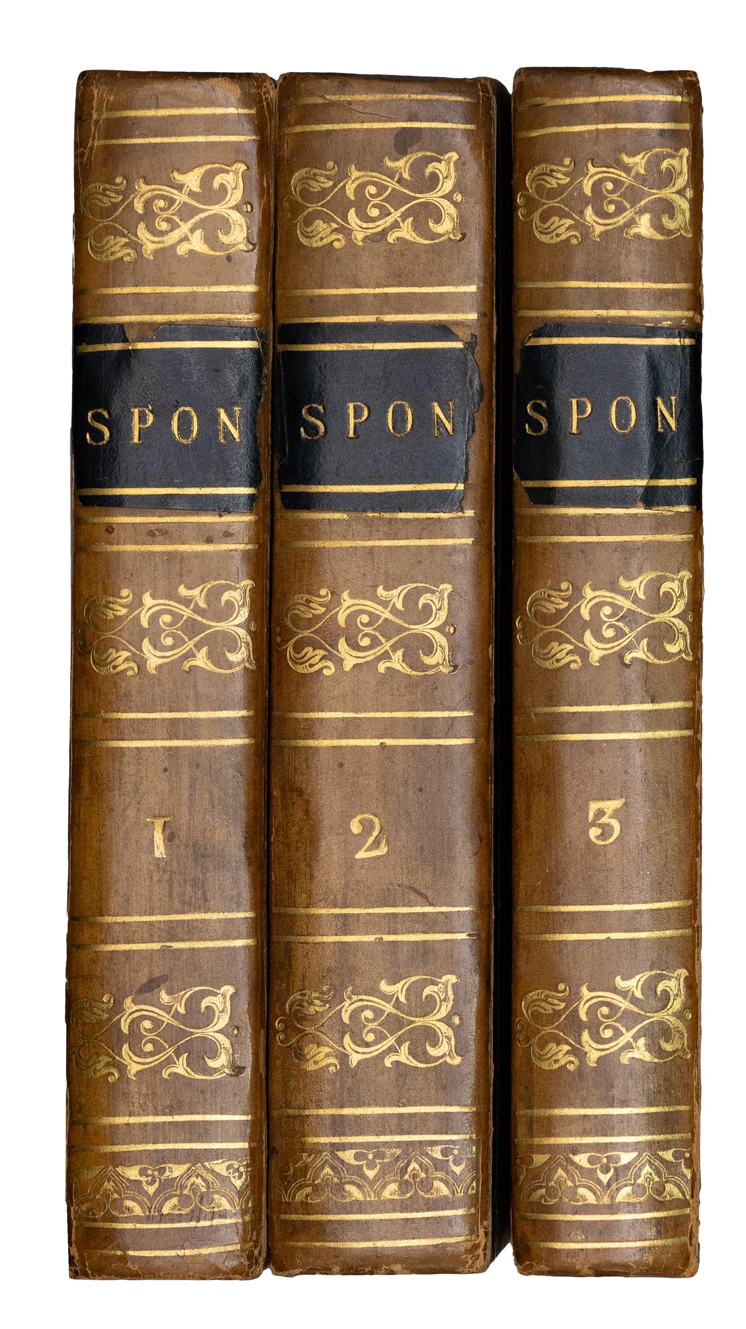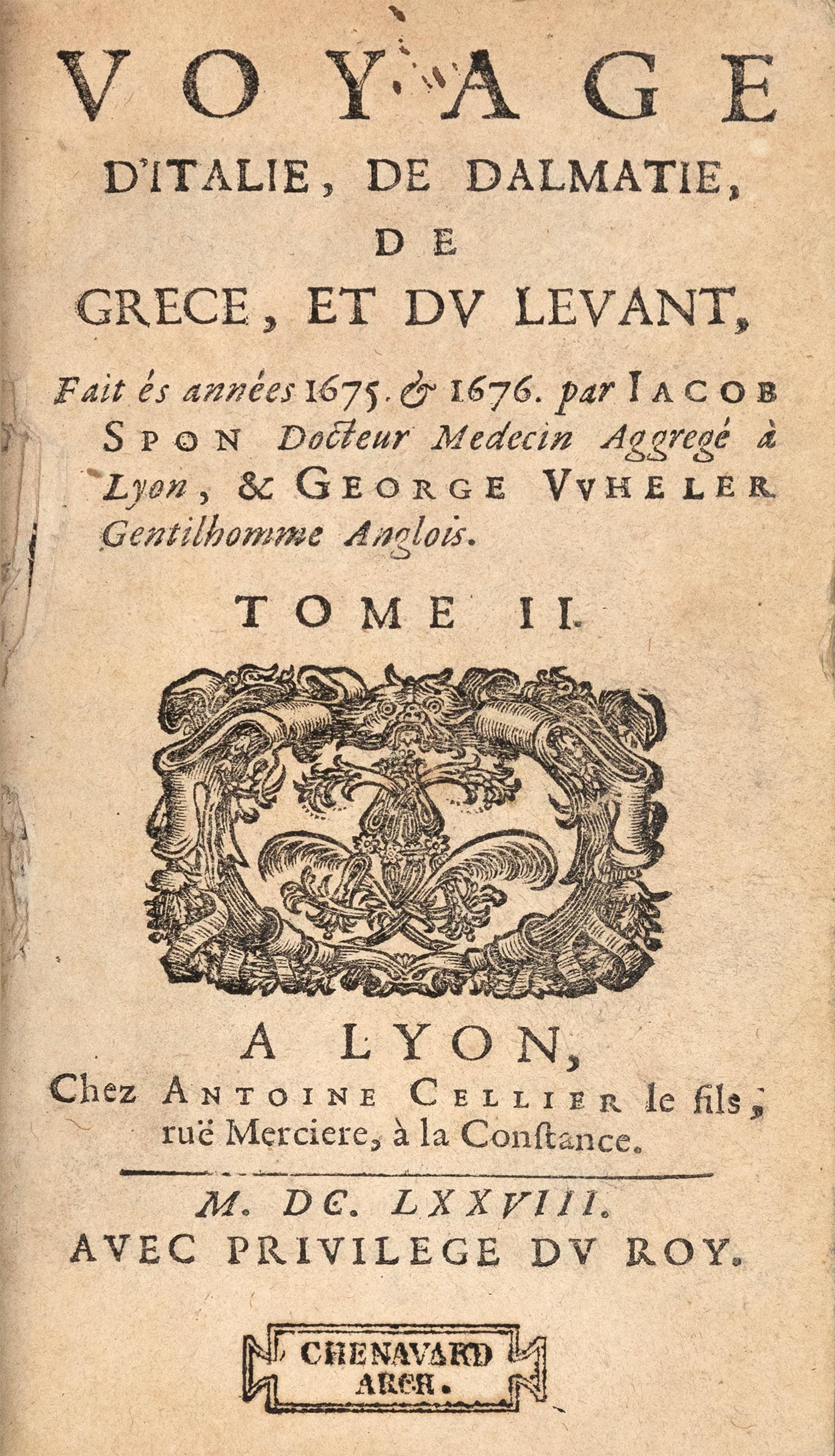 ΠΡΩΤΗ ΕΚΔΟΣΗ (οι τ. Β΄ και Γ΄). 12ο, 367, 417 και 204 + 226 (=228) σ. (ελαφρά οξειδωμένο αντίτυπο, σημειώσεις με μολύβι στον Α΄ τόμο, μικρές φθορές στο εσωτερικό περιθώριο των τριών πρώτων φύλλων του Β΄ τόμου). Χαλκόγραφη προμετωπίδα (του εκδότη) και χαλκόγραφη βινιέτα στον τίτλο του Α΄ τόμου, 37 χαλκόγραφοι πίνακες (μεταξύ των οποίων ένα πορτραίτο του J. Spon στον Α΄ τόμο, από τους υπόλοιπους 7 αναδιπλούμενοι και 6 δισέλιδοι), 2 χαλκογραφίες και μία ολοσέλιδη ξυλογραφία εντός κειμένου. Μεταγενέστερη δερμάτινη ράχη με χρυσή διακόσμηση (μαρμαρογραφημένα τα ακρόφυλλα, ex-libris Α. Δ. Χατζηδήμου, κτητορική σφραγίδα του Antoine-Marie Chenavard: «CHENAVARD / ARCH.»). Weber, II, 405, πρβ. Blackmer 1586, Atabey 1170 (η δεύτερη έκδοση). (3) • O Γάλλος ιατρός και αρχαιολογός Jacob Spon (1647-1685) και ο Άγγλος ευγενής Sir George Wheler (1651-1723) ταξίδεψαν μαζί στην Ελλάδα και την Ανατολική Μεσόγειο κατά τα έτη 1675 και 1676 επισκεπτόμενοι κυρίως τις ελληνικές αρχαιότητες. Ο Β΄ τόμος του έργου είναι εξολοκλήρου αφιερωμένος στην Ελλάδα, ενώ σύμφωνα με τη βιβλιογραφία, στην παρούσα έκδοση συναντάμε την πρώτη συστηματική, λεπτομερή και αξιόπιστη περιγραφή της Αθήνας. • ΠΟΛΥ ΣΠΑΝΙΟ.