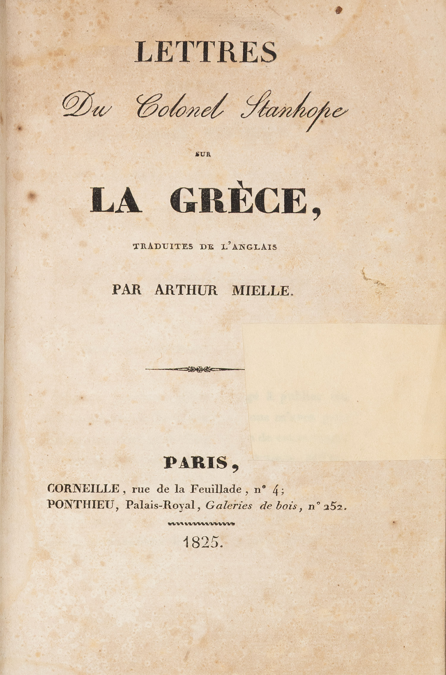 8ο (196 x 125 mm.), 287 σ. (οξειδωμένο αντίτυπο, κομμένο τμήμα από τον τίτλο και από ένα ακόμη φύλλο: σ. 151-2, με απώλεια πέντε γραμμών, σφραγίδα σε ένα άλλο). Droulia 1143.