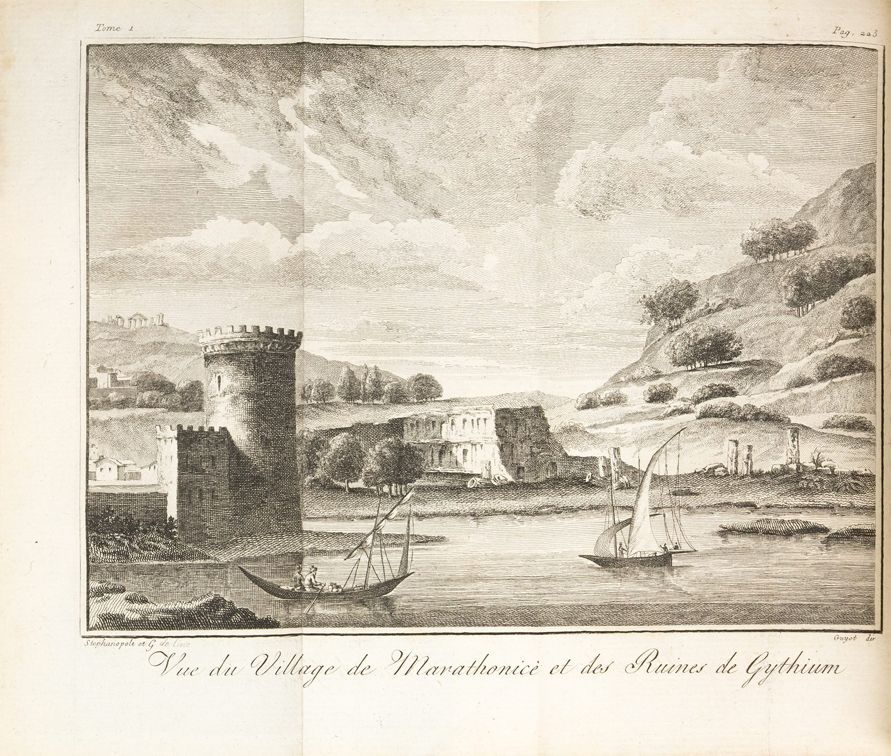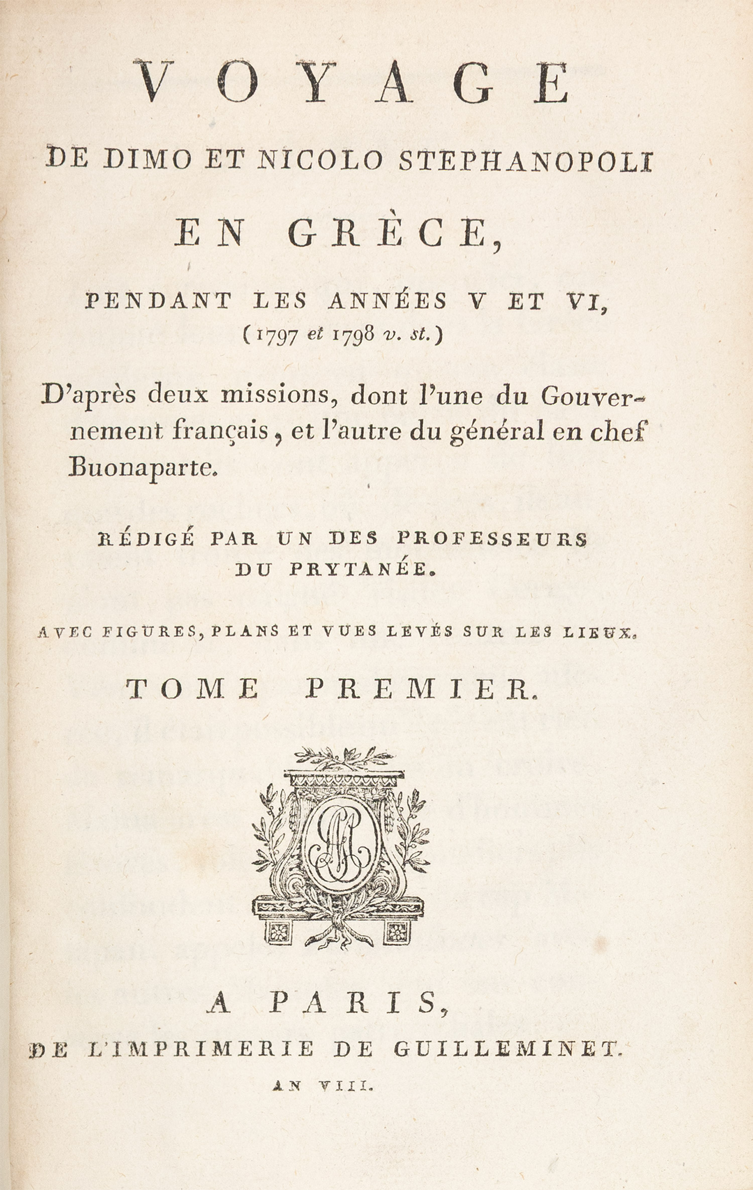 ΠΡΩΤΗ ΕΚΔΟΣΗ, δεύτερη μορφή. 2 τόμοι, 8ο (197 x 127 mm.), xvj + 303 και 319 σ. (περιστασιακά στίγματα οξείδωσης). Με 8 χαλκογραφίες (2 αναδιπλούμενες). Δέρμα της εποχής της έκδοσης (μικρές φθορές, χρυσή διακόσμηση στη ράχη, διάστικτες οι ακμές, ex-libris Α. Δ. Χατζηδήμου). Blackmer 1606, Legrand & Pernot 581. (2)