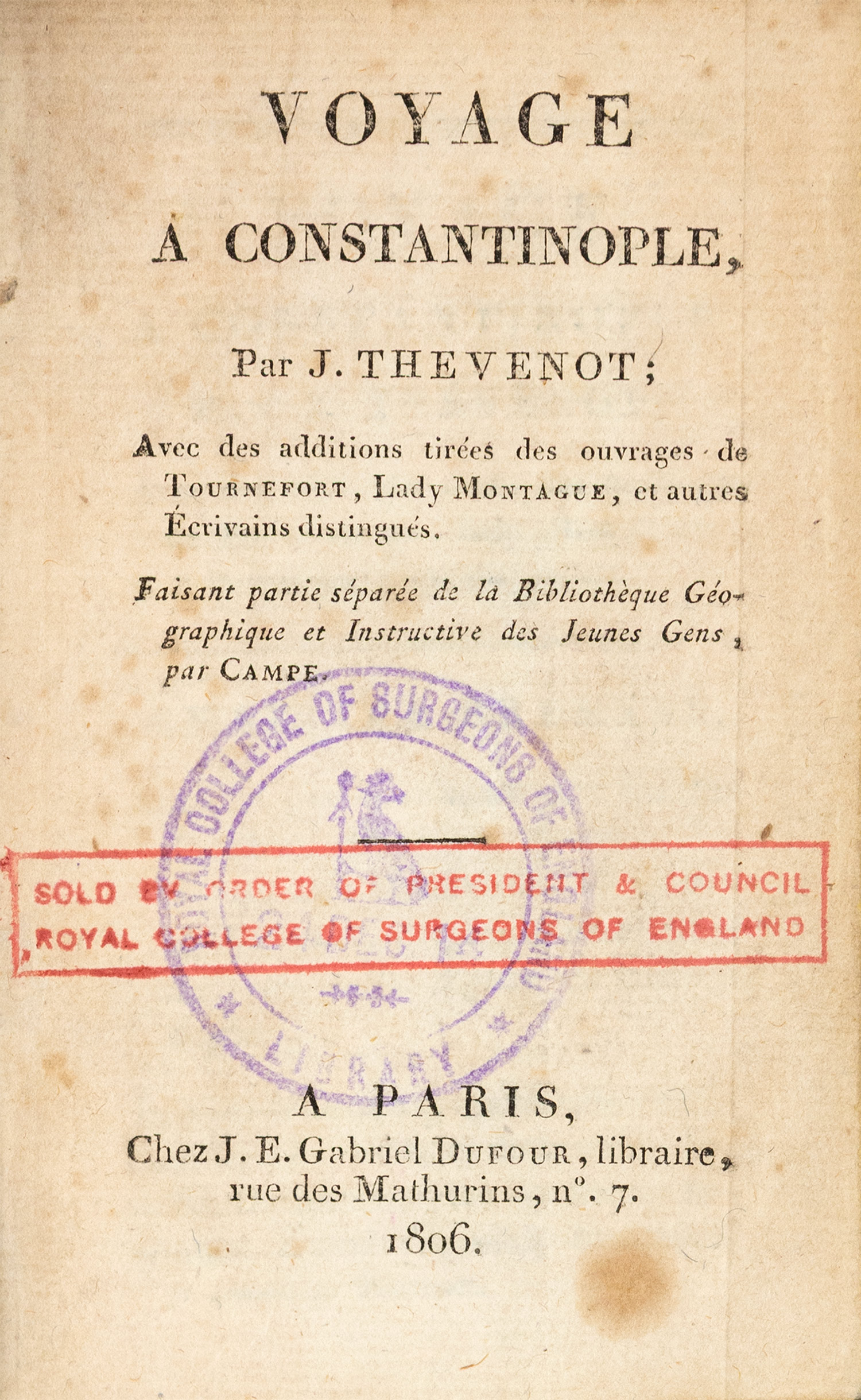 12o (128 x 83 mm.), 209 σ. (οξείδωση σε μερικά φύλλα, δύο σφραγίδες στον τίτλο και άλλη μία στο recto της προμετωπίδας). Χαλκόγραφη προμετωπίδα. Μεταγενέστερα χαρτόνια (μικρές φθορές, κίτρινες οι ακμές, ex-libris Α. Δ. Χατζηδήμου). • Στις σ. 65-209 περιλαμβάνεται το έργο Voyage de Robert Townson, en Hongrie, dans les années 1793 et 1794.
