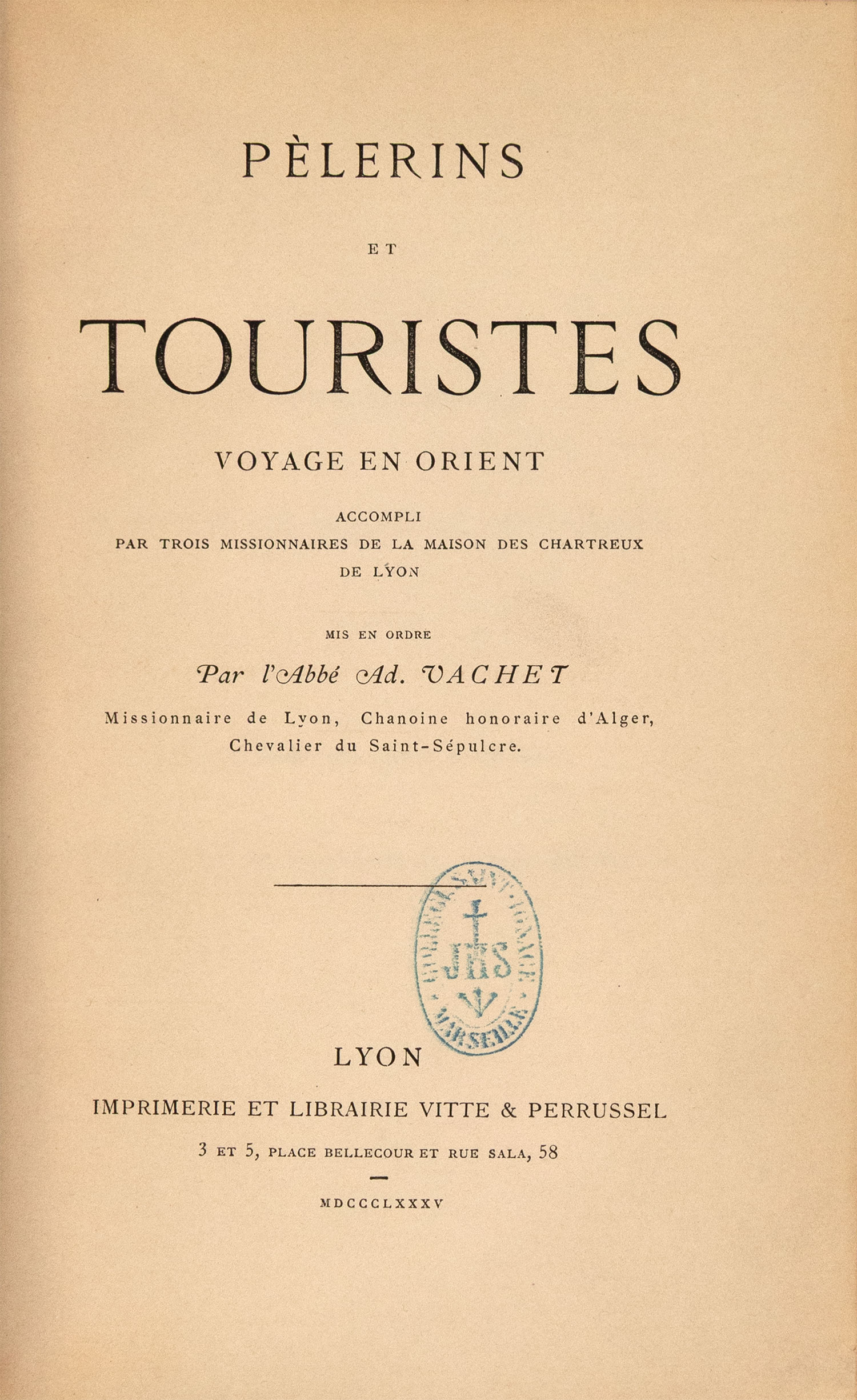 2 τόμοι δεμένοι σε έναν, 8ο (215 x 140 mm.), 392 και 392 σ. (σφραγίδα σε λίγα φύλλα). Με ένα τύπωμα αλμπουμίνας μεταξύ των σ. 154 και 155 του Β΄ τόμου («Mont Carmel. Couvent et Hospice»), το οποίο κατά πάσα πιθανότητα δεν ανήκει στην έκδοση. Μεταγενέστερη δερμάτινη ράχη (μικρές φθορές, μαρμαρογραφημένα τα καλύμματα, ex-libris Α. Δ. Χατζηδήμου).