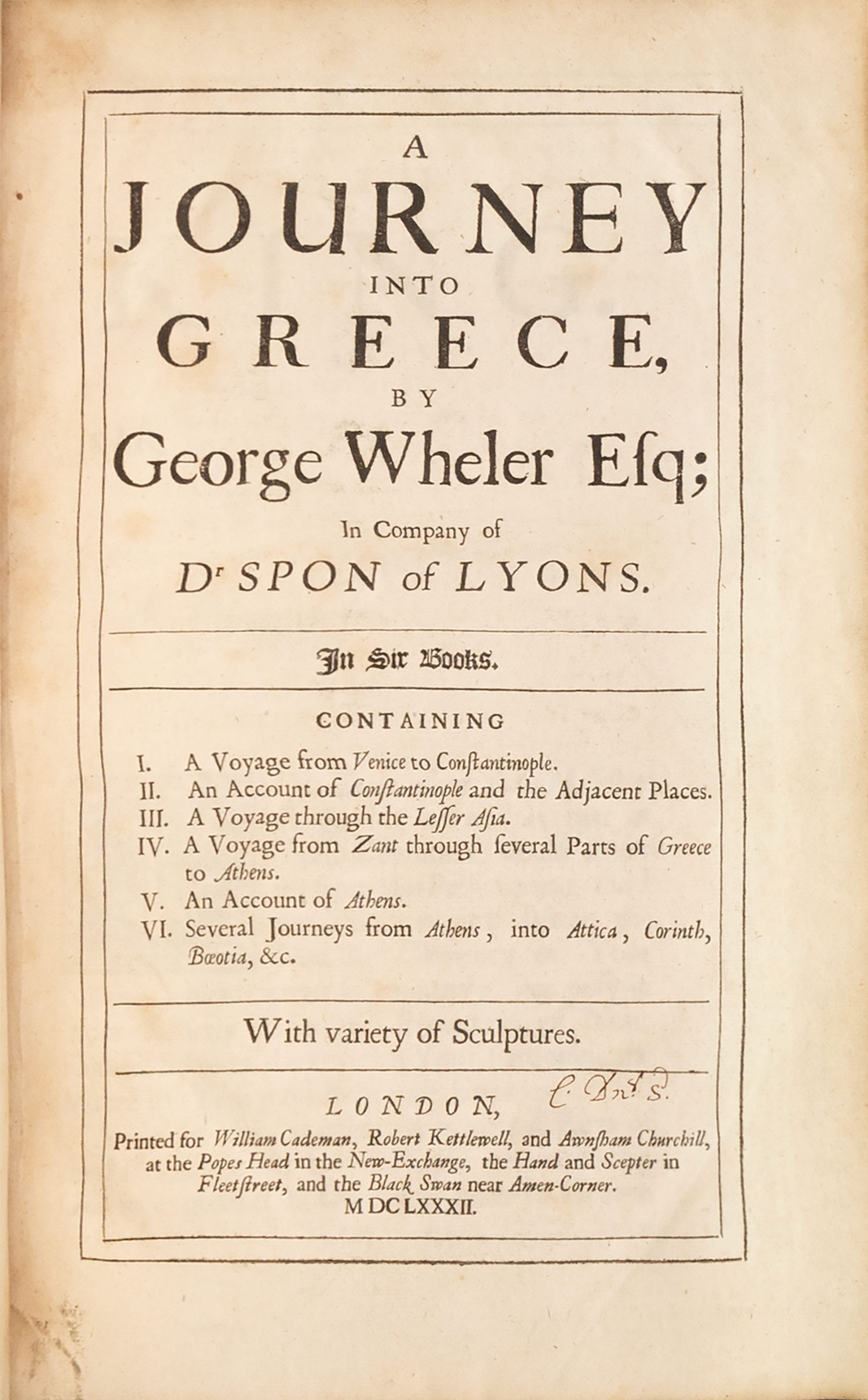 A journey into Greece, in company of Dr Spon of Lyons. In six books. Containing I. A voyage from Venice to Constantinople. II. An account of Constantinople and the adjacent places. III. A voyage through the Lesser Asia. IV. A voyage from Zant through several parts of Greece to Athens. V. An account of Athens. VI. Several journeys from Athens, into Attica, Corinth, Boeotia, &c. With variety of sculptures.
