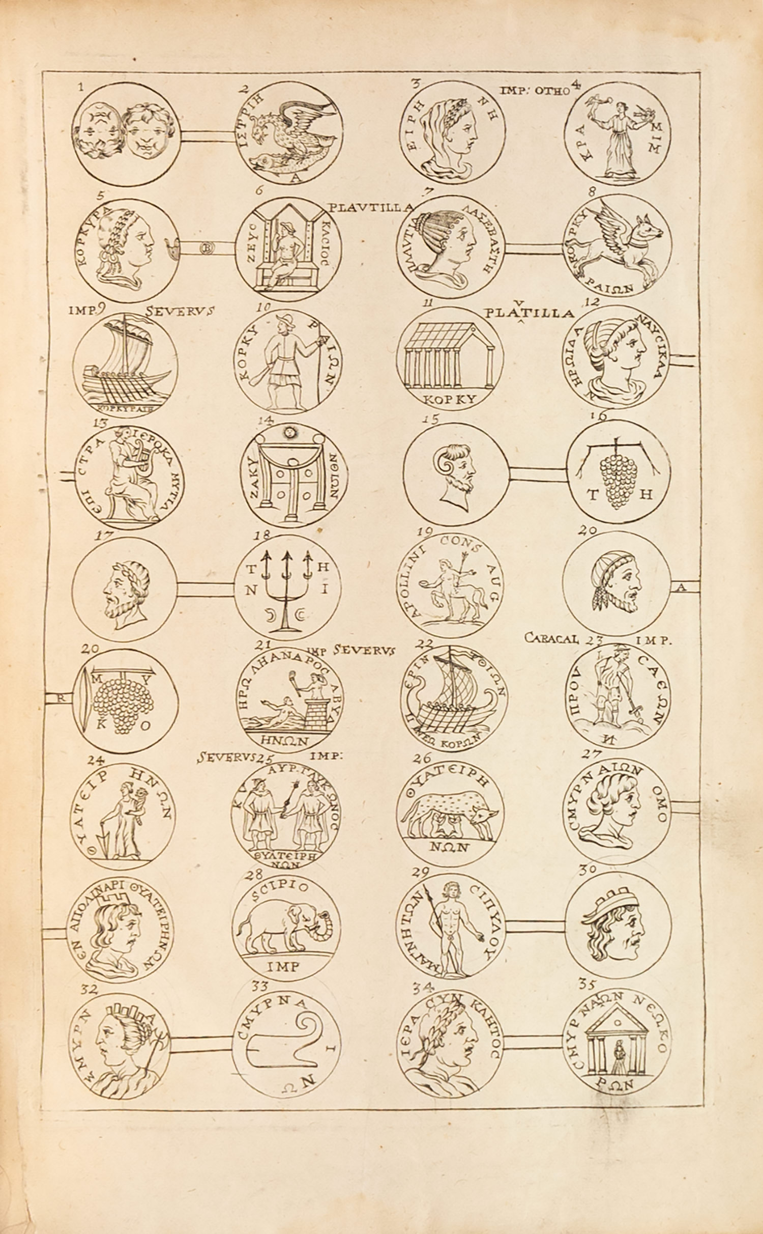 ΠΡΩΤΗ ΕΚΔΟΣΗ. folio (305 x 195 mm.), 483 σ. (ελαφρά οξειδωμένο αντίτυπο, εντονότερη οξείδωση σε μερικά φύλλα). Με έναν αναδιπλούμενο χαλκόγραφο χάρτη, 4 χαλκόγραφους πίνακες με αρχαία νομίσματα, 3 μικρούς χαλκόγραφους πίνακες, και 84 χαλκογραφίες εντός κειμένου. Δερμάτινη ράχη της εποχής έκδοσης (τα καλύμματα επενδυμένα με μεταγενέστερο δέρμα, μικρές φθορές, λείπει μικρό τμήμα από την κορυφή της ράχης, ένα μικρό σχίσιμο στην κορυφή των ενώσεων, χρυσή διακόσμηση στη ράχη, εμπίεστη στα καλύμματα, ex-libris Α. Δ. Χατζηδήμου). Blackmer 1786, Atabey 1328.