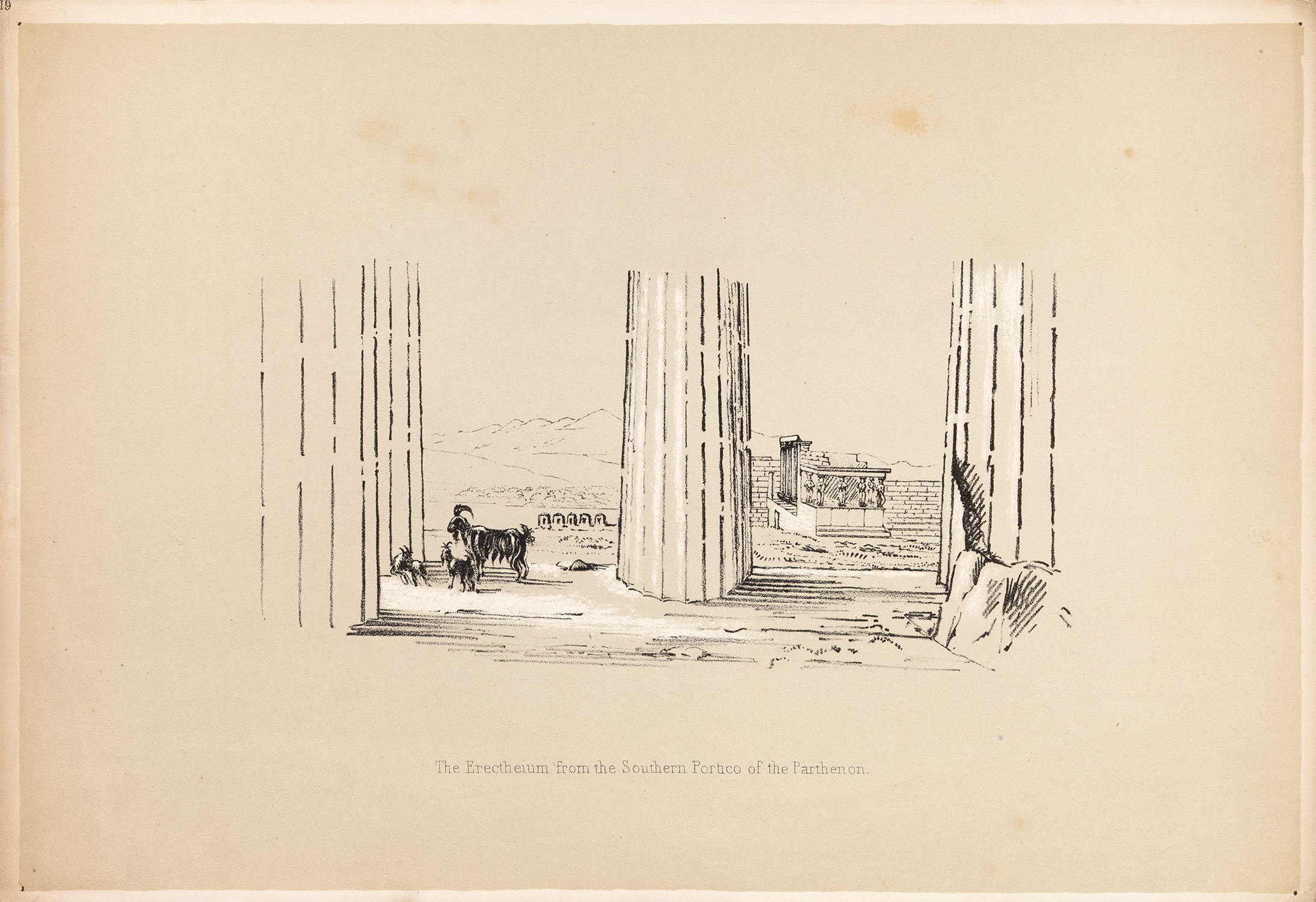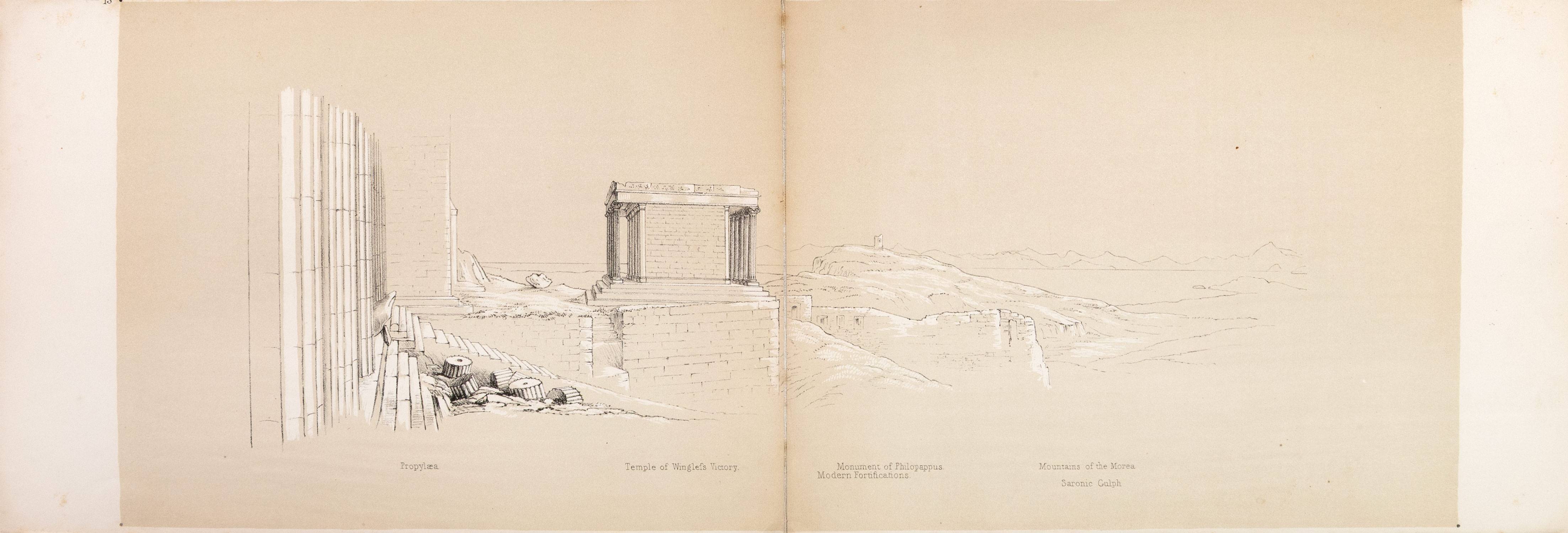 ΠΡΩΤΗ ΕΚΔΟΣΗ. Τεύχος με επεξηγηματικά κείμενα, 4ο (263 x 185 mm.), xi + 35 σ. Αρχικά τυπωμένα εξώφυλλα (λείπει μικρό τμήμα από την πάνω εξωτερική γωνία του κάτω εξωφύλλου, φθορές στη ράχη, λίγα στίγματα οξείδωσης, ex-libris Α. Δ. Χατζηδήμου). Με 2 λιθόγραφους χάρτες και 23 λυτές λιθογραφίες με τίντα (ανάμεσά τους 11 πανοράματα, επτά των 2 φύλλων, ένα των 3, ένα των 4, ένα των 6 και ένα των 8, όλα φοδραρισμένα με πανί) μέσα σε ξεχωριστό πάνινο περικάλυμμα (ελαφρά οξειδωμένες οι λιθογραφίες, έντονη οξείδωση σε δύο). Αρχική πάνινη θήκη (μικρές φθορές). Blackmer 1792, Weber, I, 1158 («according to the prospectus, only 67 copies were printed»).