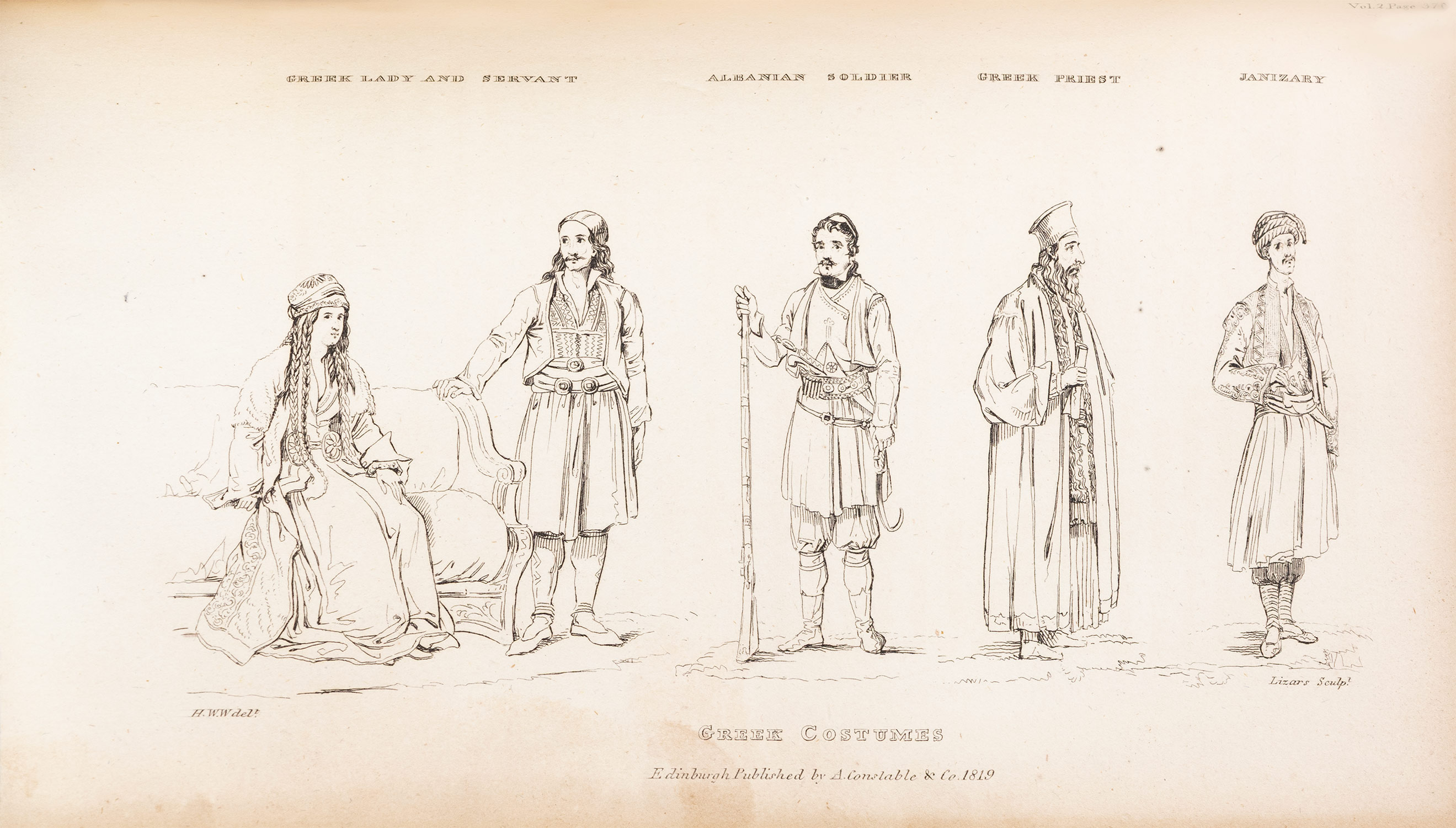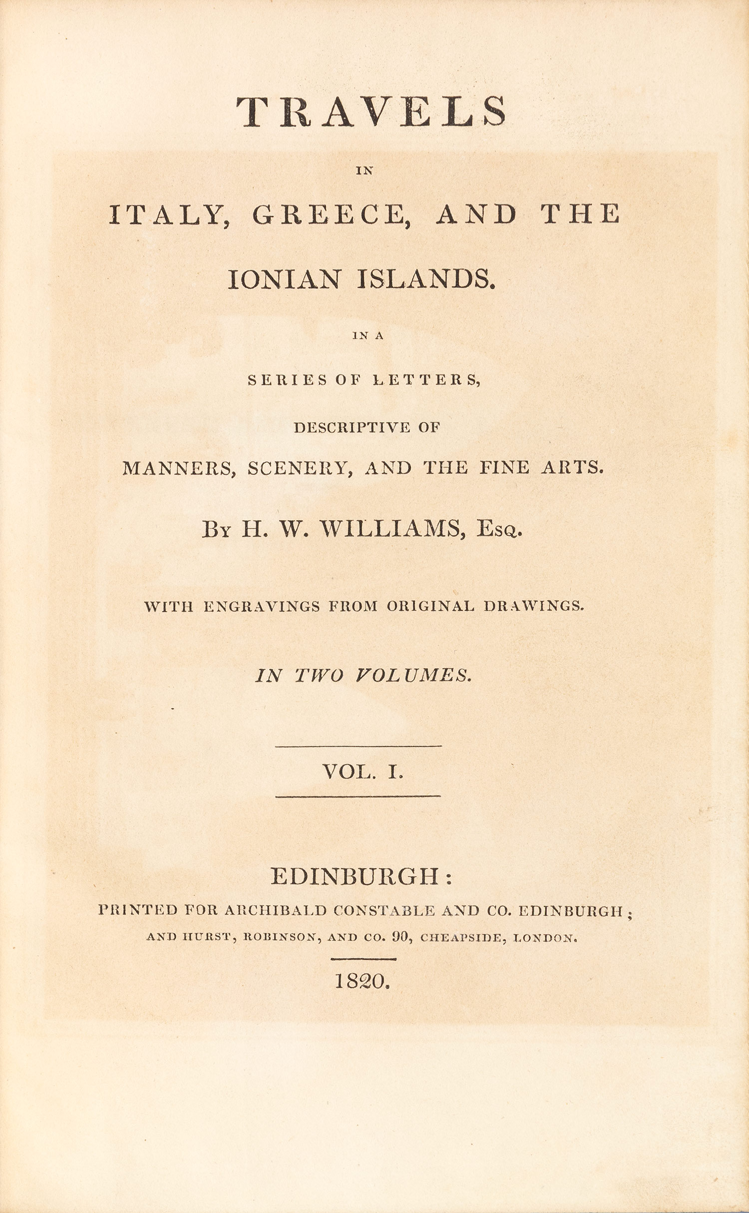 ΠΡΩΤΗ ΕΚΔΟΣΗ. 2 τόμοι, 8ο (216 x 130 mm.), xxii + 399 και xiv + 437 σ. (λείπουν δύο χαλκογραφίες: «Fire at Pietra Mala» και «Grecian Melodies», οι ψευδότιτλοι και δύο ακόμη φύλλα: σ. 73-4 στον Α΄ τόμο και φύλλο με τη μορφή ψευδότιτλου στον Β΄, αχνό αποτύπωμα των χαλκογραφιών στα αντικρινά φύλλα). Με 17 χαλκογραφίες (2 αναδιπλούμενες). Δέρμα της εποχής της έκδοσης (μικρές φθορές, χρυσή διακόσμηση στη ράχη, μαρμαρογραφημένα τα ακρόφυλλα και οι ακμές, ex-libris Α. Δ. Χατζηδήμου). Contominas 797, Weber, I, 98. (2)