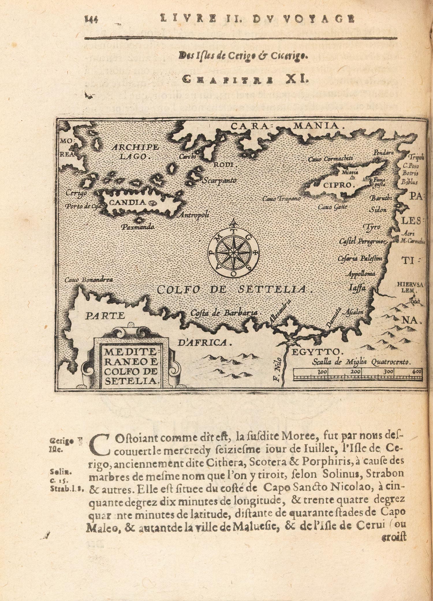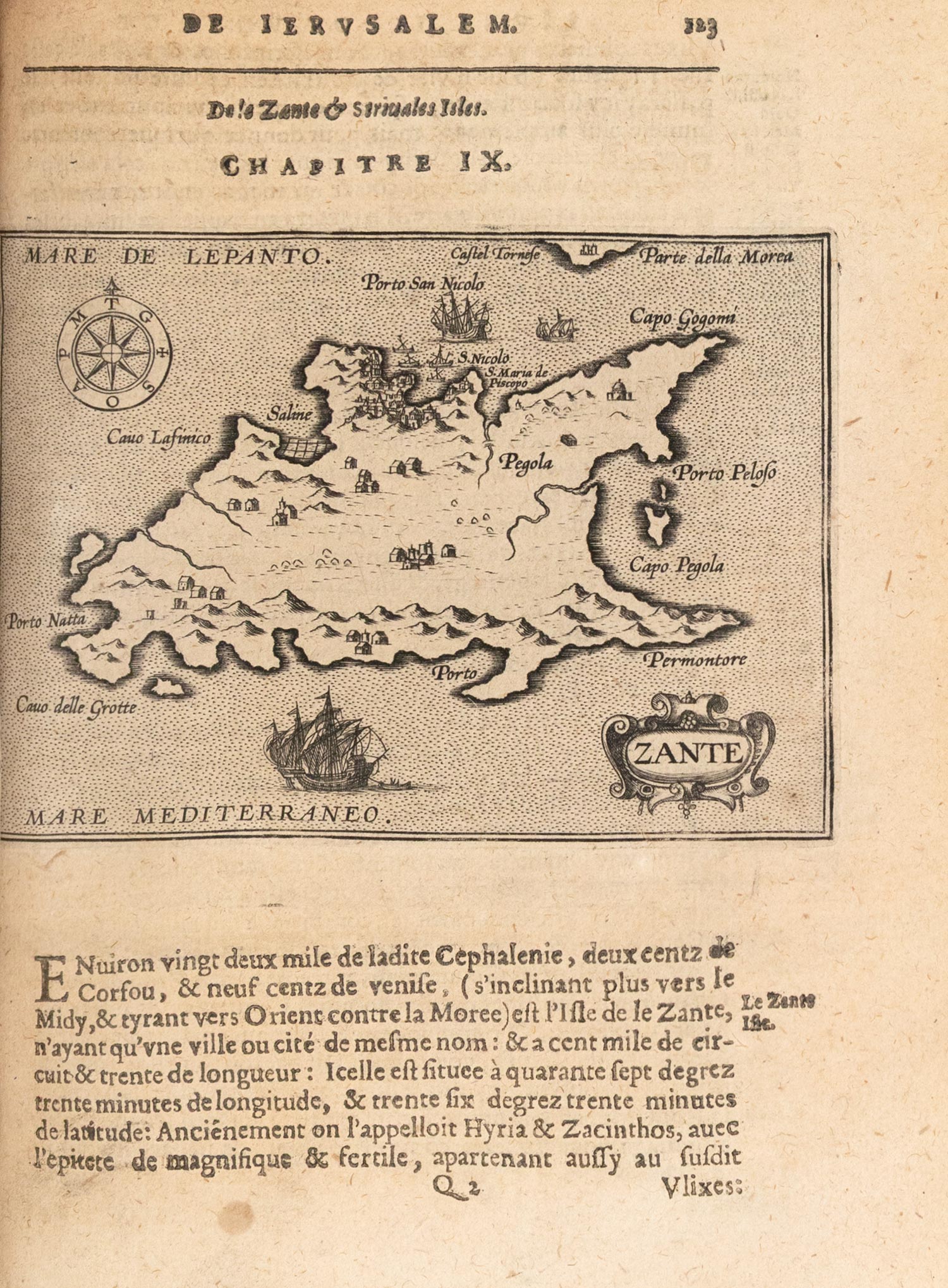 4ο (194 x 144 mm.), 191 + 235 + 230 σ. (ήπια ομοιόμορφη οξείδωση σε μερικά φύλλα). Με 50 χαλκογραφίες εντός κειμένου (2 ολοσέλιδες, 6 χάρτες: «Colpho con l’Italia», «Venetia», «Zante», «Mediteraneo e colfo di Setelia», «Candia» και «Cipro»). Μεταγενέστερη δερμάτινη ράχη (μικρές φθορές, ex-libris Α. Δ. Χατζηδήμου). Blackmer 1874, Ioannou σ. 571, Weber, II, 208, Brunet, V, στ. 1543, Zacharakis 3741-5.