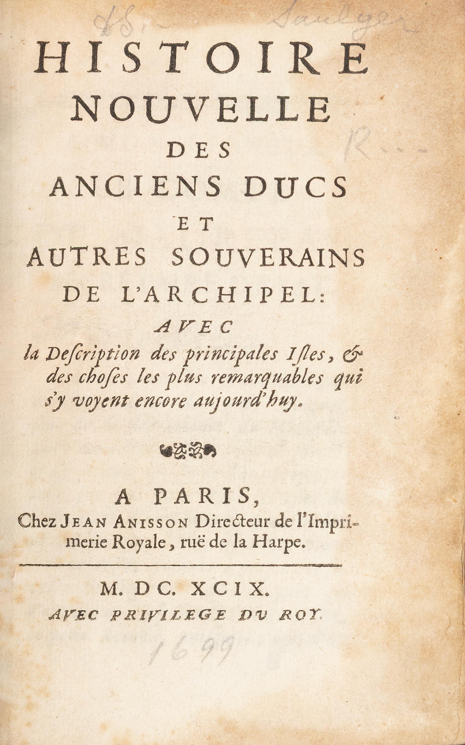Histoire nouvelle des anciens ducs et autres souverains de l΄Archipel: avec la description des principales isles, & des choses les plus remarquables qui s’y voyent encore aujourd’huy.
