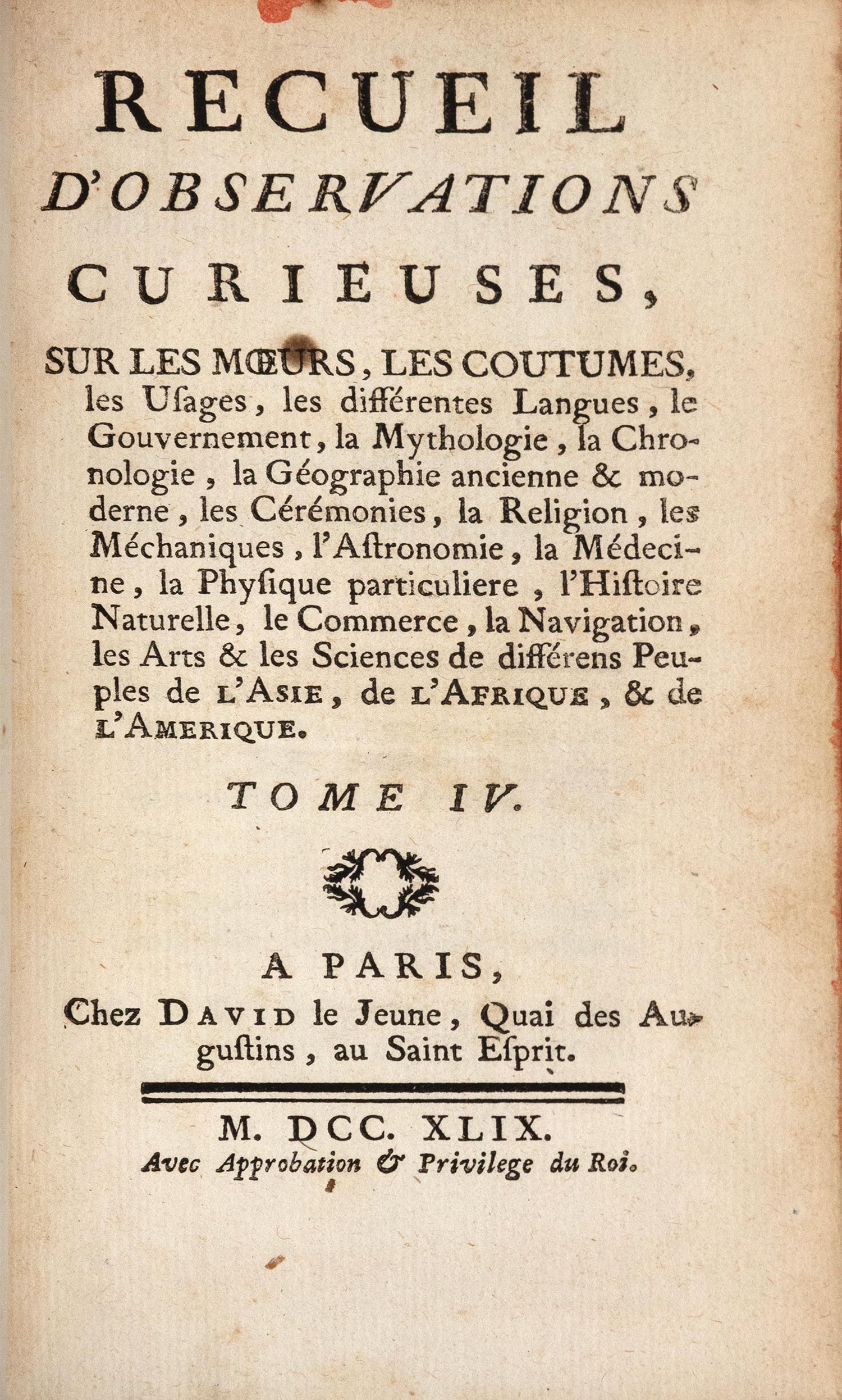 Recueil d’observations curieuses, sur les mœurs, les coutumes, les usages, les différentes langues, le gouvernement, la mythologie, la chronologie, la géographie ancienne et moderne, les cérémonies, la religion, les méchaniques, l’astronomie, la Médecine, […], les arts et les sciences de différens peuples de l’Asie, de l’Afrique, & de l’Amerique, tome IV (από τους 4).